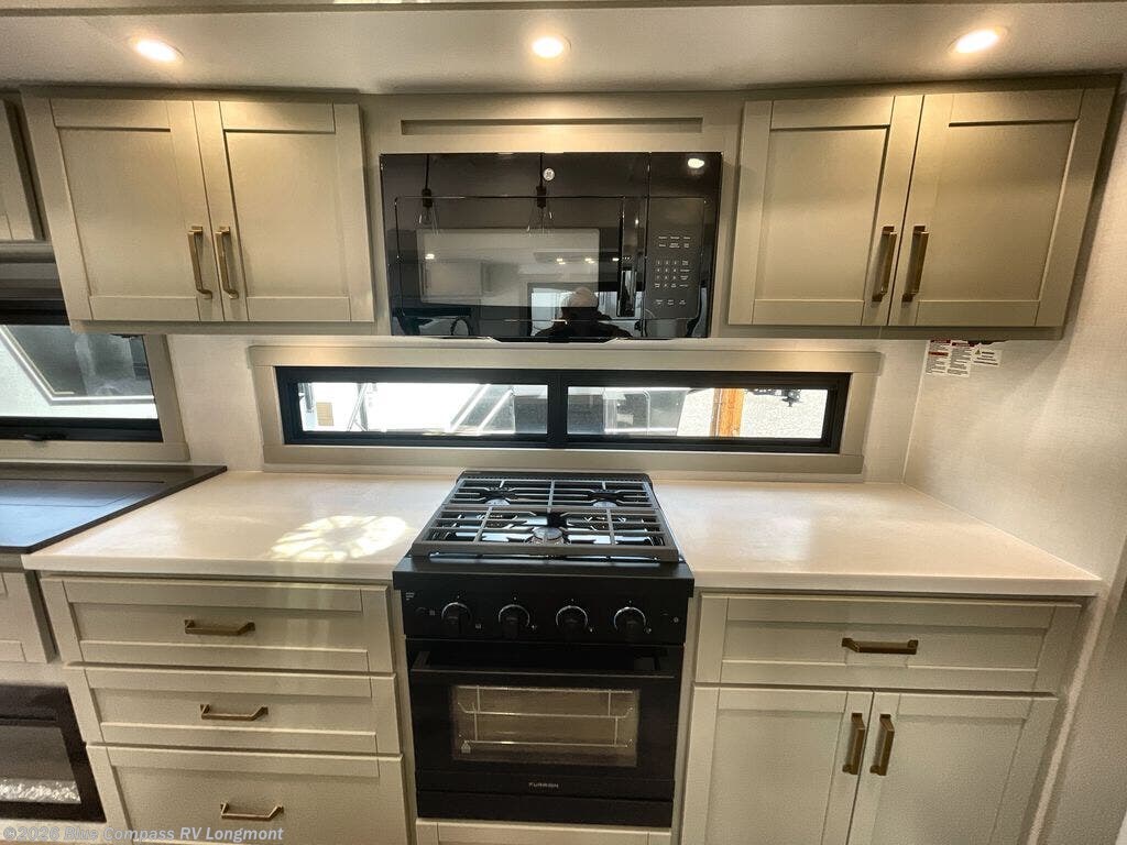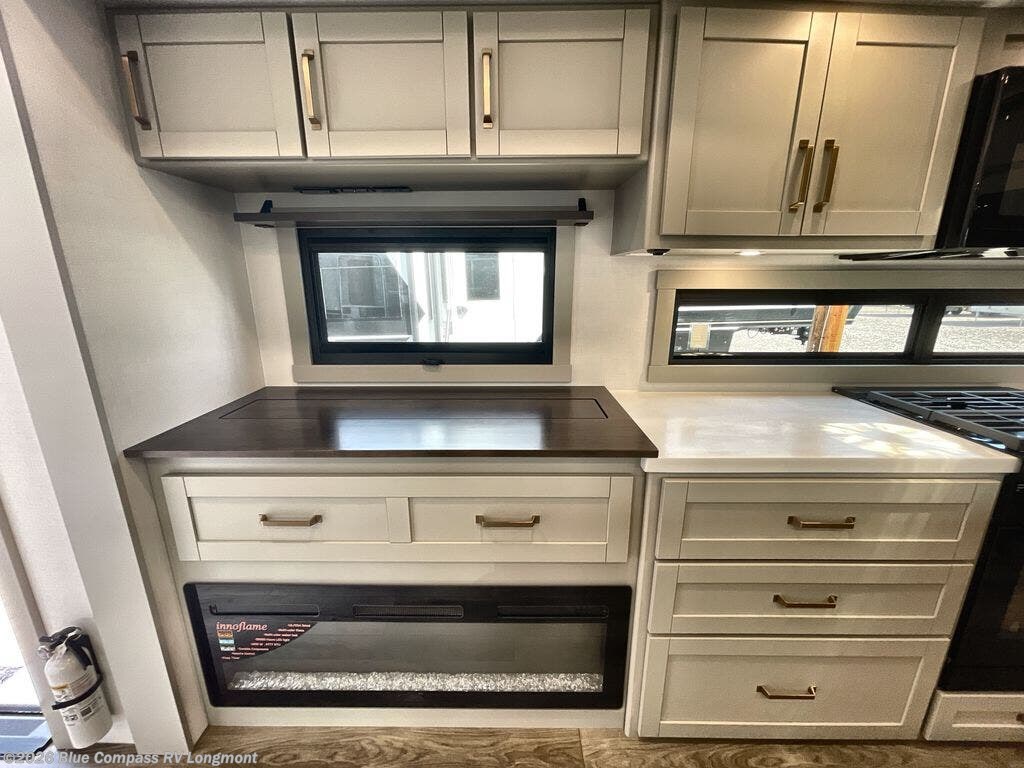 You're going to love every minute spent in this triple slide out fifth wheel! Once you arrive at the campground, you can put out the two side awnings, set up the rear patio and awning, then make lunch on the outdoor kitchen! There is also an outdoor TV here, a bar sink, and a refrigerator to keep drinks close by! Inside, the chef will find everything they need if the weather isn't cooperating, including a 30" residential microwave, 16 cu. ft. refrigerator, plus a large kitchen island, complete with dual trash bins and dog bowls at the foot. Your crew can get cozy on the tri-fold sofa that extends to a 54" x 70" bed for guests, and there is theater seating across from the televator and fireplace for easy viewing! You will find the front private bedroom ultra accommodating with its king bed slide out, sliding dresser top with hidden storage, your own TV, and a front wardrobe with shelves and a shoe rack. There is even washer and dryer prep if you want the option to make laundry day that much easier!