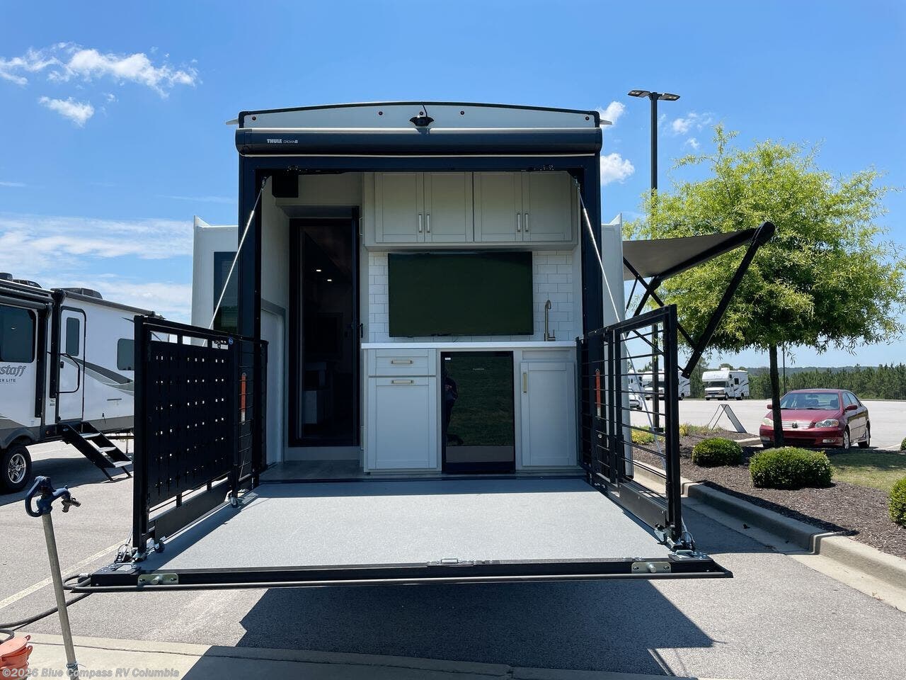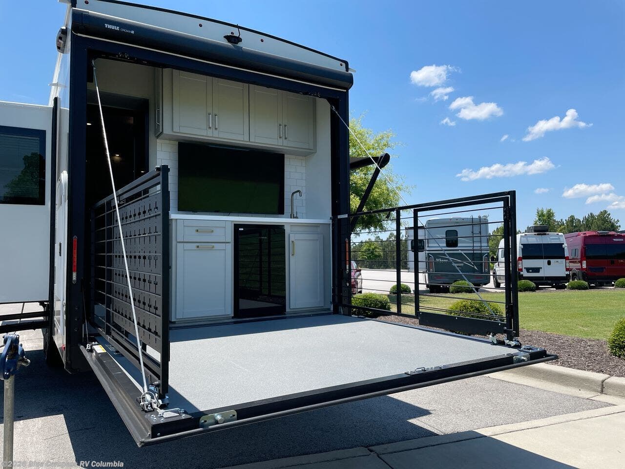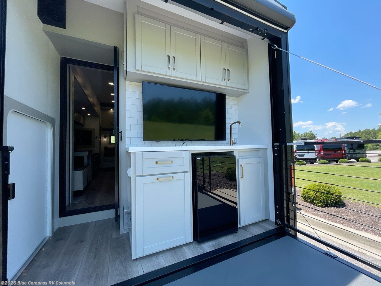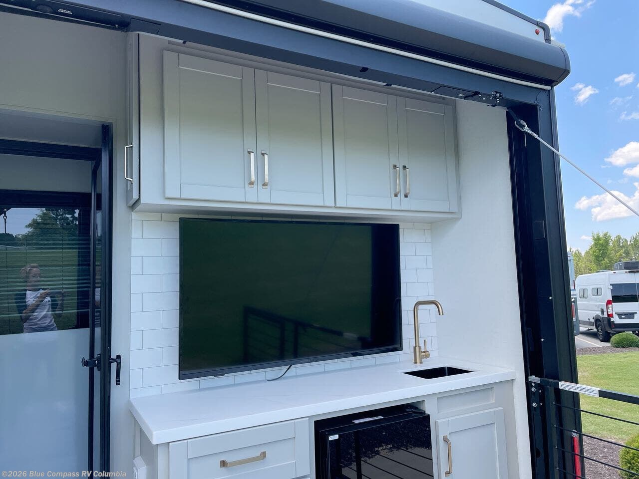 You're going to love every minute spent in this triple slide out fifth wheel! Once you arrive at the campground, you can put out the two side awnings, set up the rear patio and awning, then make lunch on the outdoor kitchen! There is also an outdoor TV here, a bar sink, and a refrigerator to keep drinks close by! Inside, the chef will find everything they need if the weather isn't cooperating, including a 30" residential microwave, 16 cu. ft. refrigerator, plus a large kitchen island, complete with dual trash bins and dog bowls at the foot. Your crew can get cozy on the tri-fold sofa that extends to a 54" x 70" bed for guests, and there is theater seating across from the televator and fireplace for easy viewing! You will find the front private bedroom ultra accommodating with its king bed slide out, sliding dresser top with hidden storage, your own TV, and a front wardrobe with shelves and a shoe rack. There is even washer and dryer prep if you want the option to make laundry day that much easier!