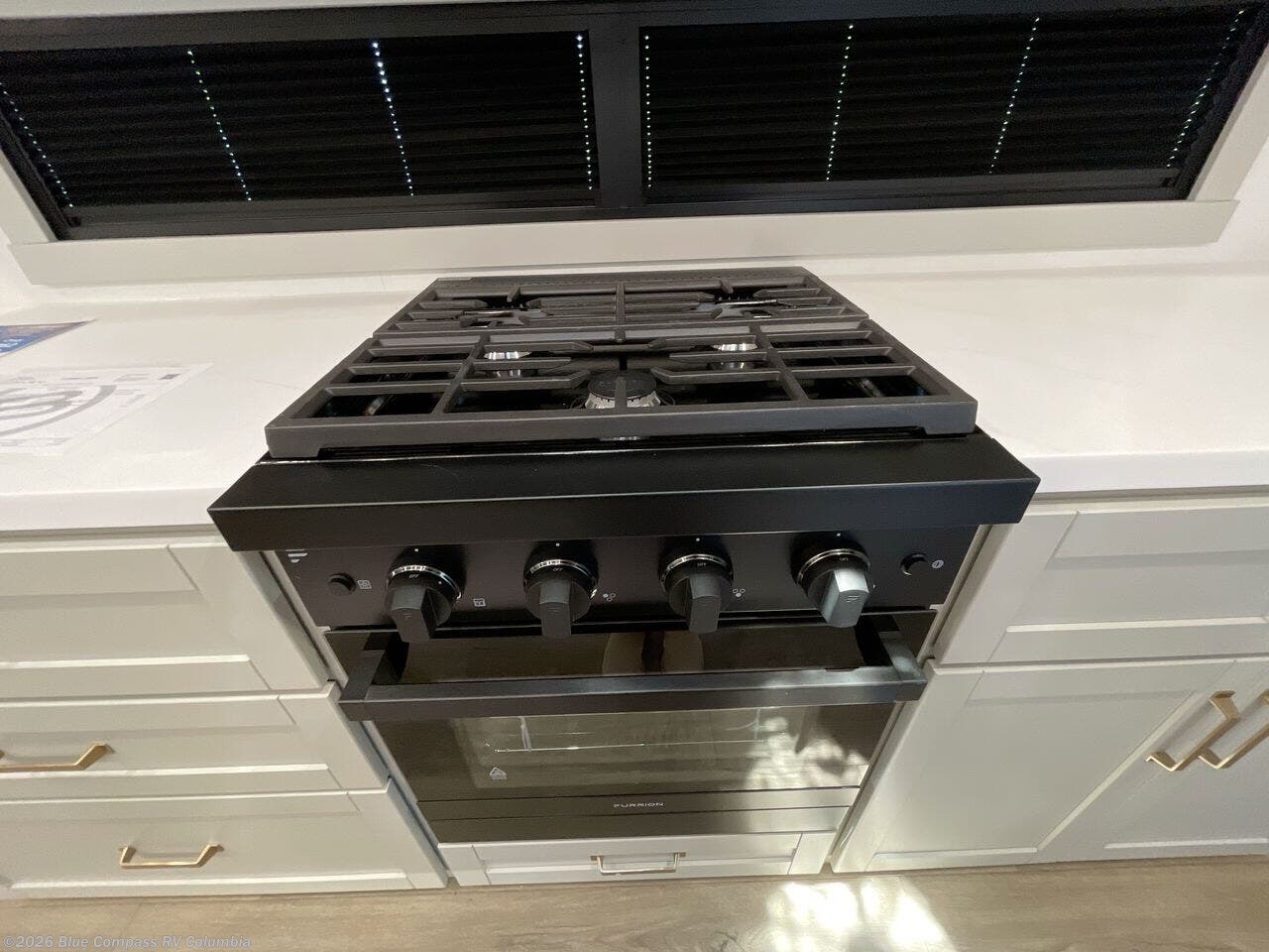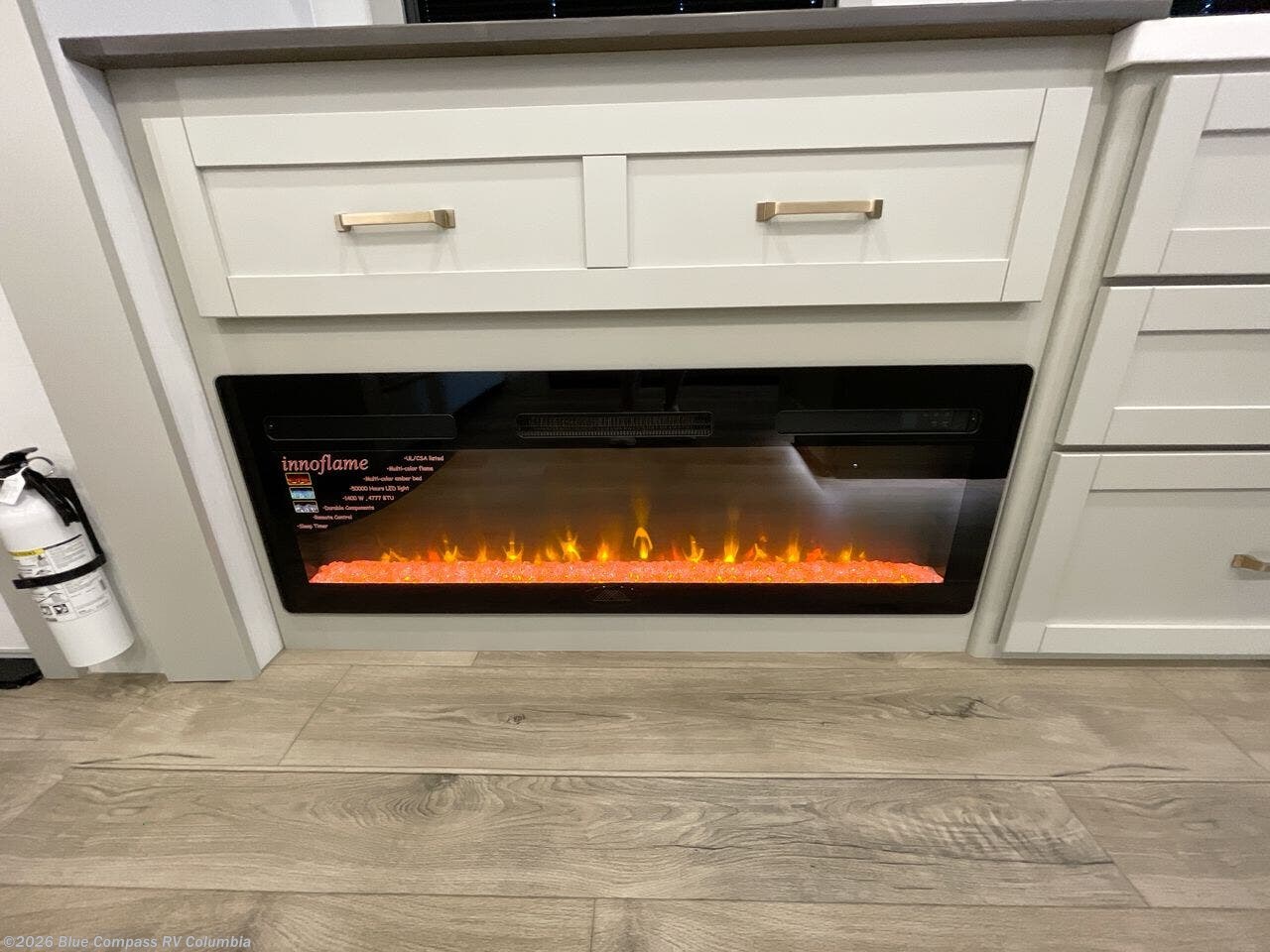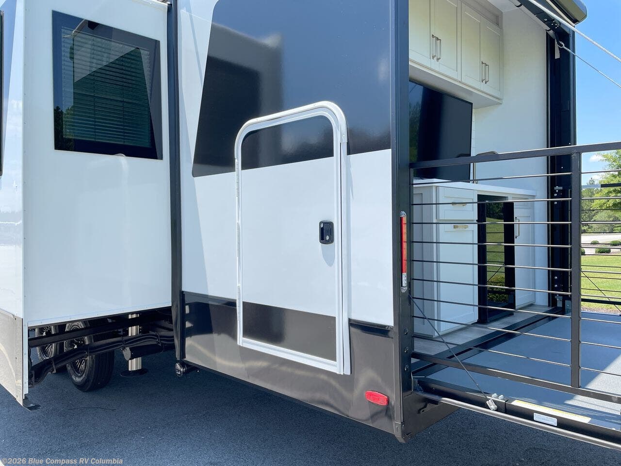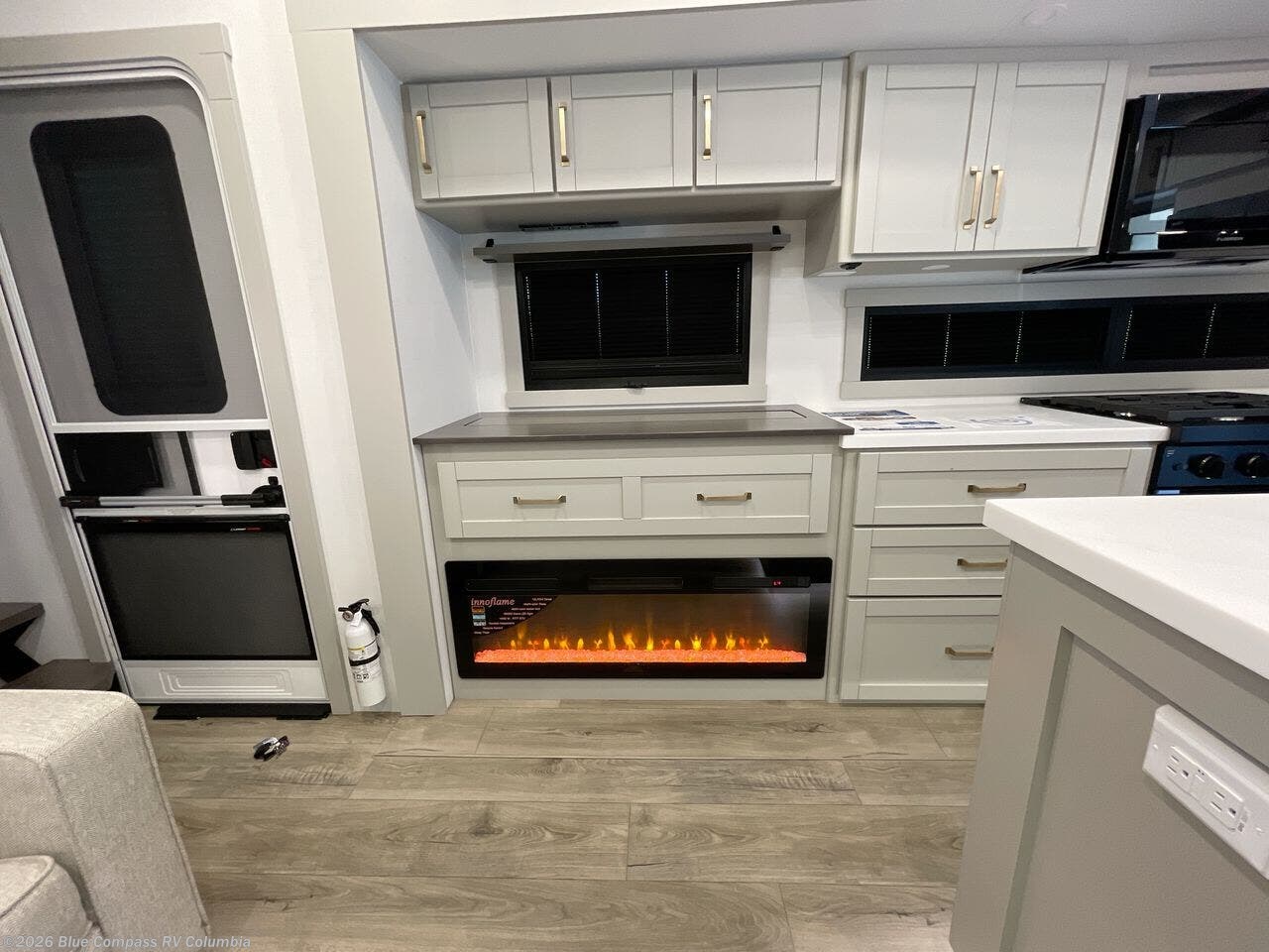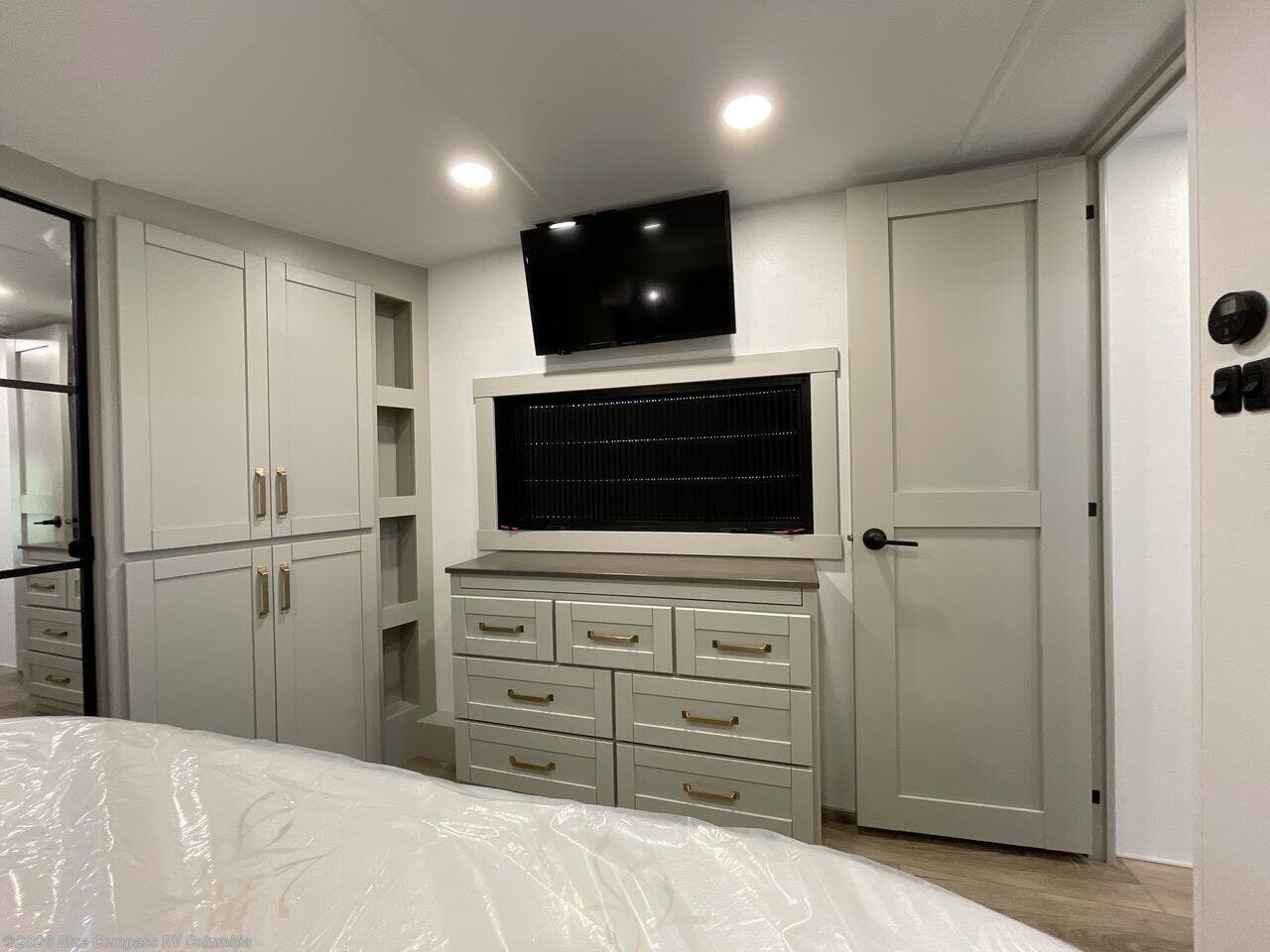 You're going to love every minute spent in this triple slide out fifth wheel! Once you arrive at the campground, you can put out the two side awnings, set up the rear patio and awning, then make lunch on the outdoor kitchen! There is also an outdoor TV here, a bar sink, and a refrigerator to keep drinks close by! Inside, the chef will find everything they need if the weather isn't cooperating, including a 30" residential microwave, 16 cu. ft. refrigerator, plus a large kitchen island, complete with dual trash bins and dog bowls at the foot. Your crew can get cozy on the tri-fold sofa that extends to a 54" x 70" bed for guests, and there is theater seating across from the televator and fireplace for easy viewing! You will find the front private bedroom ultra accommodating with its king bed slide out, sliding dresser top with hidden storage, your own TV, and a front wardrobe with shelves and a shoe rack. There is even washer and dryer prep if you want the option to make laundry day that much easier!