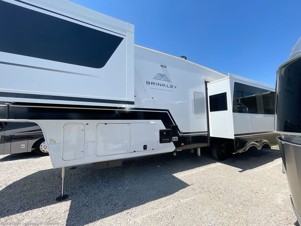 The Brinkley mid-profile Model Z fifth wheels bring you clean lines and an upscale look with plenty of style and exciting new features like the industry first brass plumbing connections. These units also feature an automotive grade front cap, plenty of exterior storage, exterior hot and cold showers, and wide stance leveling jacks for easy set up. Residential frameless windows provide a clean look and beautiful views, and ample electrical outlets and 6 USB/USB-C outlets allow all of your electronics and appliances to easily be used and charged.
