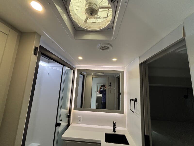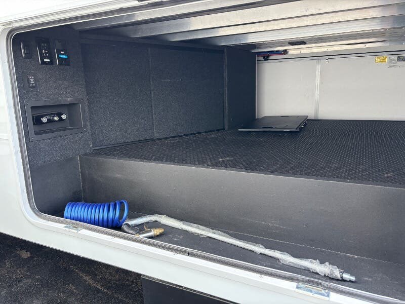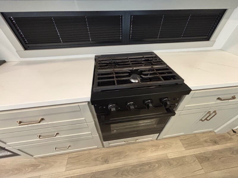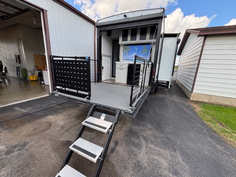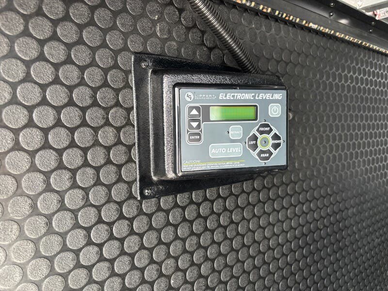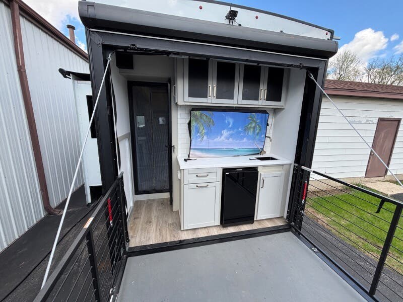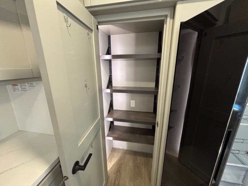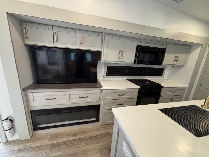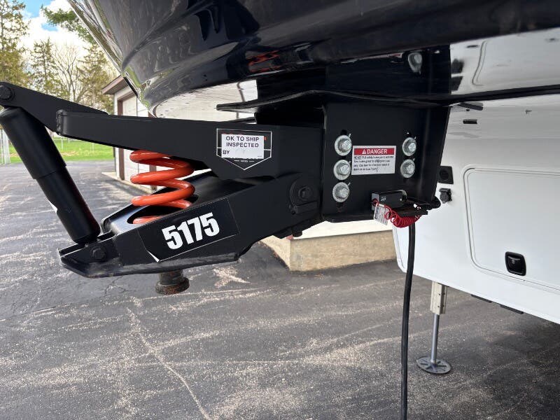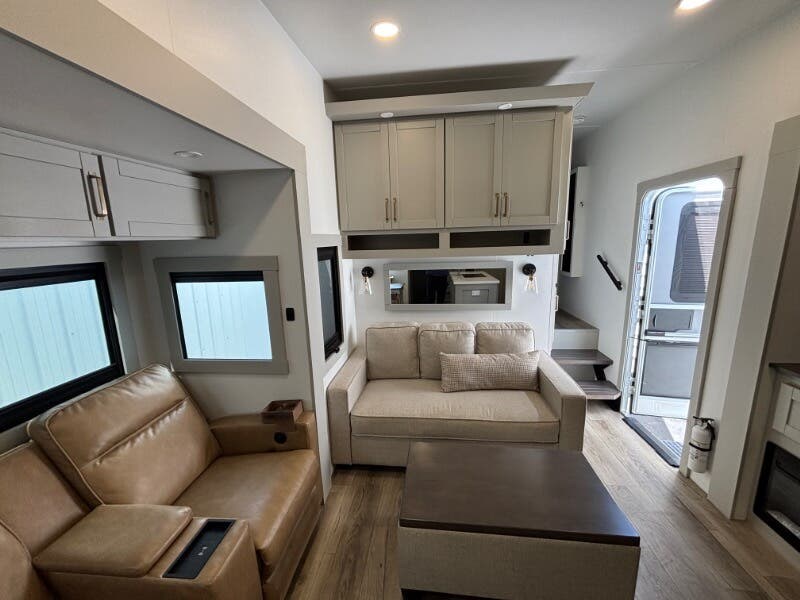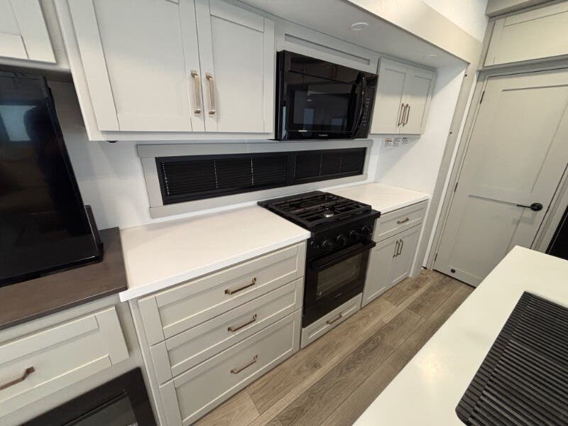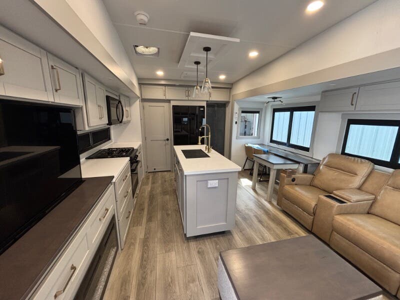 Features Include: Pet Security Tether, Keyless Entry, Entertainment Center, Tri-Fold Sofa (vbm), Separate Entry, Sofa Bed, Pullout Office Desk, Premium Cabinetry, 7-foot Tall Pantry, Soffit, Tile Backsplash, Systems Center, Smart-Command App, WiFi Booster, 50-inch Smart TV, King Bed 70x80 (vbm), Comforter, 5-Pillow Package, 32-inch Smart TV, Dresser Drawers, Head, Body, Handheld Sprayers, Shower Seat Prep, Porcelain Toilet, 5.5k Generator Prep, Two 30# LP Bottles, CURT Helux King Pin, Monotube Chassis, Heavy Duty Axles, 8000# Leaf Springs, ABS Brakes, H-Rated 16-Ply Tires