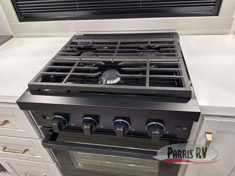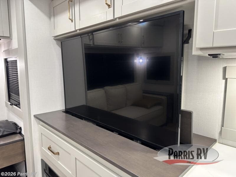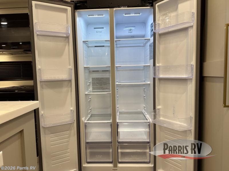 This unit is perfect for your family that needs sleeping space for eight! There is ample seating with a sliding desk/dining table, 62" theater seating, and a 72" tri-fold sofa along the rear wall. You can easily relax and enjoy the telescoping TV with a cozy fireplace below. The kitchen offers all that you need to prepare and cook meals just like home with a 16 cu. ft. refrigerator for your perishables, a 30" residential microwave oven, and three burner range top and oven. You will love the kitchen island all outfitted with pull-out pet bowls and double pull out trash bins with an integrated Stow & Go paper towel holder. There is also an 84" pantry with adjustable shelves for all of your canned and dry goods. Mid-coach, just ahead through the main entry, is a bonus room that can be used as a bedroom featuring a sofa bed with flip-up overhead bunk and trundle below, or an office with pull-out desk so that you can work easily while you travel, or it could also be used as a gaming room since there is also a 50" Smart TV. Head up the steps to a bathroom on your left and a private master suite with king bed slide all the way up front. A sliding dresser top features hidden storage which is perfect for jewelry and other personal belongings. The front wardrobe features mirrored doors and the corner closet has been prepped for a stackable washer and dryer if you choose to add that option.