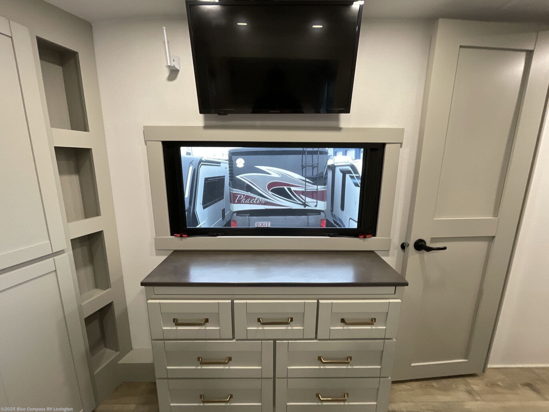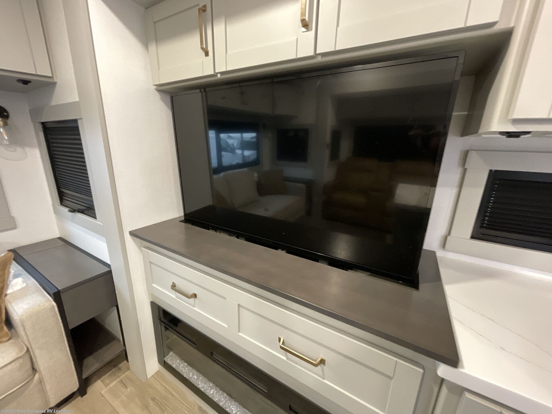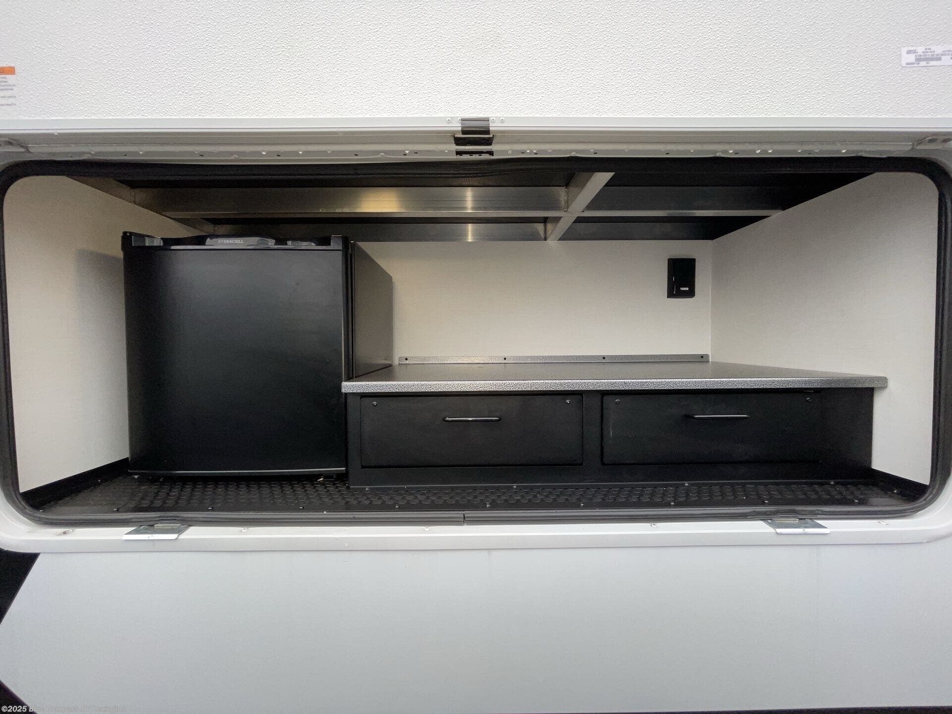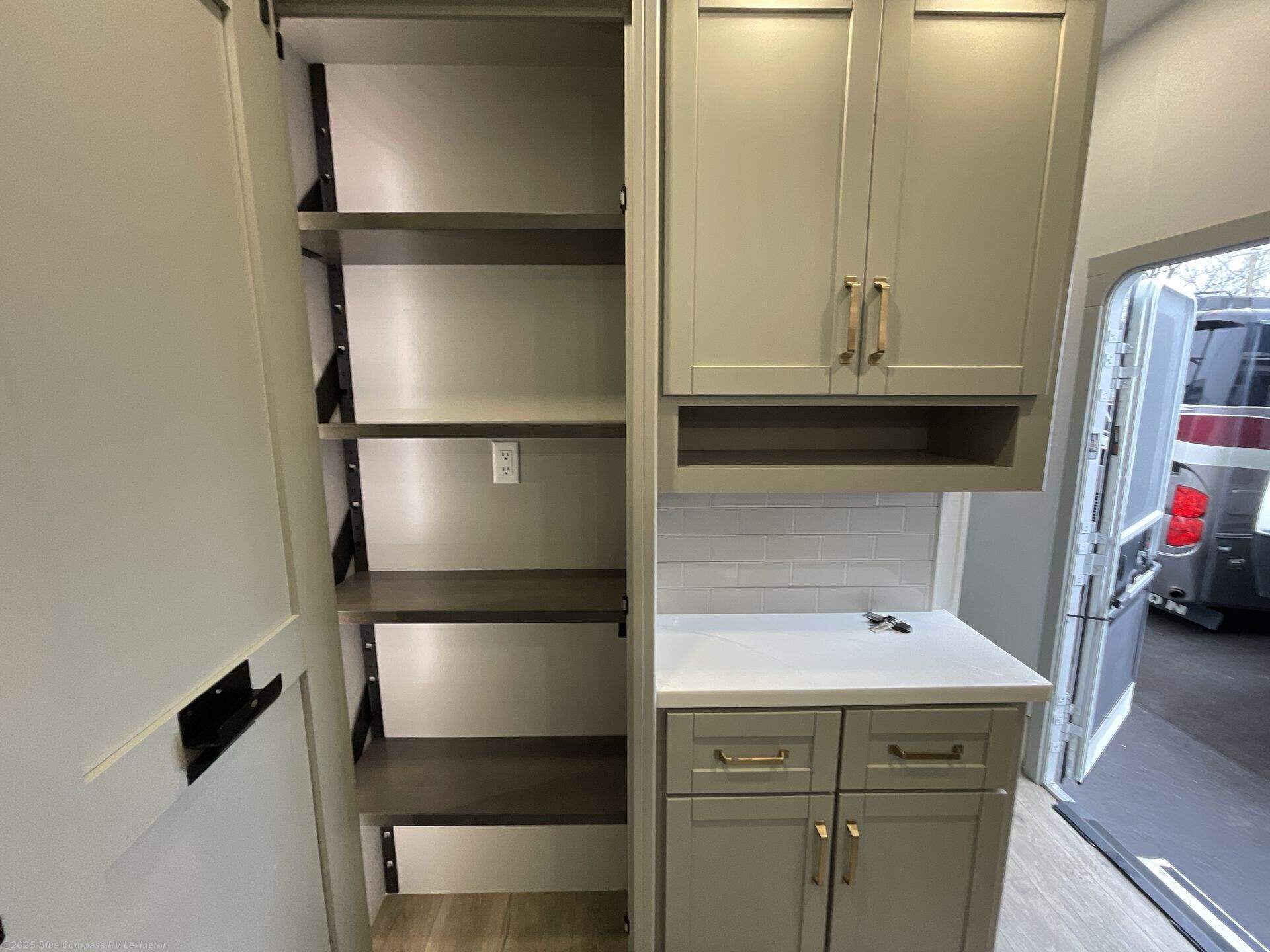 This unit is perfect for your family that needs sleeping space for eight! There is ample seating with a sliding desk/dining table, 62" theater seating, and a 72" tri-fold sofa along the rear wall. You can easily relax and enjoy the telescoping TV with a cozy fireplace below. The kitchen offers all that you need to prepare and cook meals just like home with a 16 cu. ft. refrigerator for your perishables, a 30" residential microwave oven, and three burner range top and oven. You will love the kitchen island all outfitted with pull-out pet bowls and double pull out trash bins with an integrated Stow & Go paper towel holder. There is also an 84" pantry with adjustable shelves for all of your canned and dry goods. Mid-coach, just ahead through the main entry, is a bonus room that can be used as a bedroom featuring a sofa bed with flip-up overhead bunk and trundle below, or an office with pull-out desk so that you can work easily while you travel, or it could also be used as a gaming room since there is also a 50" Smart TV. Head up the steps to a bathroom on your left and a private master suite with king bed slide all the way up front. A sliding dresser top features hidden storage which is perfect for jewelry and other personal belongings. The front wardrobe features mirrored doors and the corner closet has been prepped for a stackable washer and dryer if you choose to add that option.