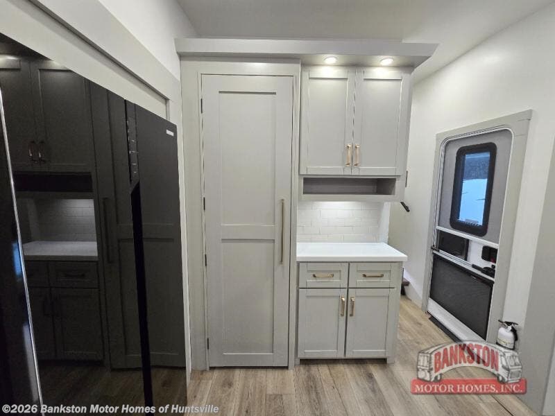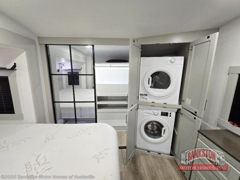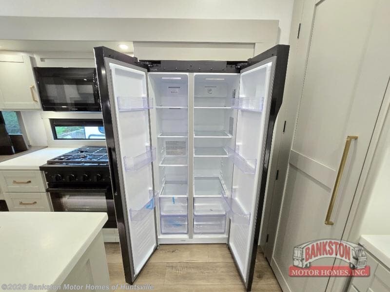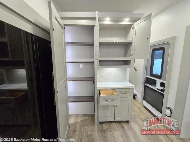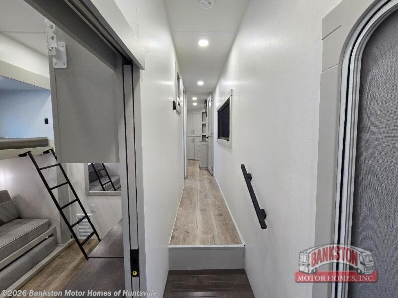 This unit is perfect for your family that needs sleeping space for eight! There is ample seating with a sliding desk/dining table, 62" theater seating, and a 72" tri-fold sofa along the rear wall. You can easily relax and enjoy the telescoping TV with a cozy fireplace below. The kitchen offers all that you need to prepare and cook meals just like home with a 16 cu. ft. refrigerator for your perishables, a 30" residential microwave oven, and three burner range top and oven. You will love the kitchen island all outfitted with pull-out pet bowls and double pull out trash bins with an integrated Stow & Go paper towel holder. There is also an 84" pantry with adjustable shelves for all of your canned and dry goods. Mid-coach, just ahead through the main entry, is a bonus room that can be used as a bedroom featuring a sofa bed with flip-up overhead bunk and trundle below, or an office with pull-out desk so that you can work easily while you travel, or it could also be used as a gaming room since there is also a 50" Smart TV. Head up the steps to a bathroom on your left and a private master suite with king bed slide all the way up front. A sliding dresser top features hidden storage which is perfect for jewelry and other personal belongings. The front wardrobe features mirrored doors and the corner closet has been prepped for a stackable washer and dryer if you choose to add that option.