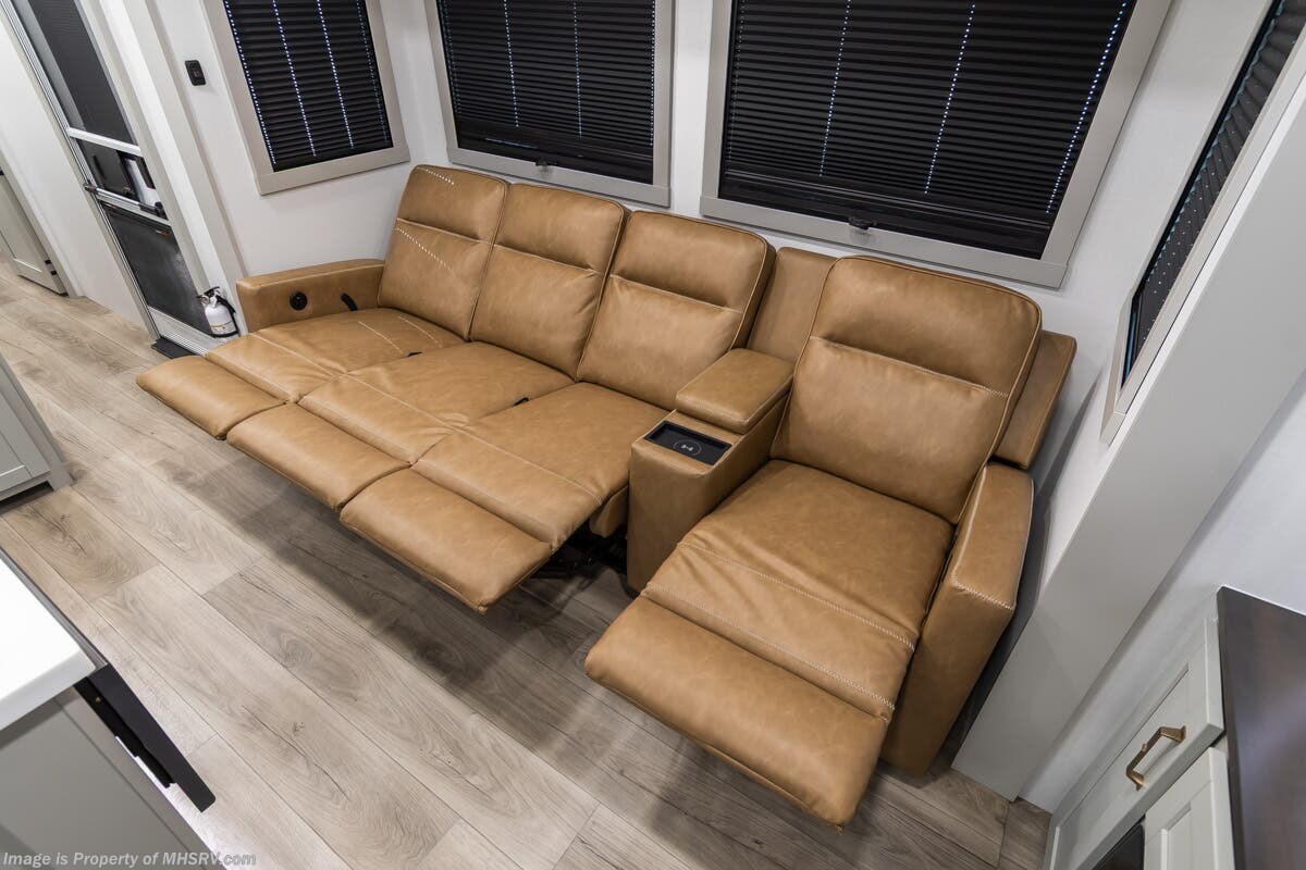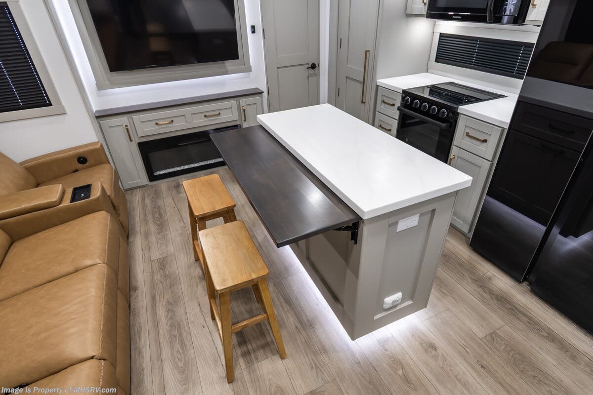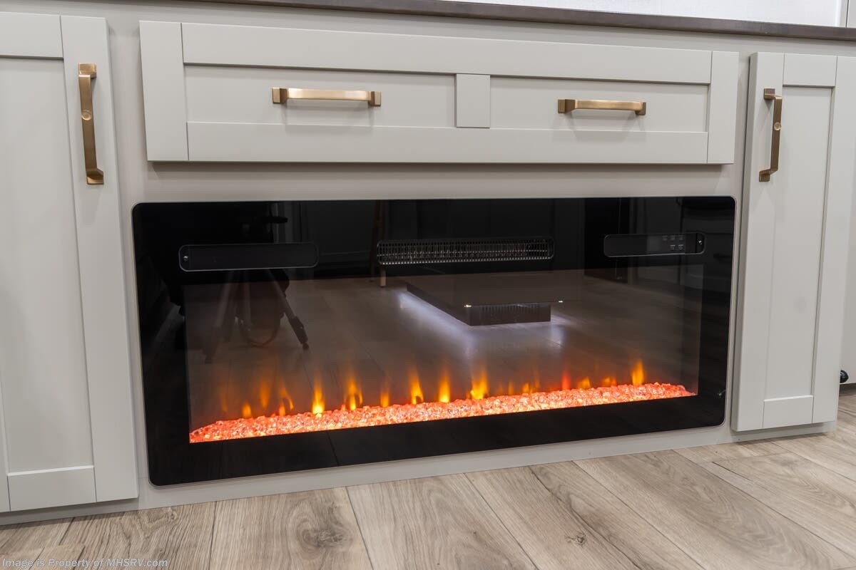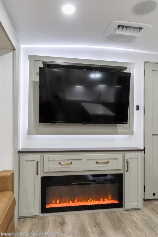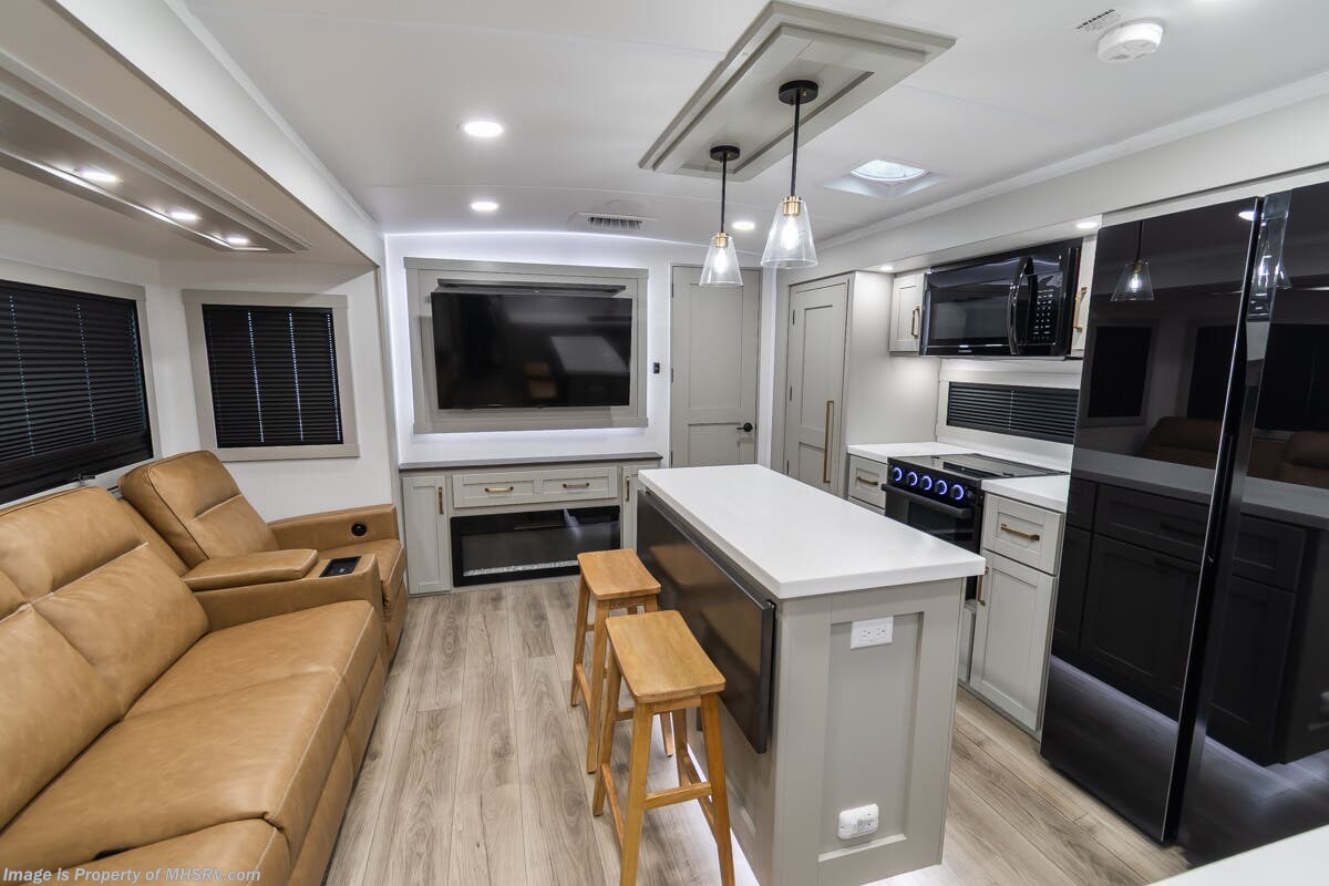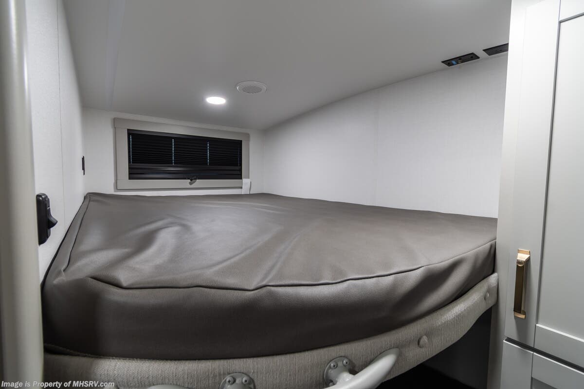 More About This RV This RV features aluminum wheels, full body paint, hydraulic leveling, dual A/C's, water manifold, patio awning, window awning, pass-through storage, LED running lights, docking lights, black tank flush, exterior shower, ladder, solar, inverter, leather seating, 7 foot ceiling, dual pane windows, fireplace, 3 burner gas range, solid surface counter, bunk beds and much more.