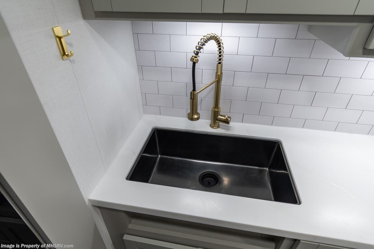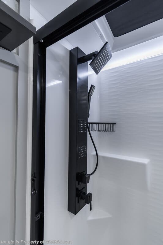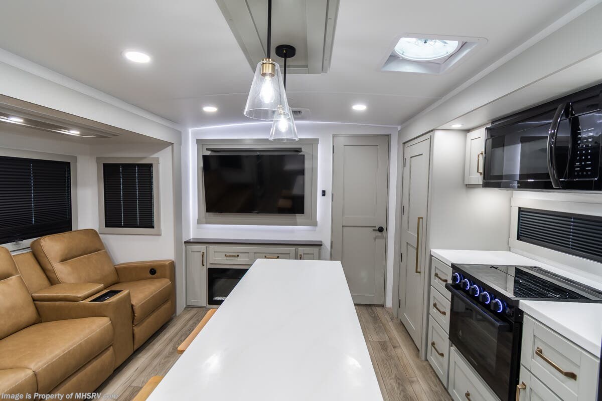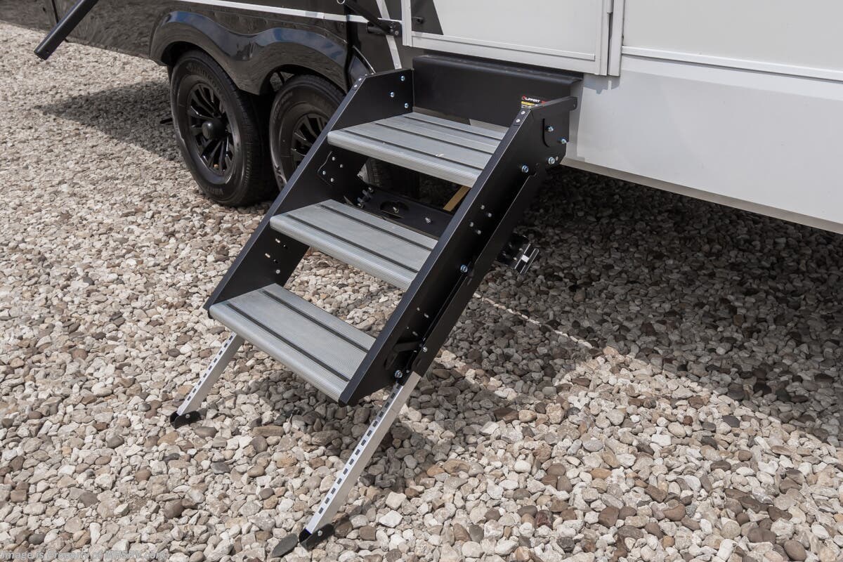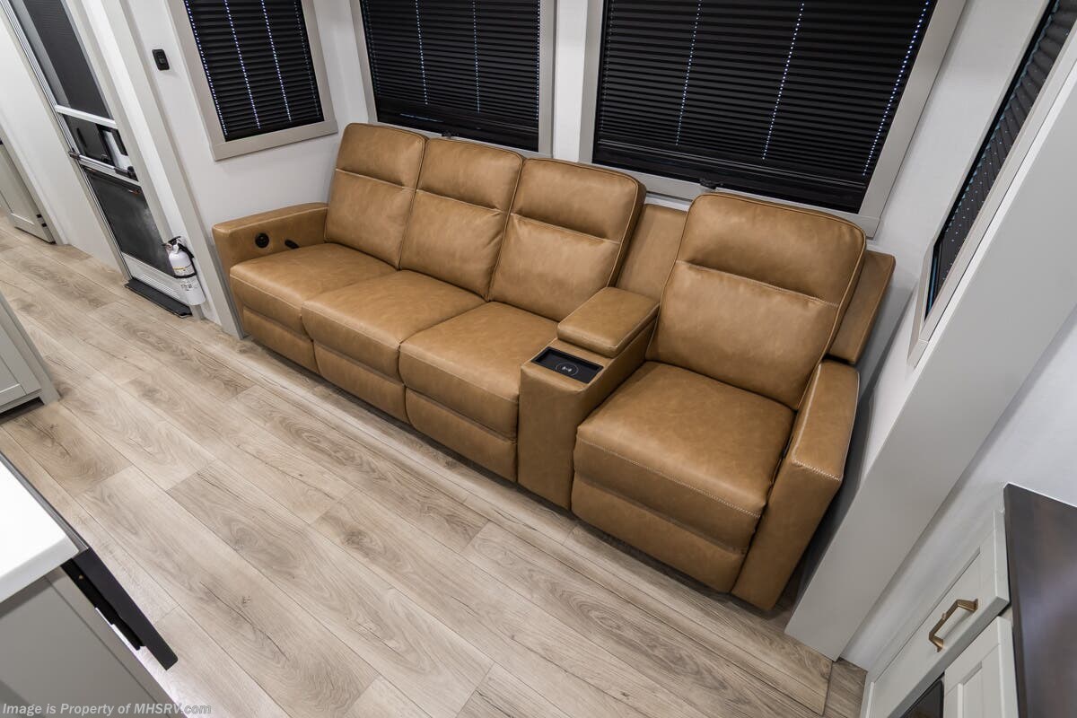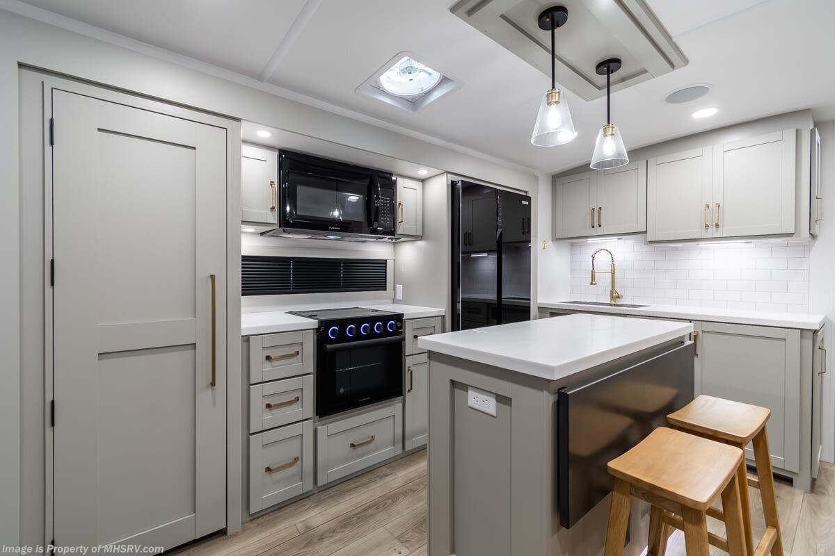 More About This RV This RV features aluminum wheels, full body paint, hydraulic leveling, dual A/C's, water manifold, patio awning, window awning, pass-through storage, LED running lights, docking lights, black tank flush, exterior shower, ladder, solar, inverter, leather seating, 7 foot ceiling, dual pane windows, fireplace, 3 burner gas range, solid surface counter, bunk beds and much more.