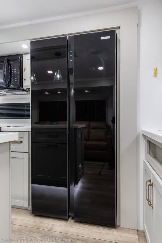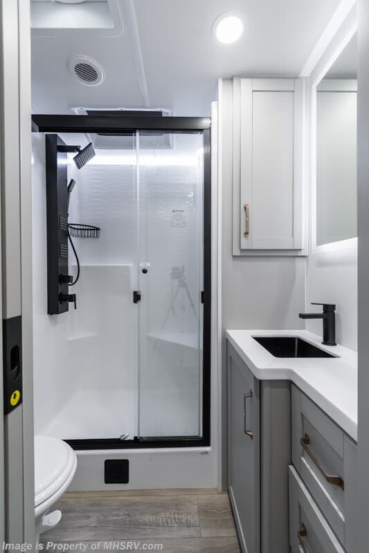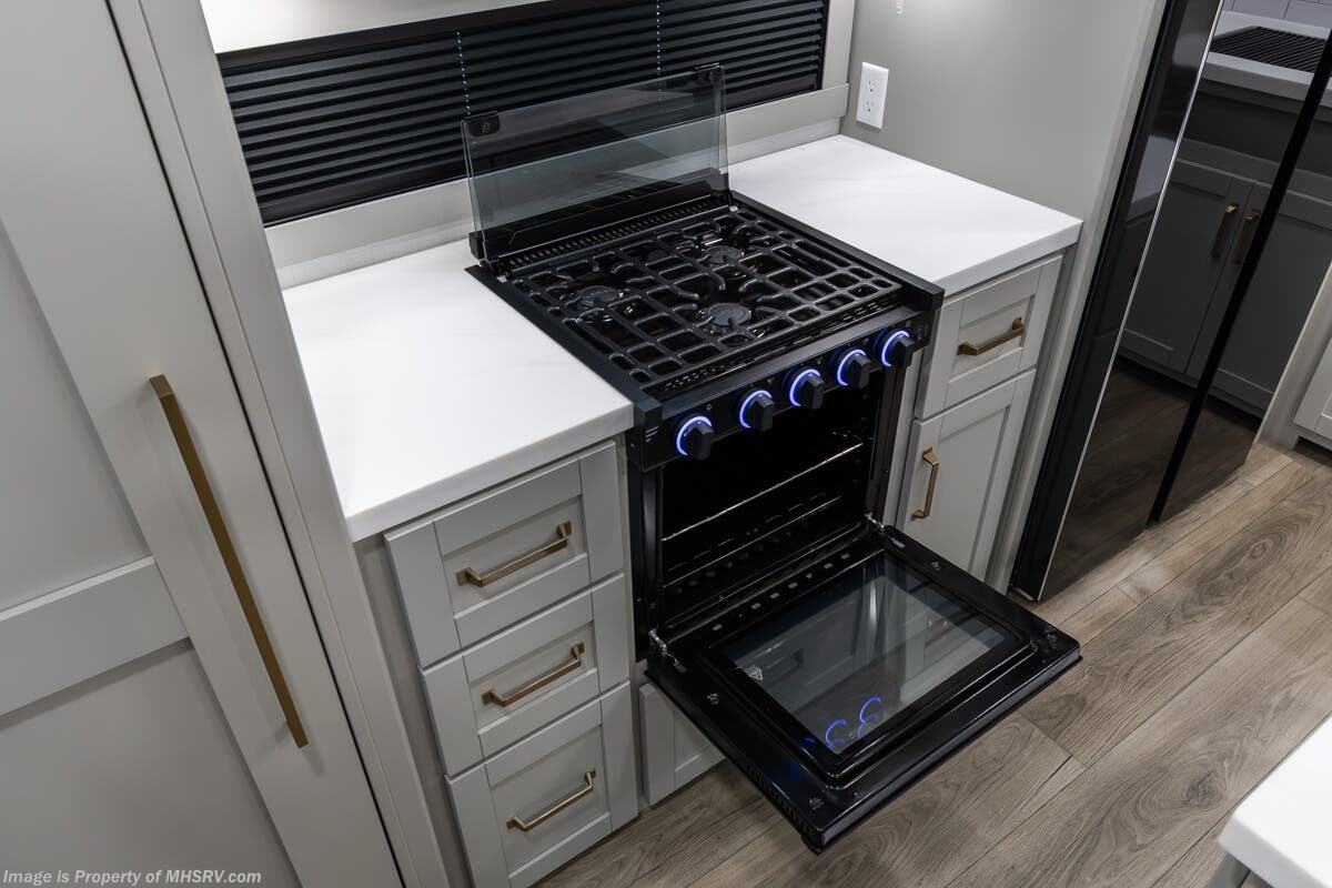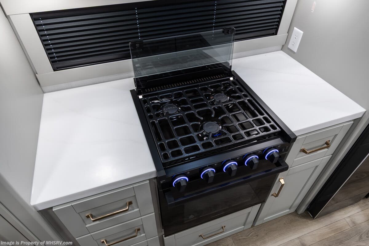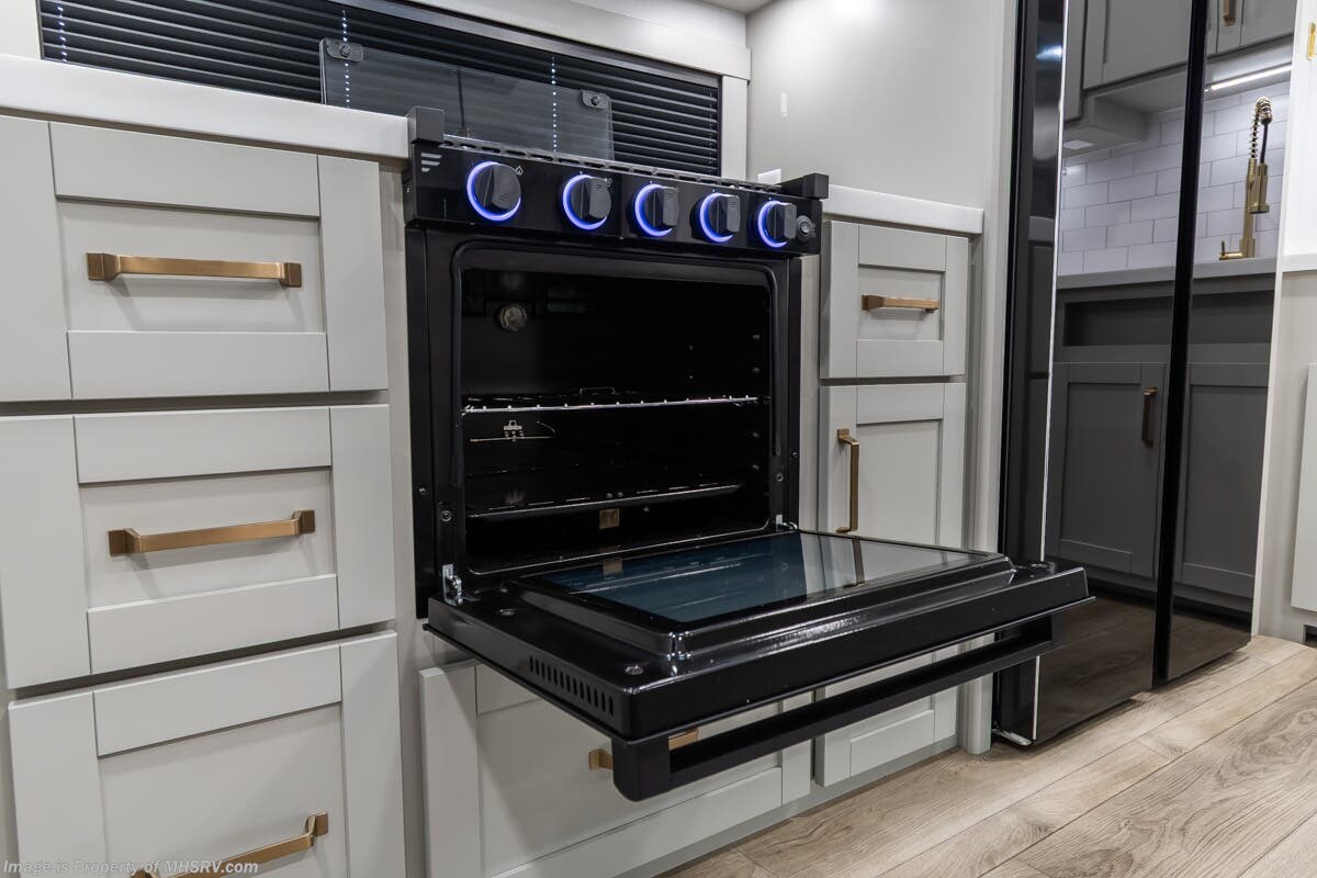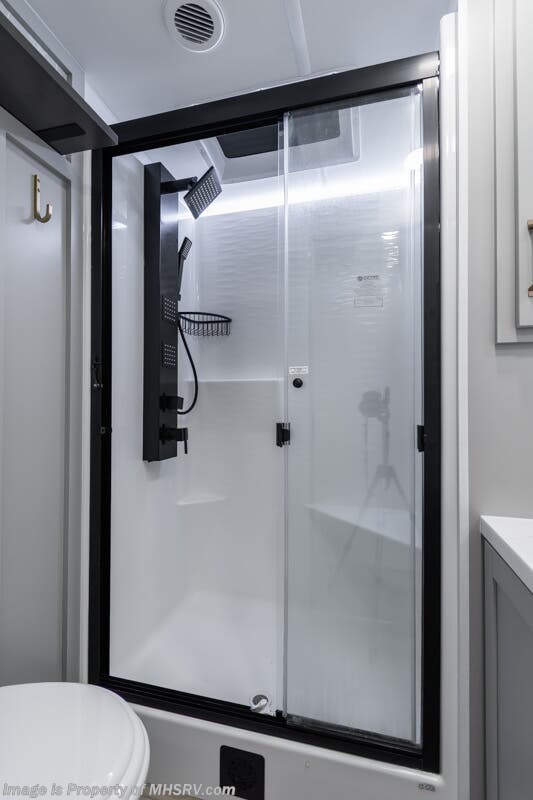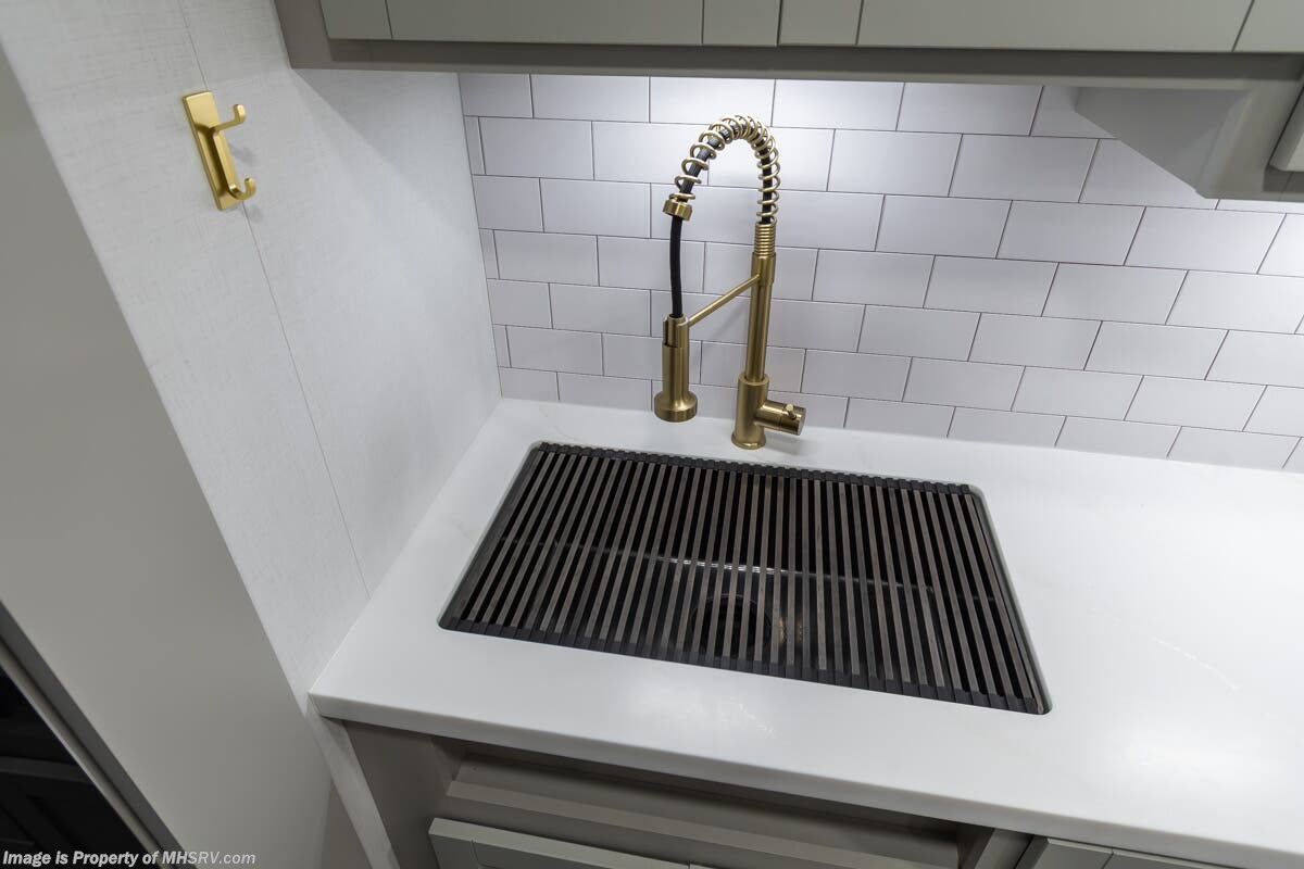 More About This RV This RV features aluminum wheels, full body paint, hydraulic leveling, dual A/C's, water manifold, patio awning, window awning, pass-through storage, LED running lights, docking lights, black tank flush, exterior shower, ladder, solar, inverter, leather seating, 7 foot ceiling, dual pane windows, fireplace, 3 burner gas range, solid surface counter, bunk beds and much more.