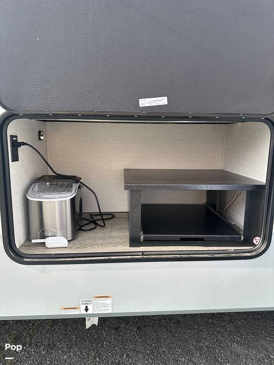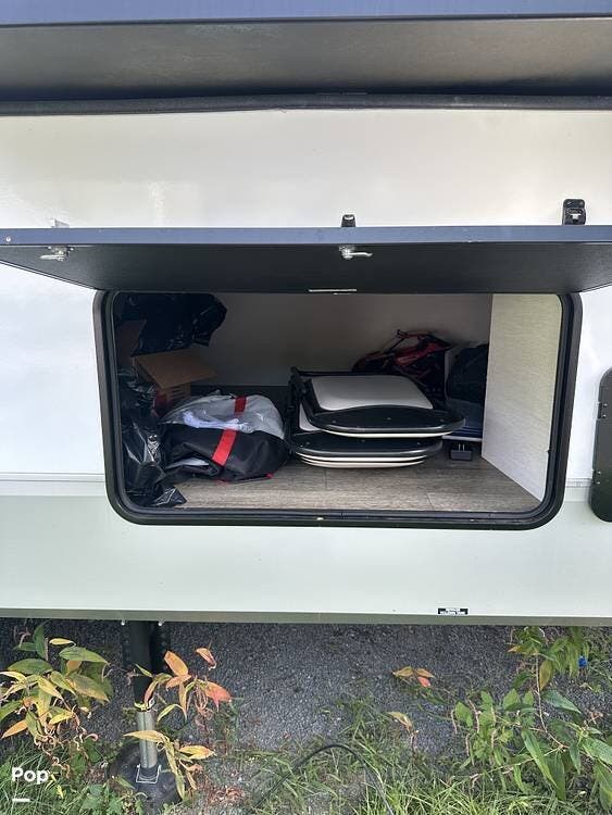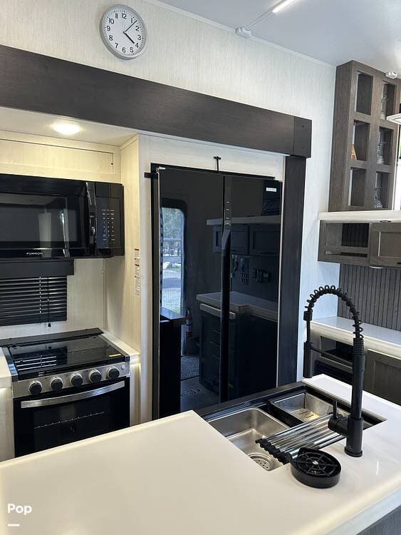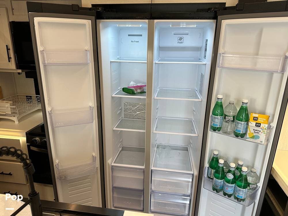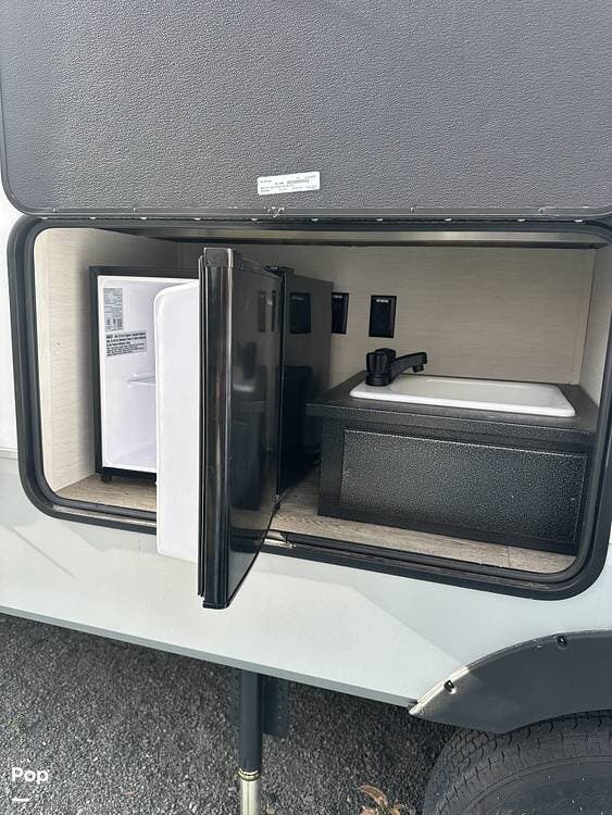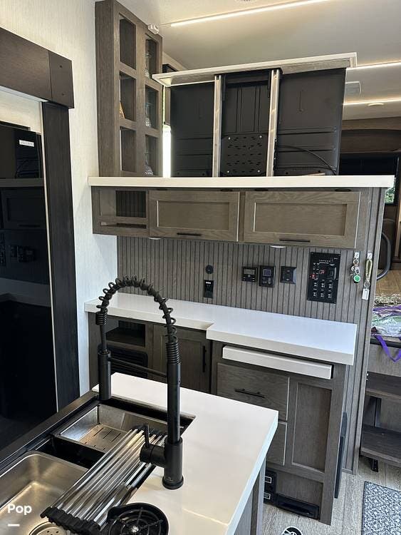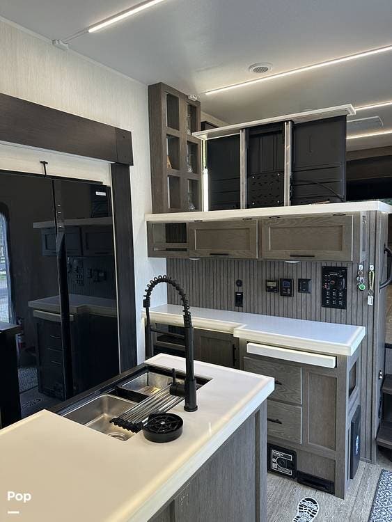 Outside, you will appreciate the auto-leveling feature, an exterior kitchen with a mini fridge, cooktop, and sink, two big power awnings, and plenty of storage.