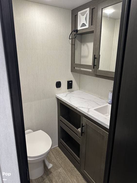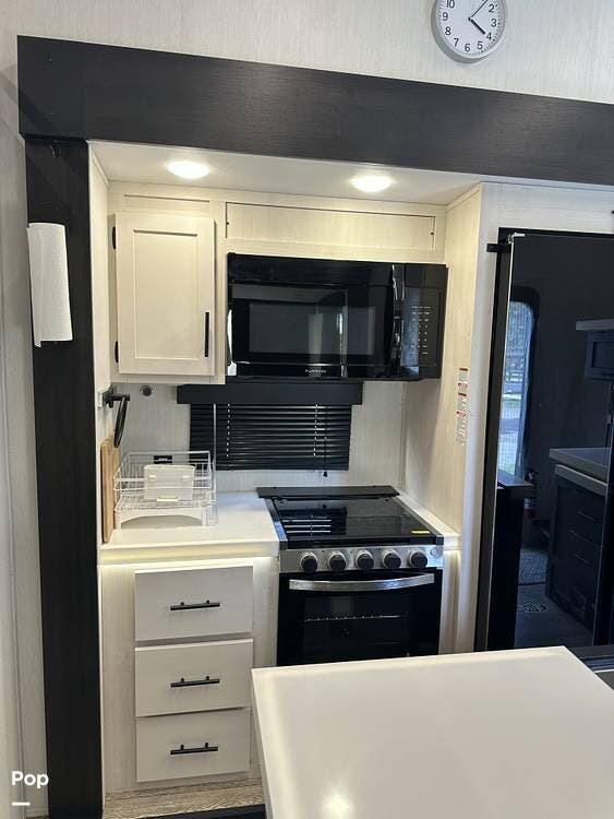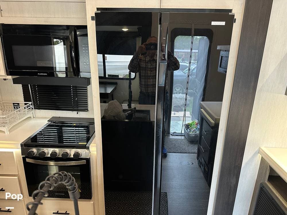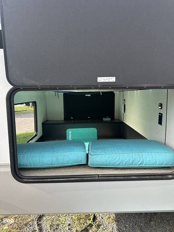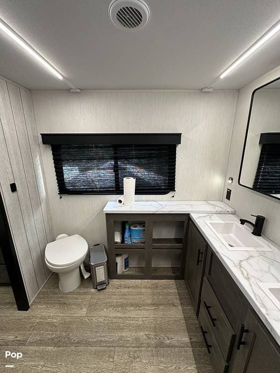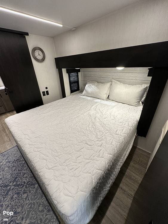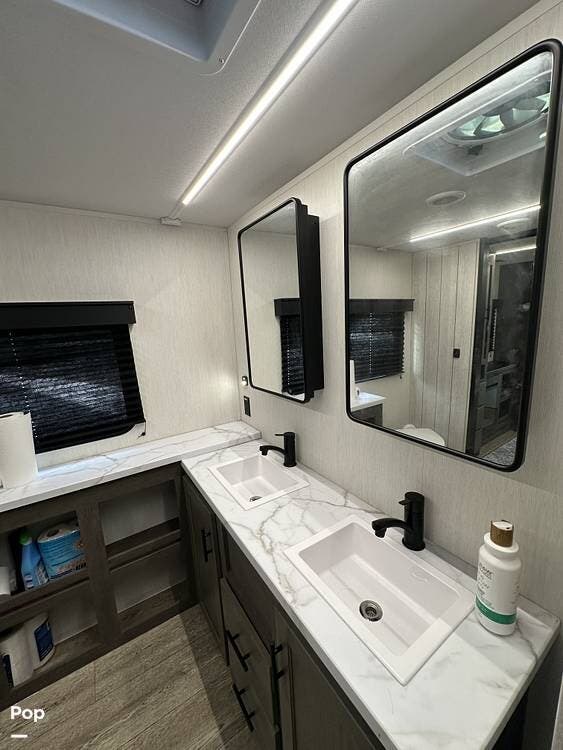 Outside, you will appreciate the auto-leveling feature, an exterior kitchen with a mini fridge, cooktop, and sink, two big power awnings, and plenty of storage.