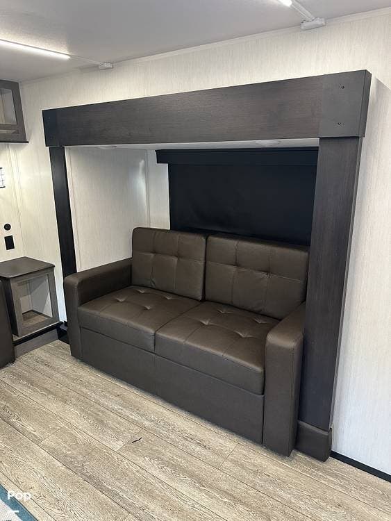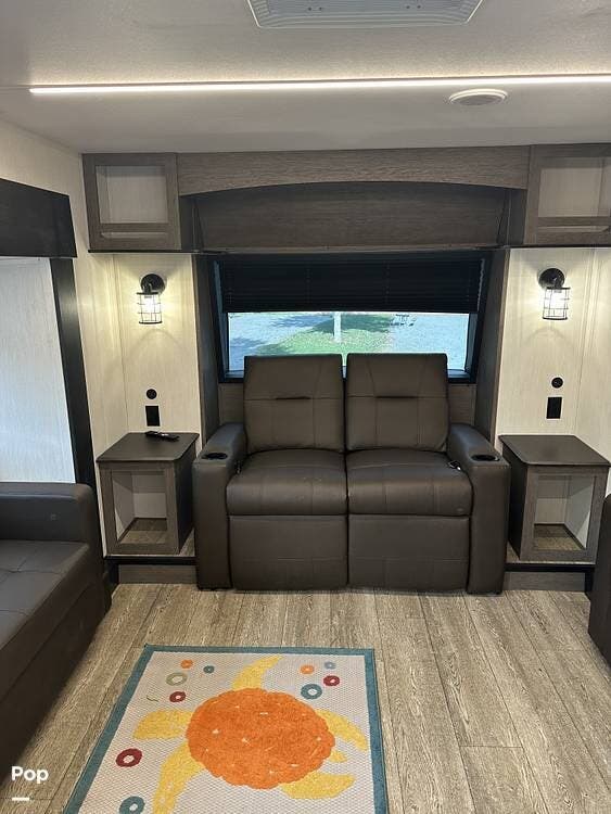 The front living room features two opposing tri-fold sleeper sofas, along with theatre seating directly across from the entertainment center and fireplace.