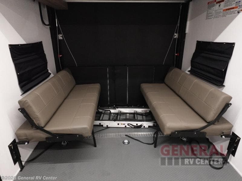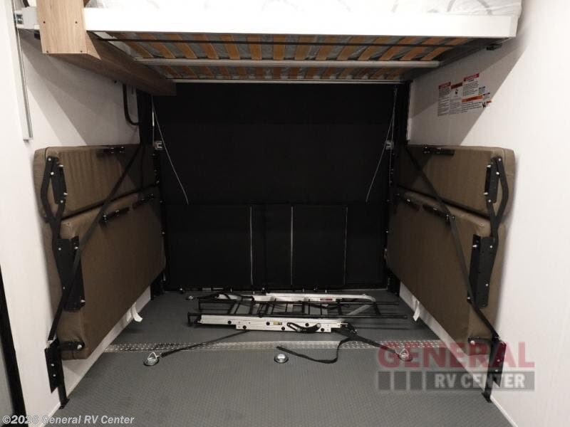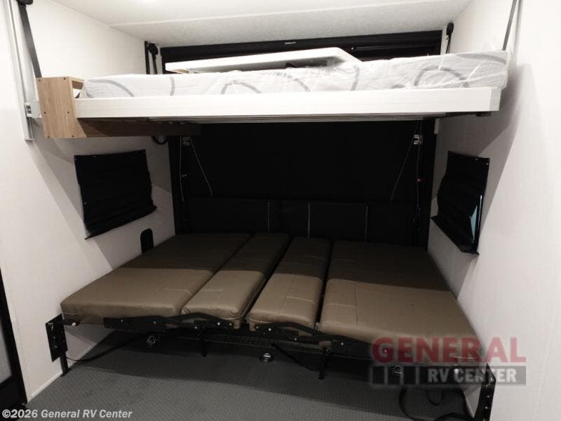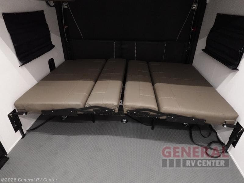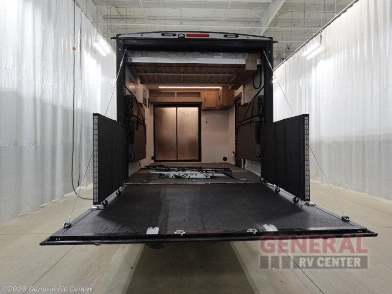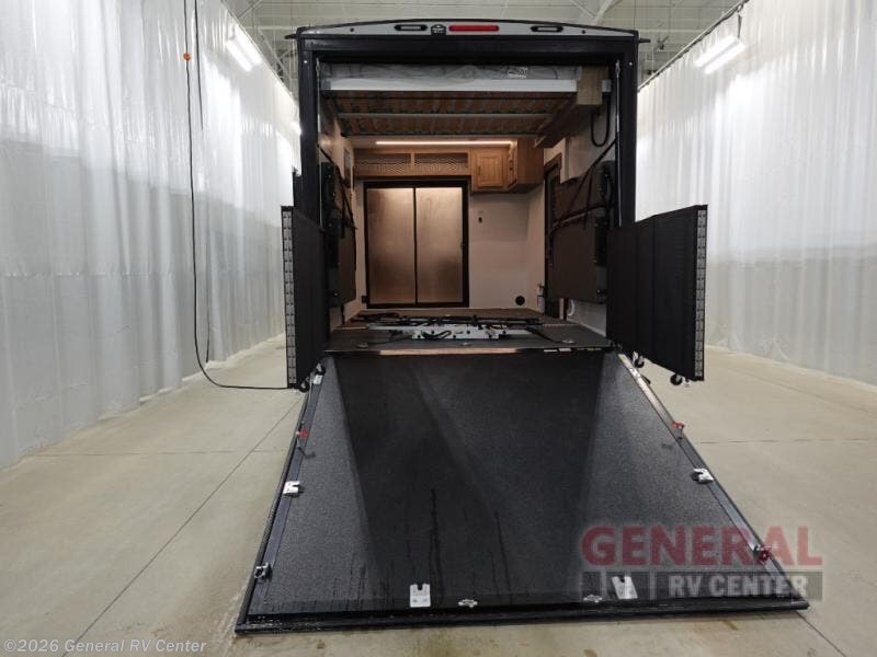 Looking for 13' of toy parking space, and sleeping space for six? You are going to love this model! You will appreciate the large cargo area for all your toys, and the extra sleeping space for family and friends with the roll over sofas converted and the overhead queen bed lift dropped down in the garage area. And the queen bed slide in the front master bedroom will be perfect for the owners. The chef of the family or group can prepare dinner on the three burner cooktop or use the microwave, and the double entry bath is conveniently located just inside the main side entry and includes a nice size shower, vanity with a sink and an overhead medicine cabinet. This toy hauler also includes dual entry/exit doors with the second one into the garage area. You will also find a rear pull down screen in the garage, pull-down roller night shades to be able to sleep in late, and a solar package to help you stay off-grid.