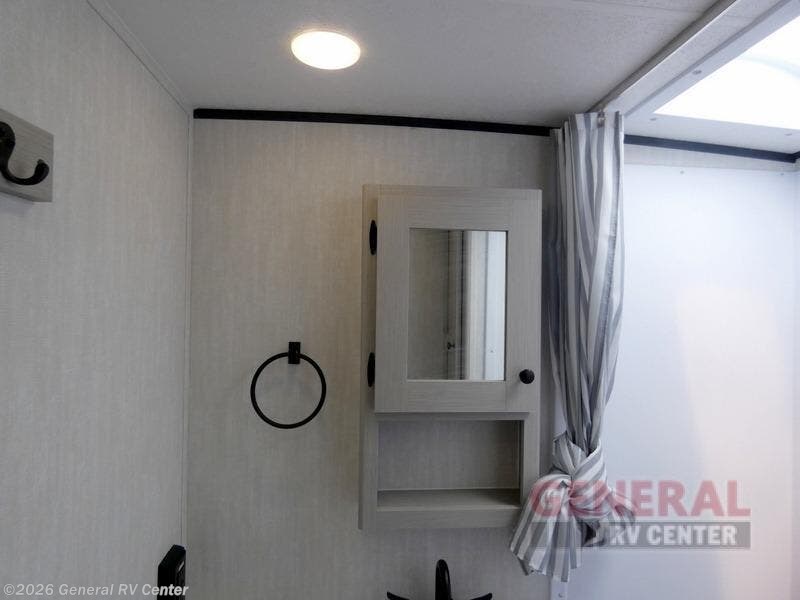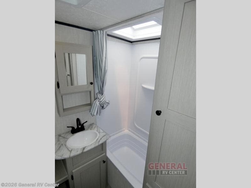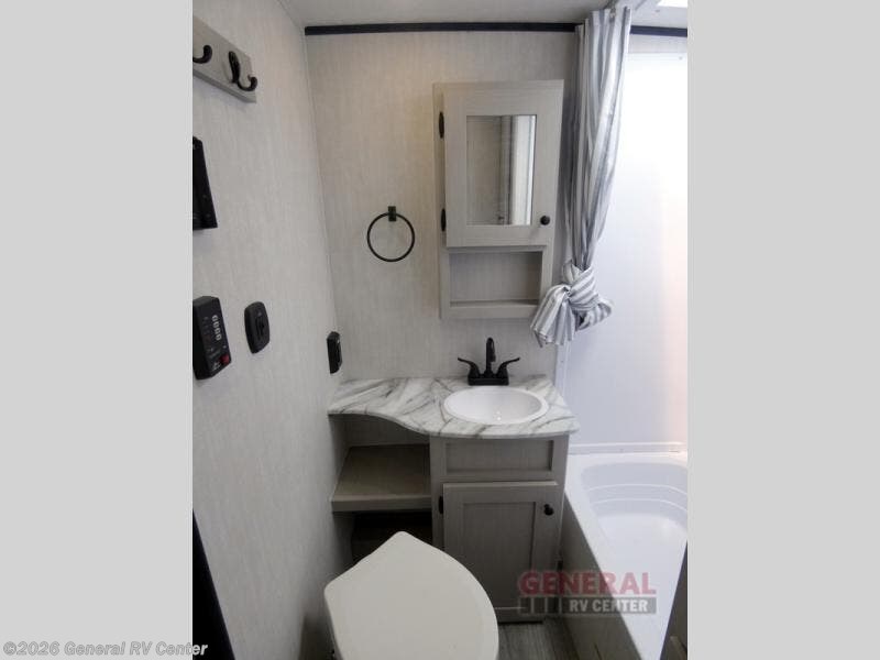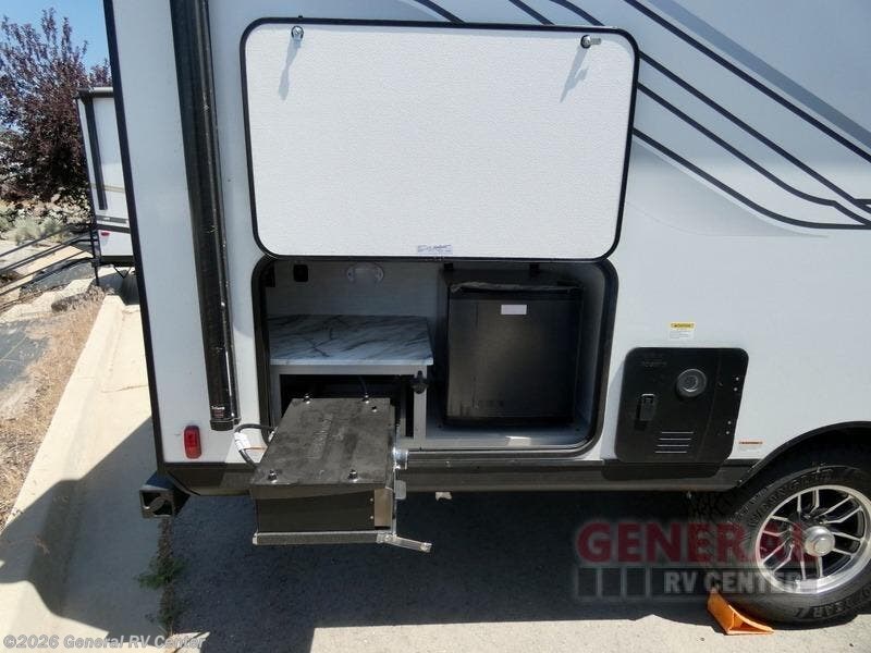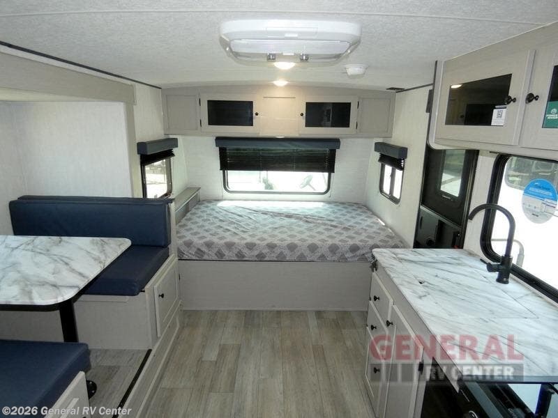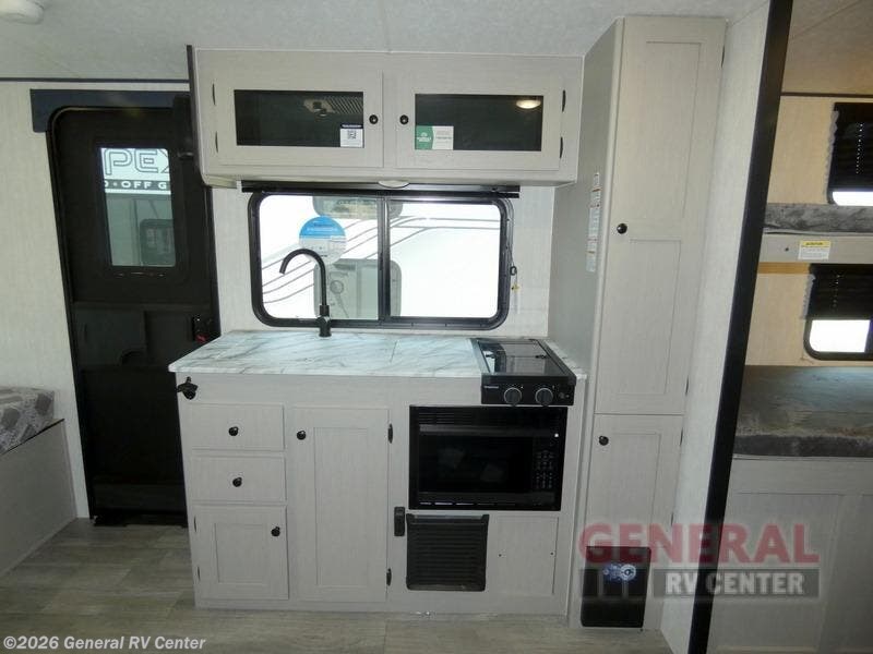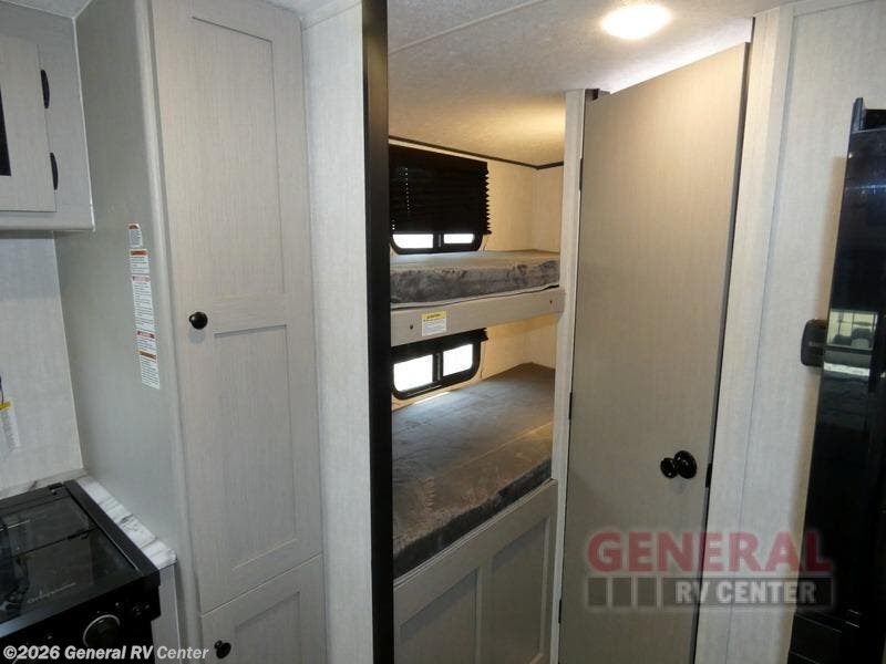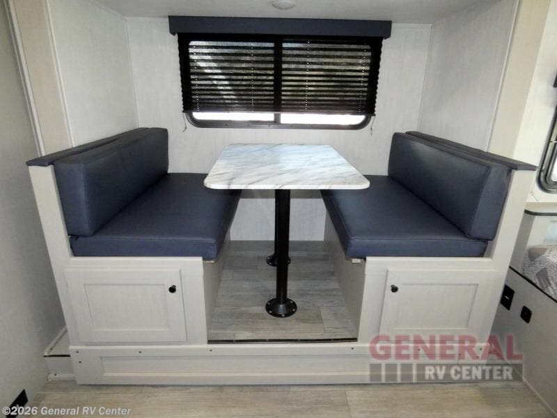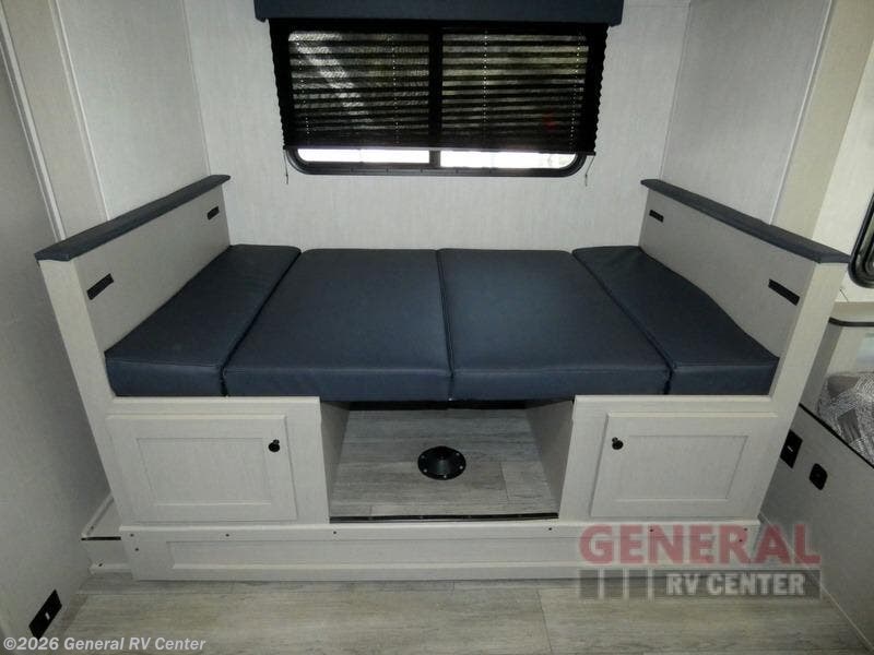 You will have more interior space with a booth dinette slide in this travel trailer! The chef will love cooking indoors with the two burner cooktop, microwave, and 8 cu. ft. 12V refrigerator, as well as outdoors with the exterior camp kitchen. Start each morning feeling clean and refreshed after sleeping on the front queen bed with a headboard and showering in the tub/shower inside the rear corner bathroom, plus the bathroom has a wardrobe to keep your towels close. The kids will love sleeping on the rear corner set of 30" x 74" bunk beds too!