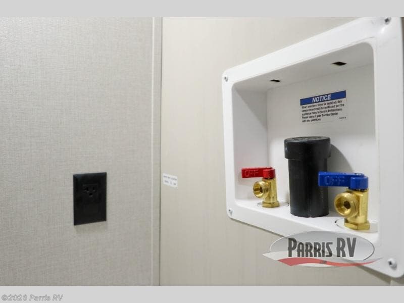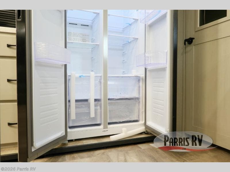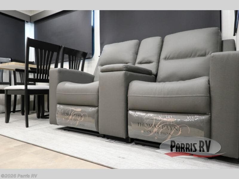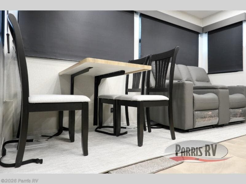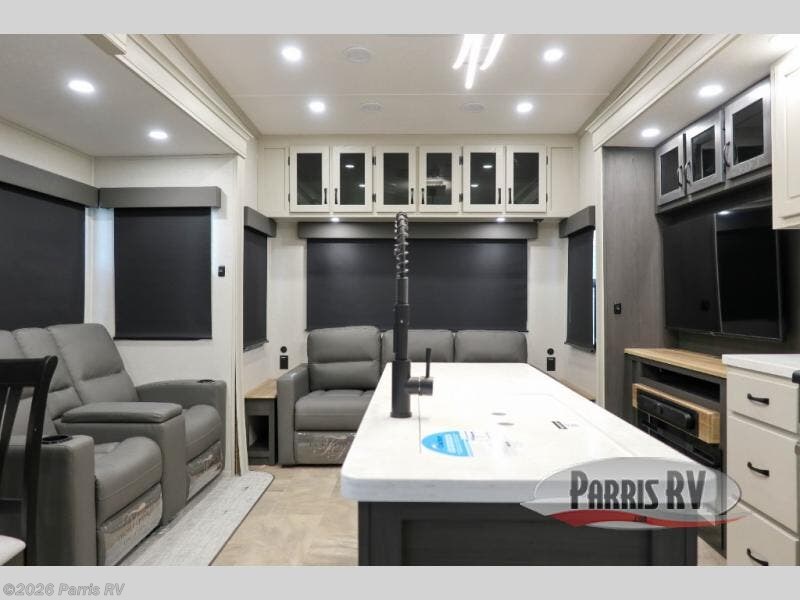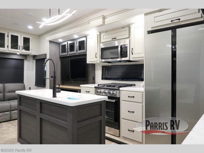 The great outdoors is calling your name in this triple slide out fifth wheel. The kitchen is any chef's dream with its kitchen island, residential 15.6 cu. ft. 12V refrigerator, and large transom window at the cooktop to let a breeze in. The theater seating is directly across from the entertainment center for easy viewing, and you'll find additional seating on the 78" tri-fold hide-a-bed sofa and free-standing table. Cleaning up each day will be a breeze with the shower with a seat and sliding glass doors. The front private bedroom includes a king bed slide out, a large front wardrobe, plus washer and dryer prep to make camping even easier.
