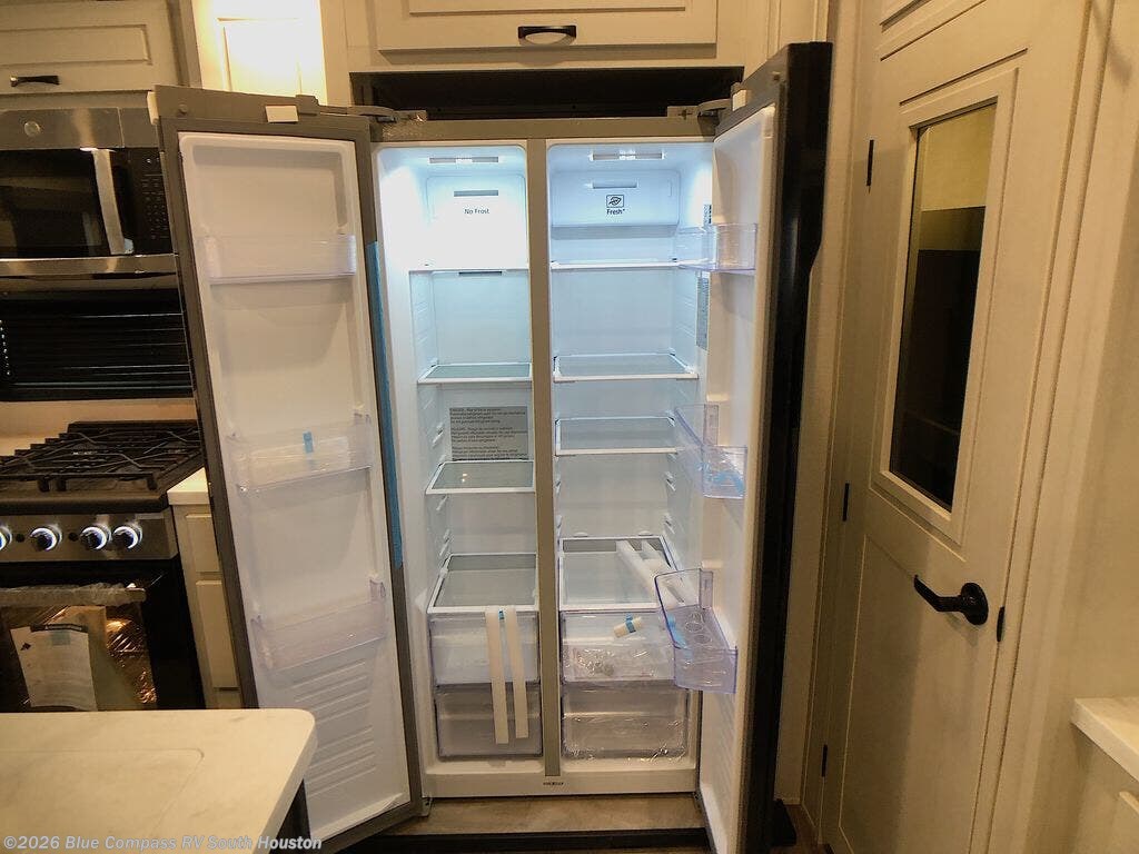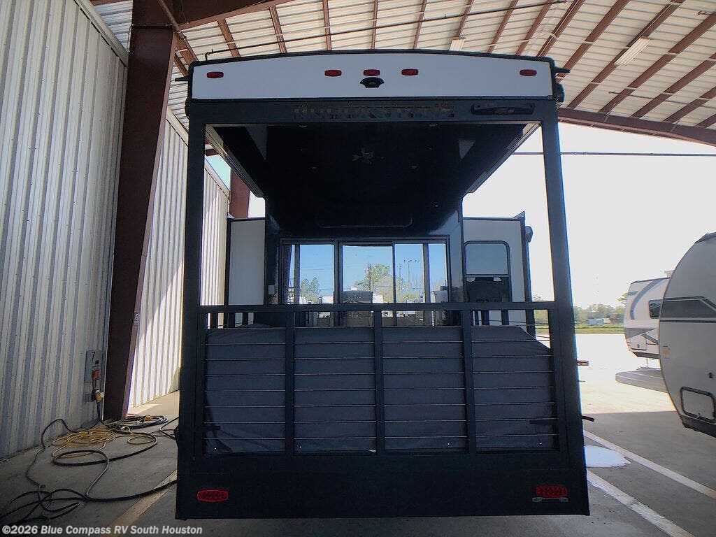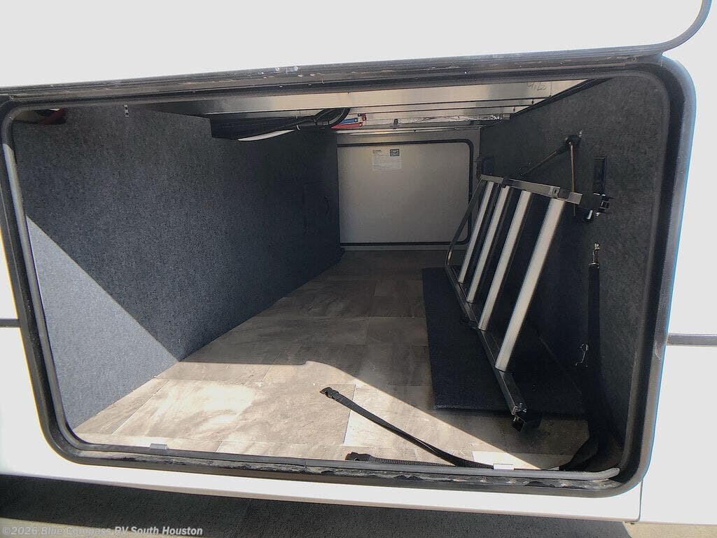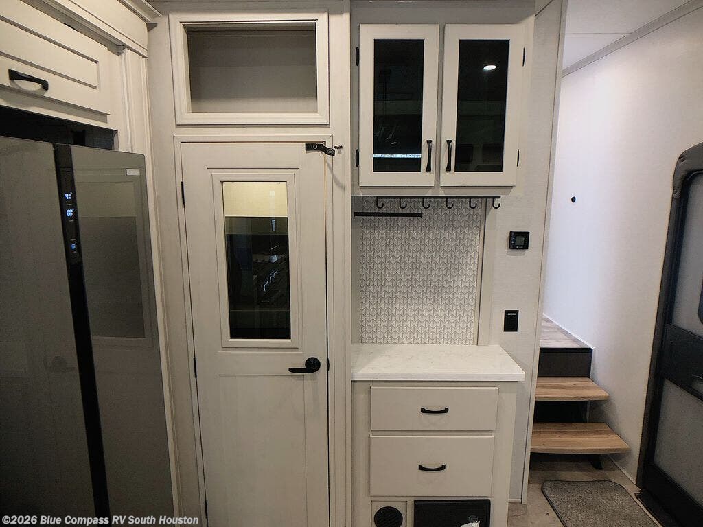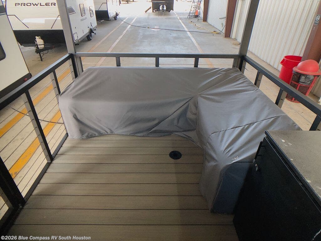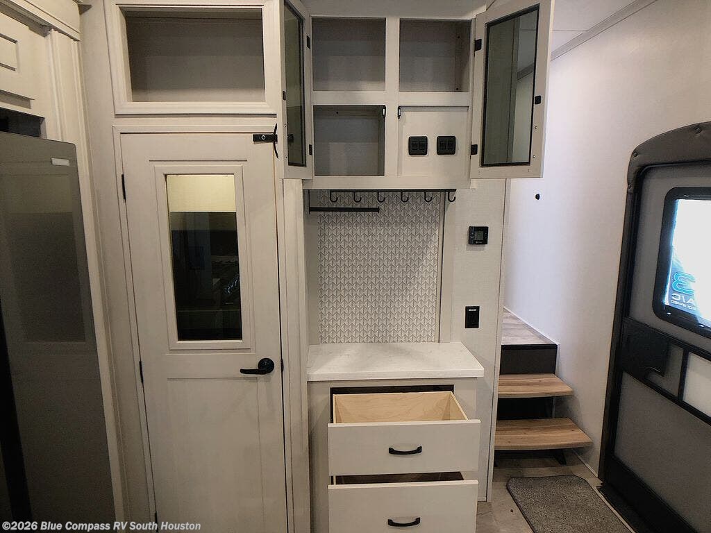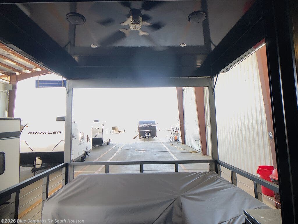 Step outside and enjoy the fresh air on our covered patio, complete with a refrigerator and optional L-shaped sofa, which is the perfect place to relax and unwind after a long day of adventure. Inside, the kitchen/living room area will make you feel an at-home experience, featuring overhead cabinets, an entertainment center, theater seating, a free-spanning table, a kitchen island, a microwave, a refrigerator, and a pantry. Perfect for cooking up a storm, entertaining friends and family, or simply relaxing and enjoying the comforts of home. The full bathroom is a spacious oasis, complete with a shower with a seat, a linen closet, and more. Plus, with a front bedroom featuring a king bed, dresser, washer and dryer prep, and a large wardrobe, you'll have the perfect place to rest and recharge after a long day of adventure. With two entry/exit doors and a massive 20’ awning, you'll have easy access to the RV and plenty of shade and protection from the weather.