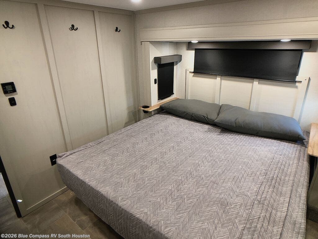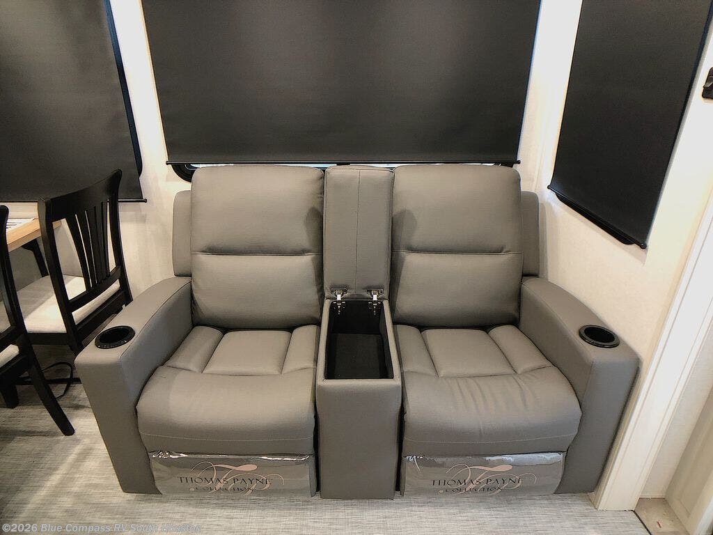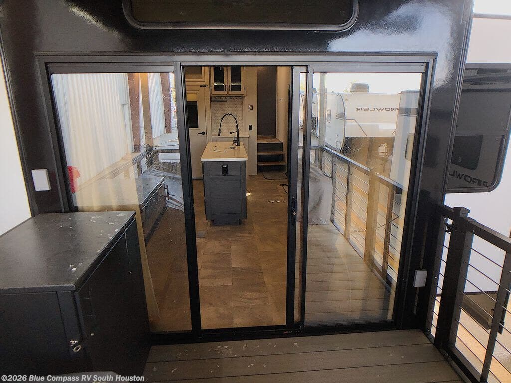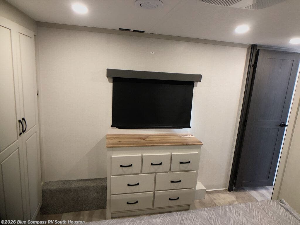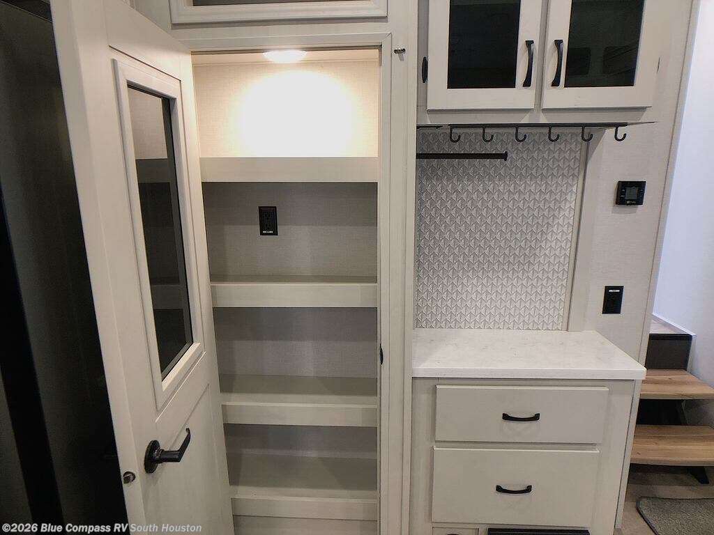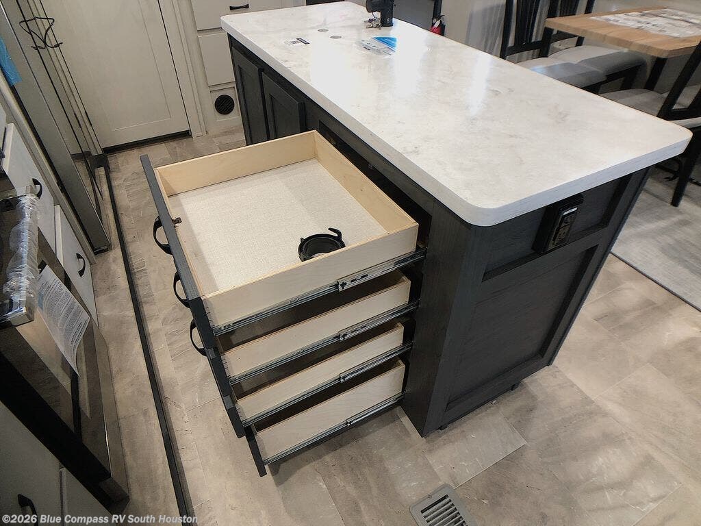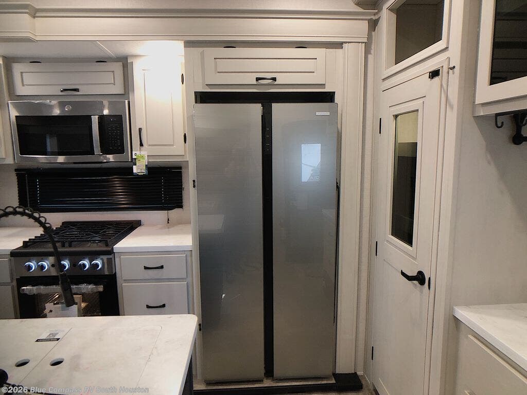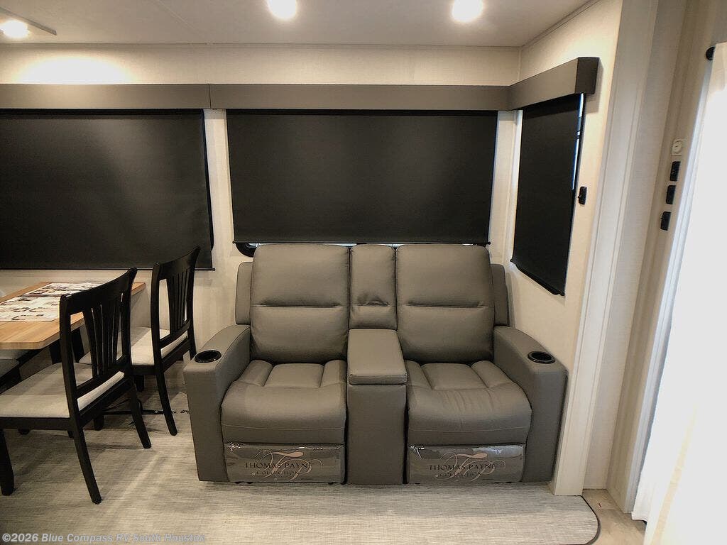 Step outside and enjoy the fresh air on our covered patio, complete with a refrigerator and optional L-shaped sofa, which is the perfect place to relax and unwind after a long day of adventure. Inside, the kitchen/living room area will make you feel an at-home experience, featuring overhead cabinets, an entertainment center, theater seating, a free-spanning table, a kitchen island, a microwave, a refrigerator, and a pantry. Perfect for cooking up a storm, entertaining friends and family, or simply relaxing and enjoying the comforts of home. The full bathroom is a spacious oasis, complete with a shower with a seat, a linen closet, and more. Plus, with a front bedroom featuring a king bed, dresser, washer and dryer prep, and a large wardrobe, you'll have the perfect place to rest and recharge after a long day of adventure. With two entry/exit doors and a massive 20’ awning, you'll have easy access to the RV and plenty of shade and protection from the weather.