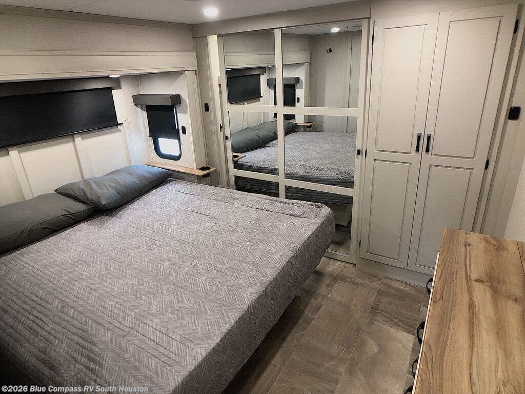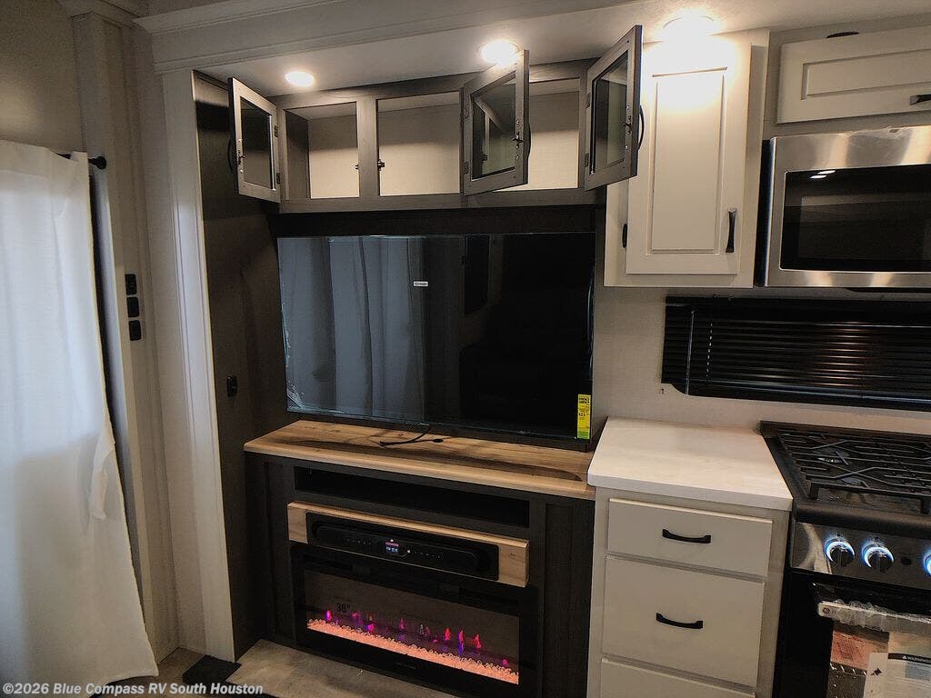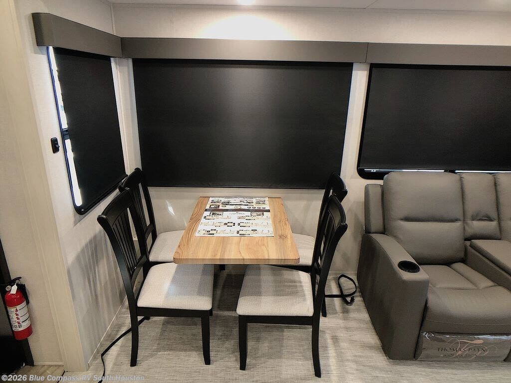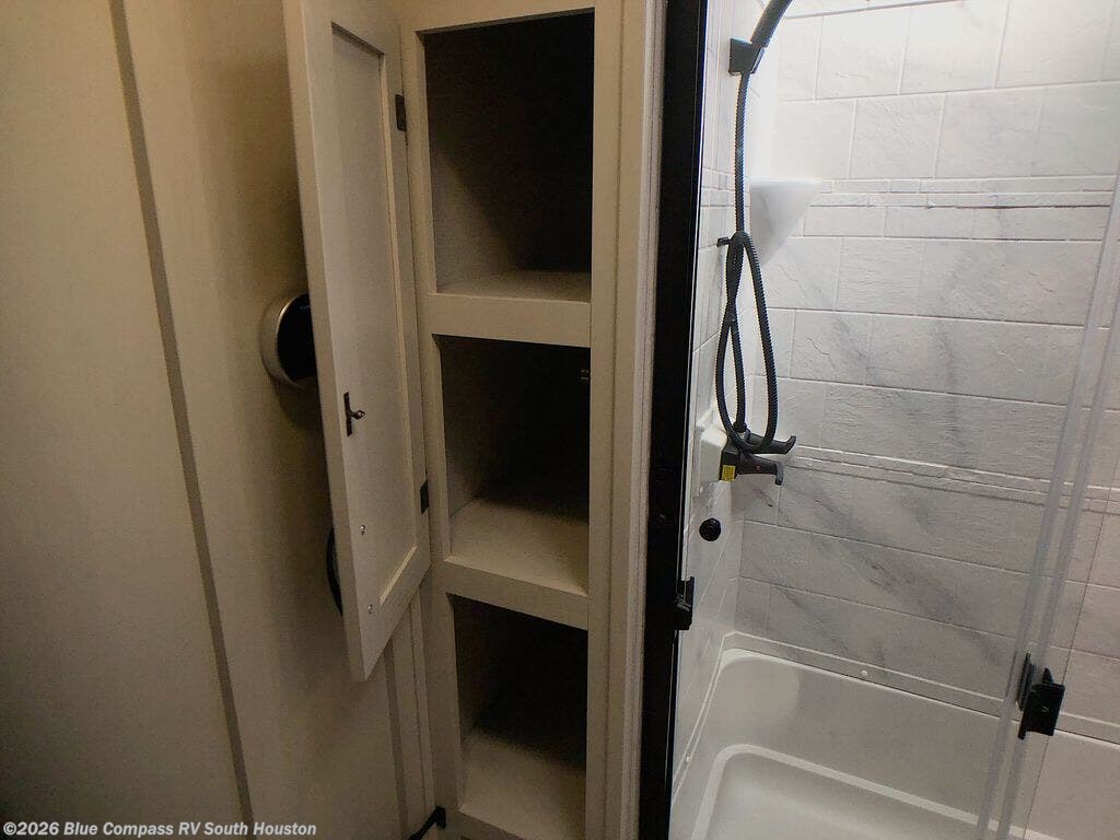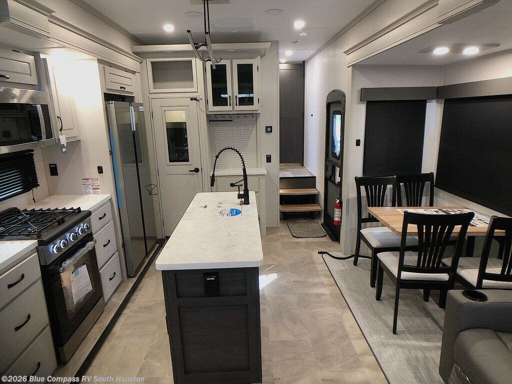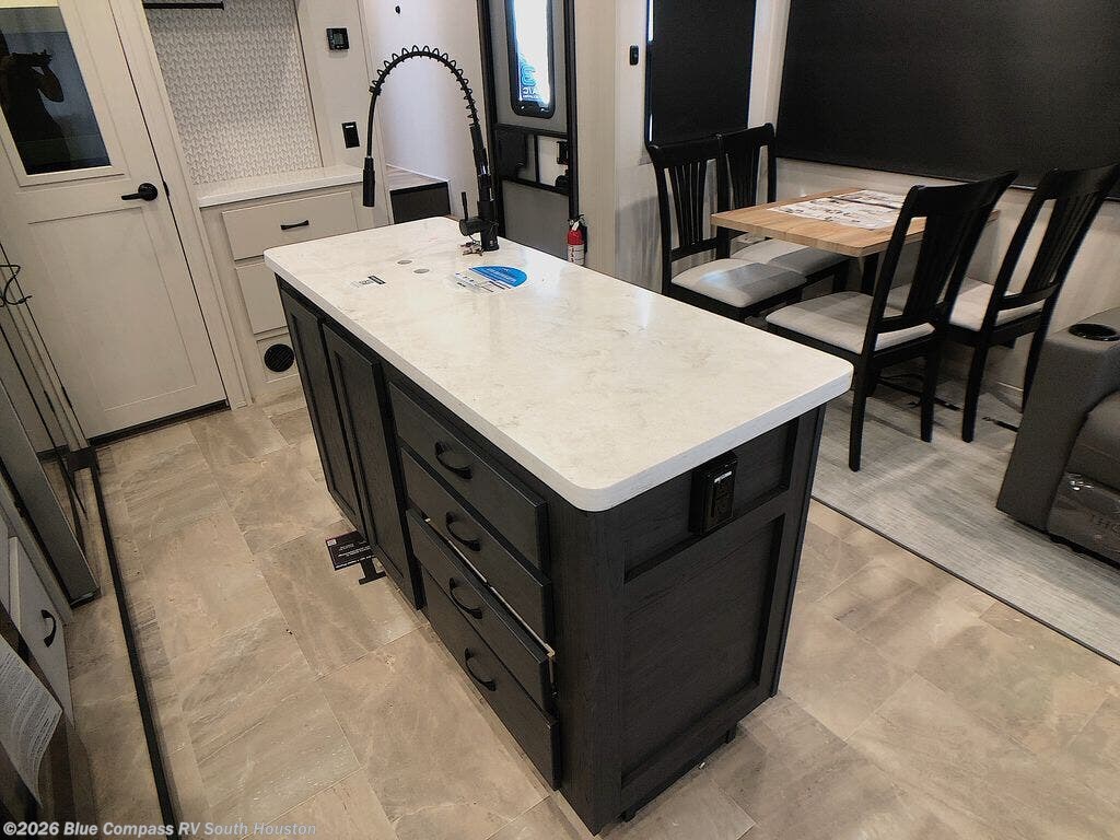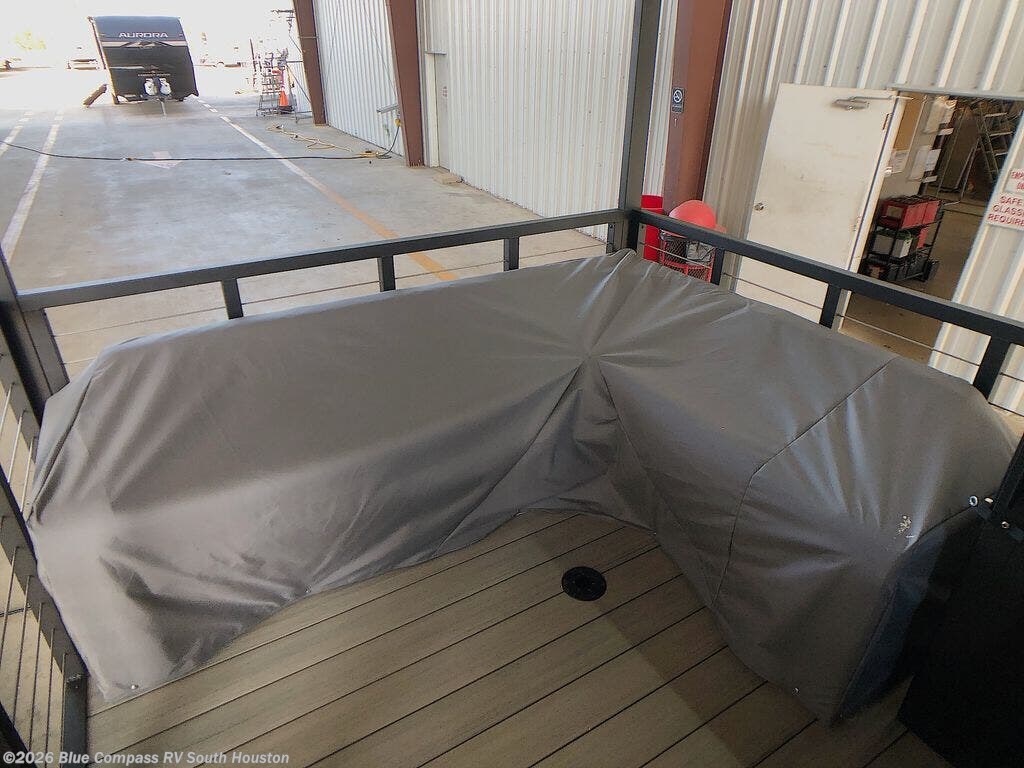 Step outside and enjoy the fresh air on our covered patio, complete with a refrigerator and optional L-shaped sofa, which is the perfect place to relax and unwind after a long day of adventure. Inside, the kitchen/living room area will make you feel an at-home experience, featuring overhead cabinets, an entertainment center, theater seating, a free-spanning table, a kitchen island, a microwave, a refrigerator, and a pantry. Perfect for cooking up a storm, entertaining friends and family, or simply relaxing and enjoying the comforts of home. The full bathroom is a spacious oasis, complete with a shower with a seat, a linen closet, and more. Plus, with a front bedroom featuring a king bed, dresser, washer and dryer prep, and a large wardrobe, you'll have the perfect place to rest and recharge after a long day of adventure. With two entry/exit doors and a massive 20’ awning, you'll have easy access to the RV and plenty of shade and protection from the weather.