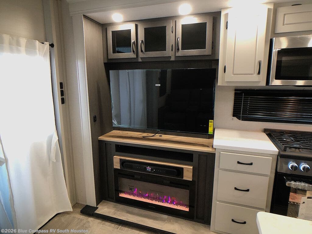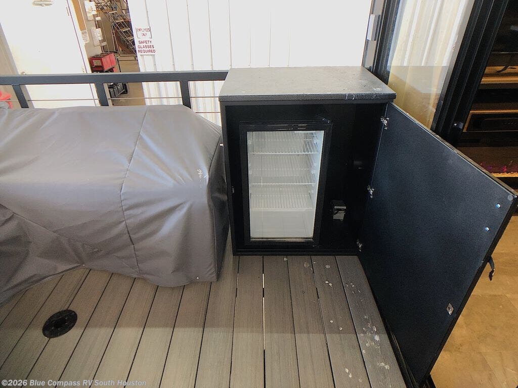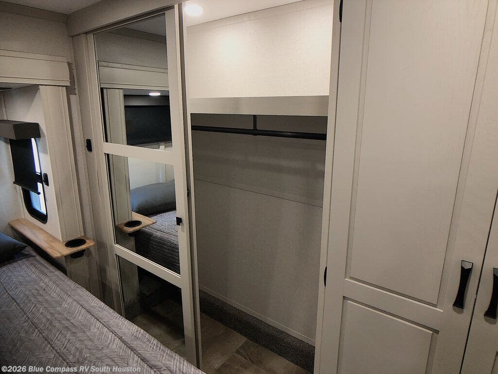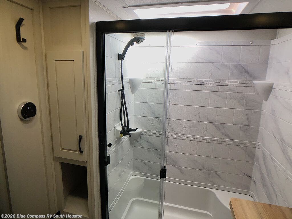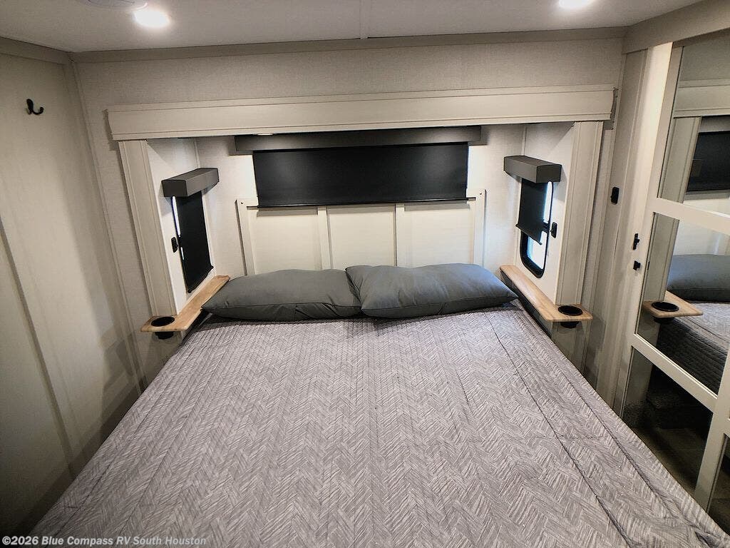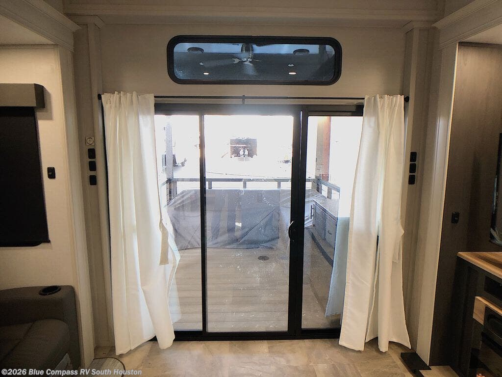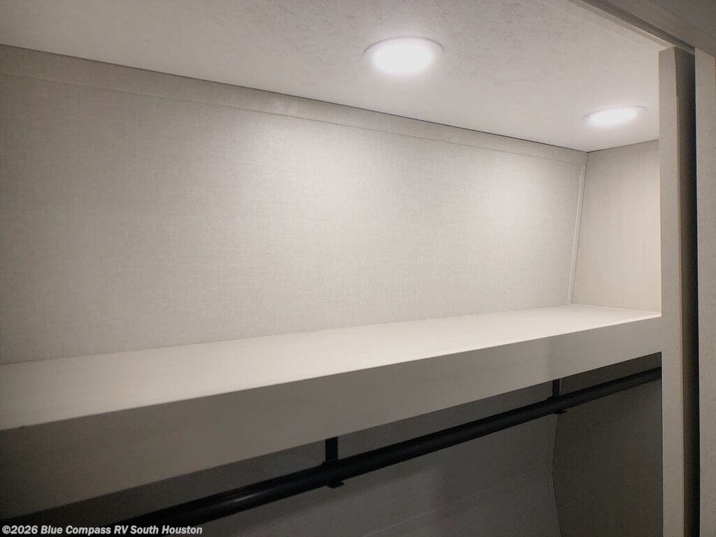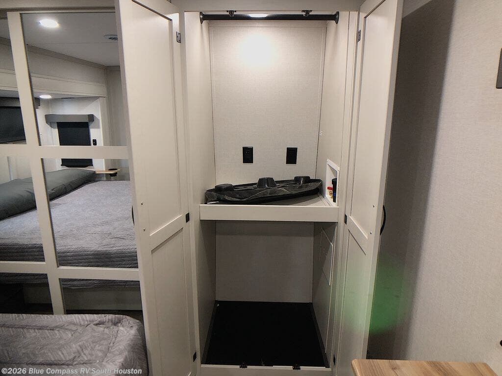 Step outside and enjoy the fresh air on our covered patio, complete with a refrigerator and optional L-shaped sofa, which is the perfect place to relax and unwind after a long day of adventure. Inside, the kitchen/living room area will make you feel an at-home experience, featuring overhead cabinets, an entertainment center, theater seating, a free-spanning table, a kitchen island, a microwave, a refrigerator, and a pantry. Perfect for cooking up a storm, entertaining friends and family, or simply relaxing and enjoying the comforts of home. The full bathroom is a spacious oasis, complete with a shower with a seat, a linen closet, and more. Plus, with a front bedroom featuring a king bed, dresser, washer and dryer prep, and a large wardrobe, you'll have the perfect place to rest and recharge after a long day of adventure. With two entry/exit doors and a massive 20’ awning, you'll have easy access to the RV and plenty of shade and protection from the weather.