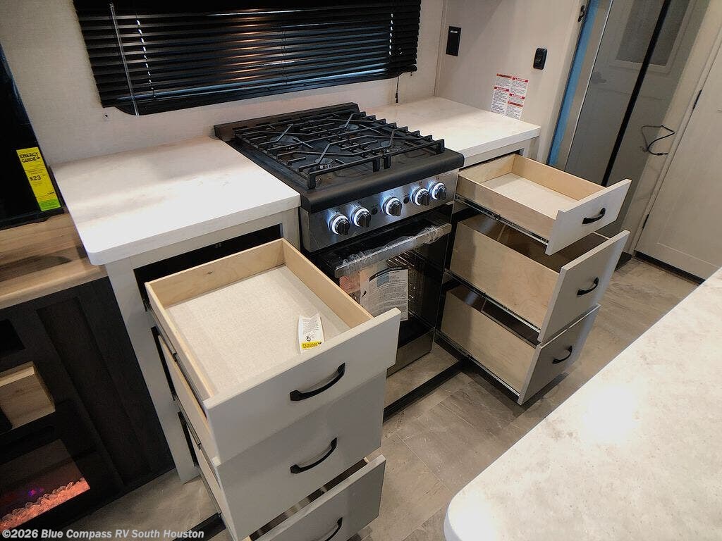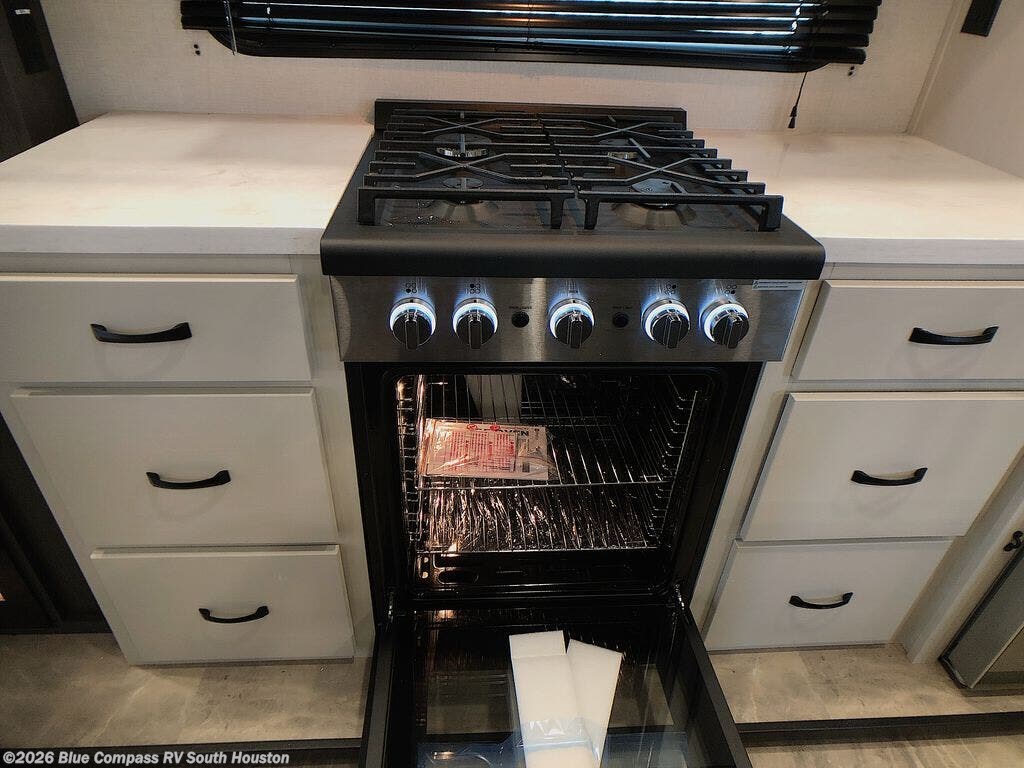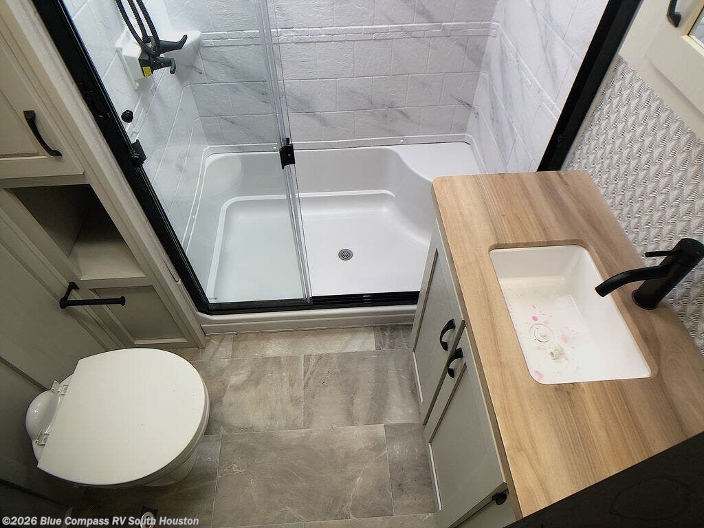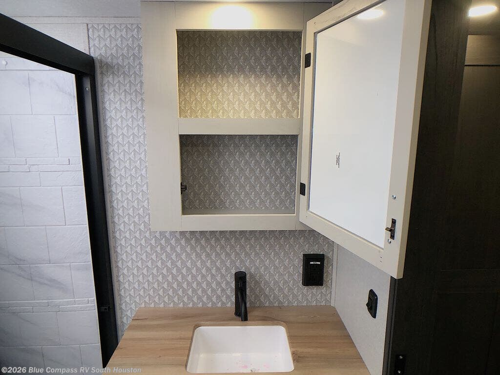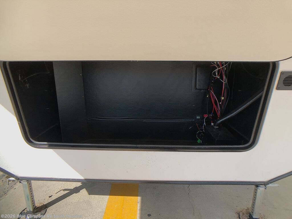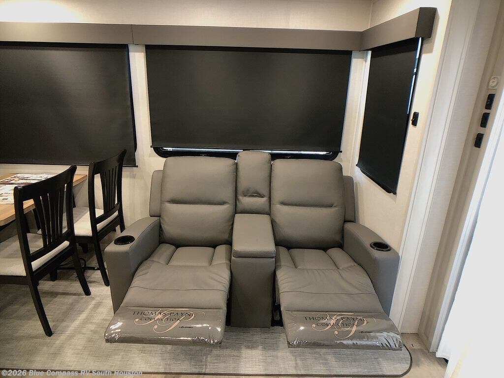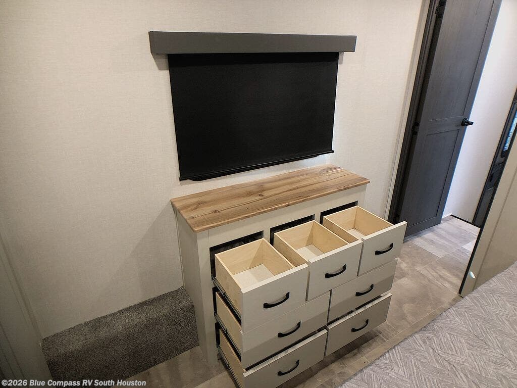 Step outside and enjoy the fresh air on our covered patio, complete with a refrigerator and optional L-shaped sofa, which is the perfect place to relax and unwind after a long day of adventure. Inside, the kitchen/living room area will make you feel an at-home experience, featuring overhead cabinets, an entertainment center, theater seating, a free-spanning table, a kitchen island, a microwave, a refrigerator, and a pantry. Perfect for cooking up a storm, entertaining friends and family, or simply relaxing and enjoying the comforts of home. The full bathroom is a spacious oasis, complete with a shower with a seat, a linen closet, and more. Plus, with a front bedroom featuring a king bed, dresser, washer and dryer prep, and a large wardrobe, you'll have the perfect place to rest and recharge after a long day of adventure. With two entry/exit doors and a massive 20’ awning, you'll have easy access to the RV and plenty of shade and protection from the weather.