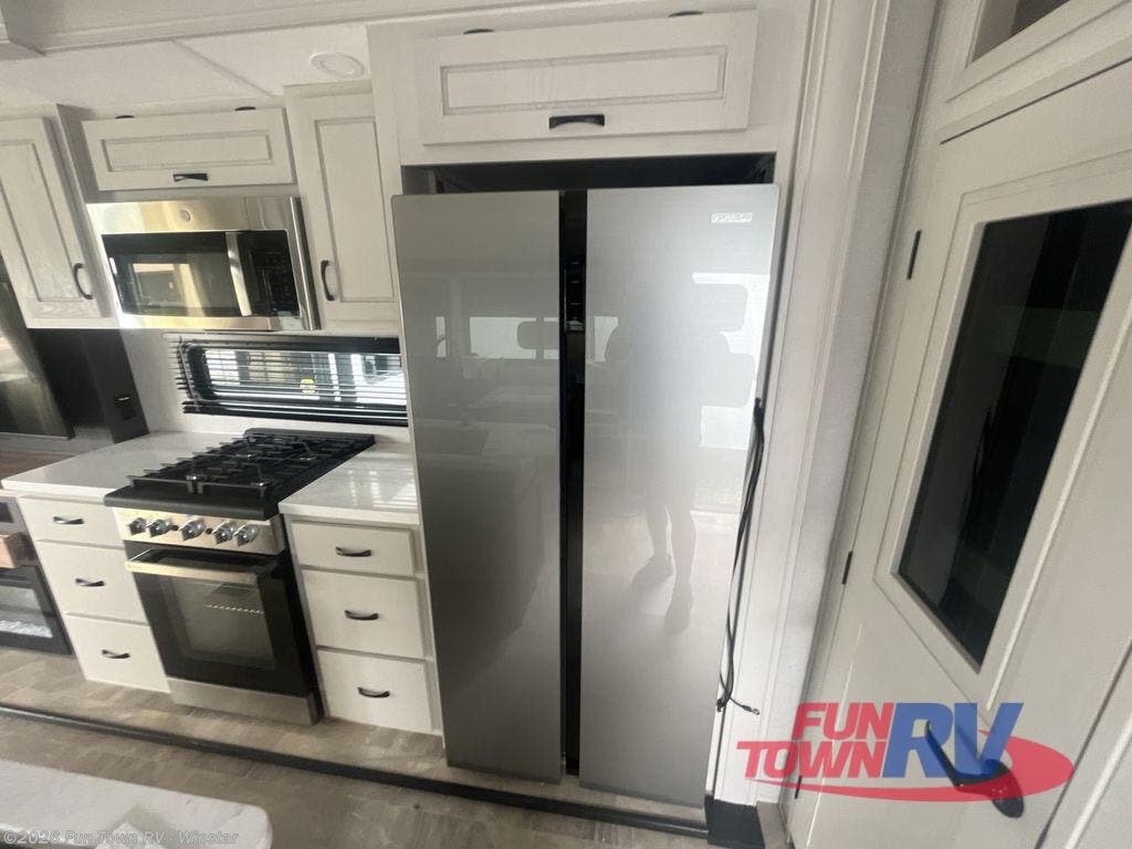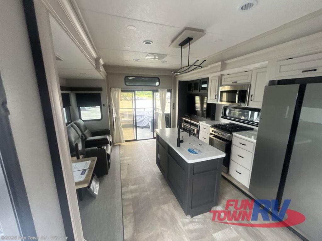 Step outside and enjoy the fresh air on our covered patio, complete with a refrigerator and optional L-shaped sofa, which is the perfect place to relax and unwind after a long day of adventure. Inside, the kitchen/living room area will make you feel an at-home experience, featuring overhead cabinets, an entertainment center, theater seating, a free-spanning table, a kitchen island, a microwave, a refrigerator, and a pantry. Perfect for cooking up a storm, entertaining friends and family, or simply relaxing and enjoying the comforts of home. The full bathroom is a spacious oasis, complete with a shower with a seat, a linen closet, and more. Plus, with a front bedroom featuring a king bed, dresser, washer and dryer prep, and a large wardrobe, you'll have the perfect place to rest and recharge after a long day of adventure. With two entry/exit doors and a massive 20’ awning, you'll have easy access to the RV and plenty of shade and protection from the weather.