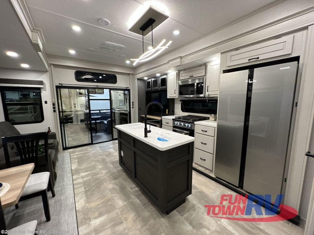 Step outside and enjoy the fresh air on our covered patio, complete with a refrigerator and optional L-shaped sofa, which is the perfect place to relax and unwind after a long day of adventure. Inside, the kitchen/living room area will make you feel an at-home experience, featuring overhead cabinets, an entertainment center, theater seating, a free-spanning table, a kitchen island, a microwave, a refrigerator, and a pantry. Perfect for cooking up a storm, entertaining friends and family, or simply relaxing and enjoying the comforts of home. The full bathroom is a spacious oasis, complete with a shower with a seat, a linen closet, and more. Plus, with a front bedroom featuring a king bed, dresser, washer and dryer prep, and a large wardrobe, you'll have the perfect place to rest and recharge after a long day of adventure. With two entry/exit doors and a massive 20’ awning, you'll have easy access to the RV and plenty of shade and protection from the weather.
