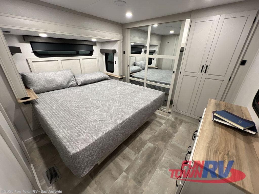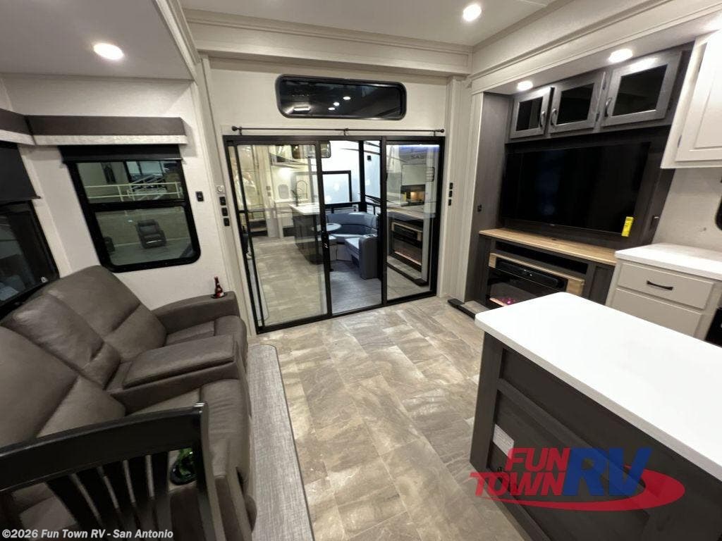 Step outside and enjoy the fresh air on our covered patio, complete with a refrigerator and optional L-shaped sofa, which is the perfect place to relax and unwind after a long day of adventure. Inside, the kitchen/living room area will make you feel an at-home experience, featuring overhead cabinets, an entertainment center, theater seating, a free-spanning table, a kitchen island, a microwave, a refrigerator, and a pantry. Perfect for cooking up a storm, entertaining friends and family, or simply relaxing and enjoying the comforts of home. The full bathroom is a spacious oasis, complete with a shower with a seat, a linen closet, and more. Plus, with a front bedroom featuring a king bed, dresser, washer and dryer prep, and a large wardrobe, you'll have the perfect place to rest and recharge after a long day of adventure. With two entry/exit doors and a massive 20’ awning, you'll have easy access to the RV and plenty of shade and protection from the weather.