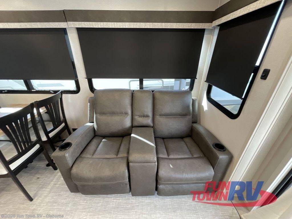 Step outside and enjoy the fresh air on our covered patio, complete with a refrigerator and optional L-shaped sofa, which is the perfect place to relax and unwind after a long day of adventure. Inside, the kitchen/living room area will make you feel an at-home experience, featuring overhead cabinets, an entertainment center, theater seating, a free-spanning table, a kitchen island, a microwave, a refrigerator, and a pantry. Perfect for cooking up a storm, entertaining friends and family, or simply relaxing and enjoying the comforts of home. The full bathroom is a spacious oasis, complete with a shower with a seat, a linen closet, and more. Plus, with a front bedroom featuring a king bed, dresser, washer and dryer prep, and a large wardrobe, you'll have the perfect place to rest and recharge after a long day of adventure. With two entry/exit doors and a massive 20’ awning, you'll have easy access to the RV and plenty of shade and protection from the weather.