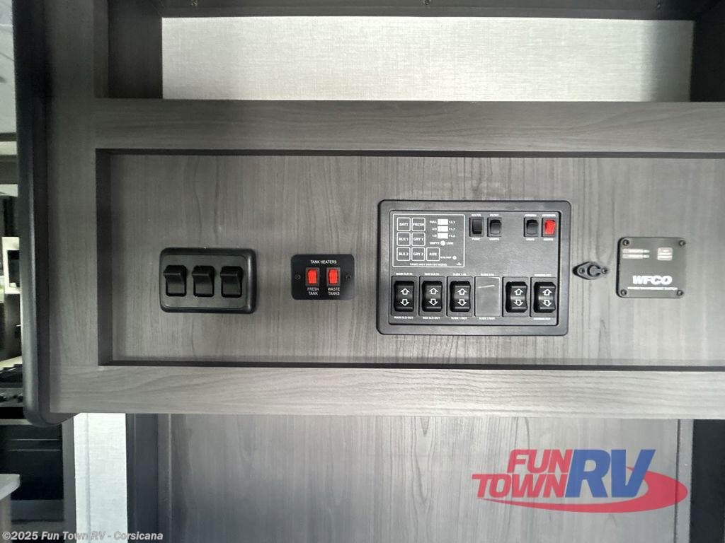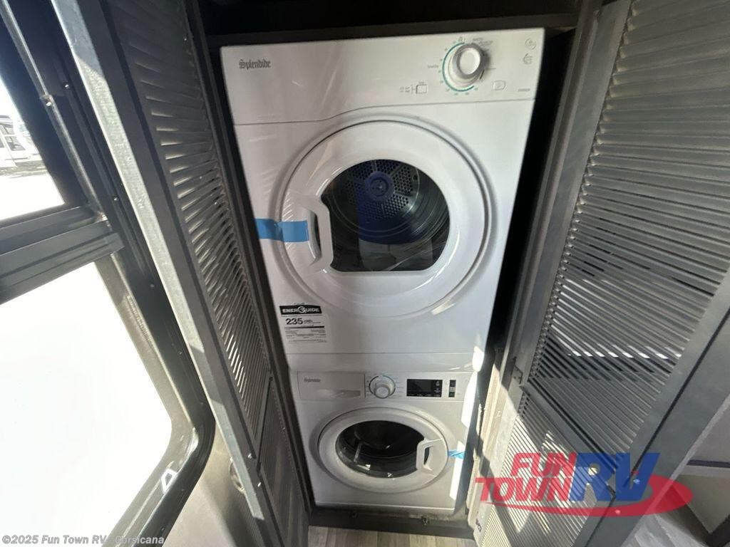 The rear living room is the perfect place to unwind, featuring a 78” trifold sofa, theater seating, overhead cabinets, and an entertainment center. Whether you're watching a movie, reading a book, or simply enjoying the company of loved ones, this room has everything you need to relax and recharge. The spacious kitchen is fitted with a kitchen island, refrigerator, microwave, free-standing table, hutch, and overhead cabinets. Perfect for preparing your favorite meals and enjoy with family. With a convenient coat bench, desk with flip-up storage, washer, and dryer, you'll have everything you need to stay organized and comfortable on the go. The full bathroom is an enormous oasis with a linen closet for added convenience. Also with a front bedroom featuring a king bed, dresser, shelves, and wardrobe, you'll have the perfect place to rest and recharge after a long day of adventure, also plenty of space for storing all your belongings and staying organized on the road.