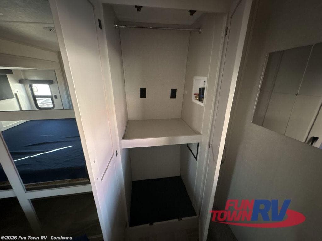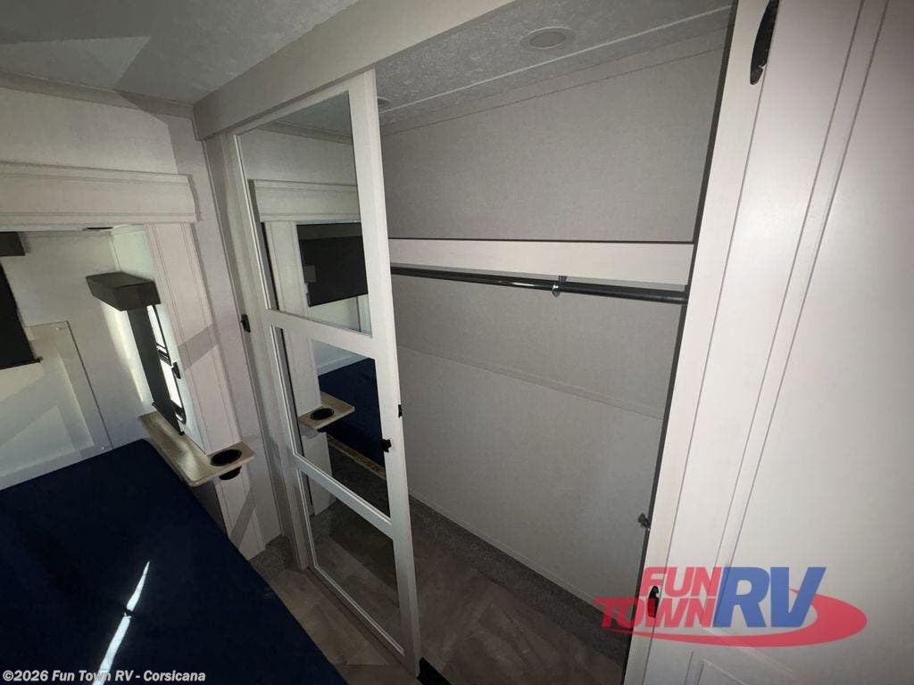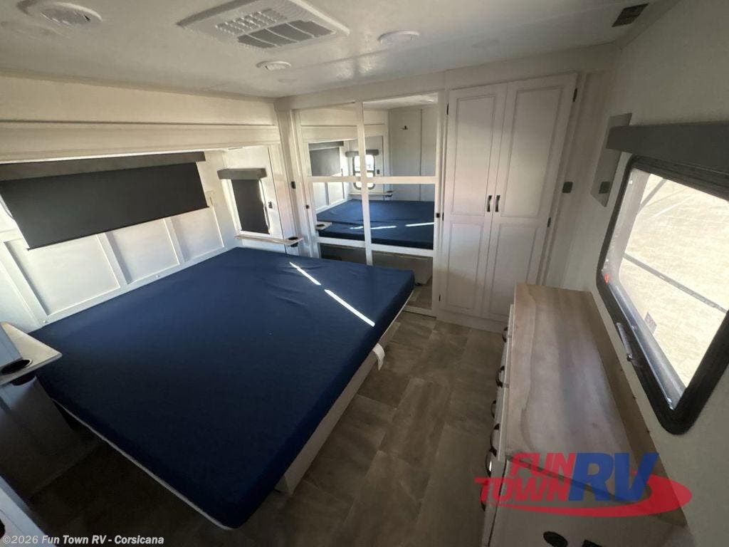 This family-friendly fifth wheel can sleep six to eight comfortably between the king bed, the tri-fold sofa, and the middle bunkhouse with a loft above! There is plenty of counter space in the bunkhouse, plus a sofa with a removable table and a wardrobe for clothes. The kitchen is any chef's dream with its residential cooktop, 12V refrigerator, and kitchen island for more counter space. While dinner is being made, you can play a game of cards at the free-standing table, relax on the tri-fold sofa, or visit outdoors under the 20' power awning with LED lights. You won't be left wanting for storage space in this model thanks to the overhead cabinets, plus the bedroom dresser and large wardrobe. There is even a wardrobe with washer and dryer prep if you choose to go full-time!