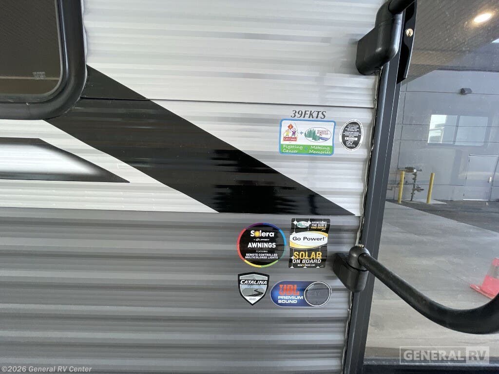 Coachmen Catalina Destination Series destination trailer 39FKTS highlights: Private Bunkhouse Dual Entry Breakfast Bar Residential Refrigerator Three Slides Fireplace Pack up your clothes and groceries and head out for a long weekend at your own place with this destination trailer! You can enter through the main patio door or near the rear bedroom and full bathroom. You will find storage throughout in the wardrobes, linen cabinet, pantry and more! The kids will surely head to the middle bunkhouse featuring a jackknife sofa with a flip-up bunk and storage totes beneath. Someone will probably relax on the theater seating by the fireplace, or you can all play a game at the booth dinette. The ceiling fans will keep you cooler in the summer months along with the air conditioner. And the cook will love the front kitchen layout and all the appliances to keep everyone fed. With any Catalina Destination trailer by Coachmen, you will enjoy comfortable extended stays wherever you decide to set up camp! The full length frame outriggers add strength to each unit, along with a seamless Alpha Roof membrane and Norco electromagnetic, powder coated chassis. You will love the open views provided by the large front bay windows, plus there are GE appliances, woodplank linoleum flooring, and hard valance window treatments to make your space feel more like home. Head outside to find a convenient "Leash Link" quick hookup D-ring for your furry friends, premium JBL exterior speakers, flush mount baggage doors for your gear, and the list of amenities goes on!