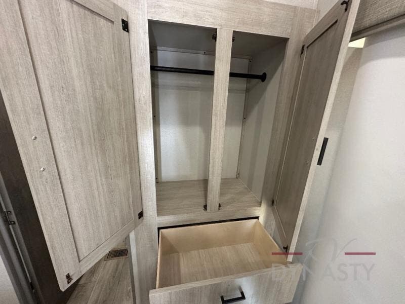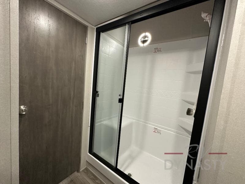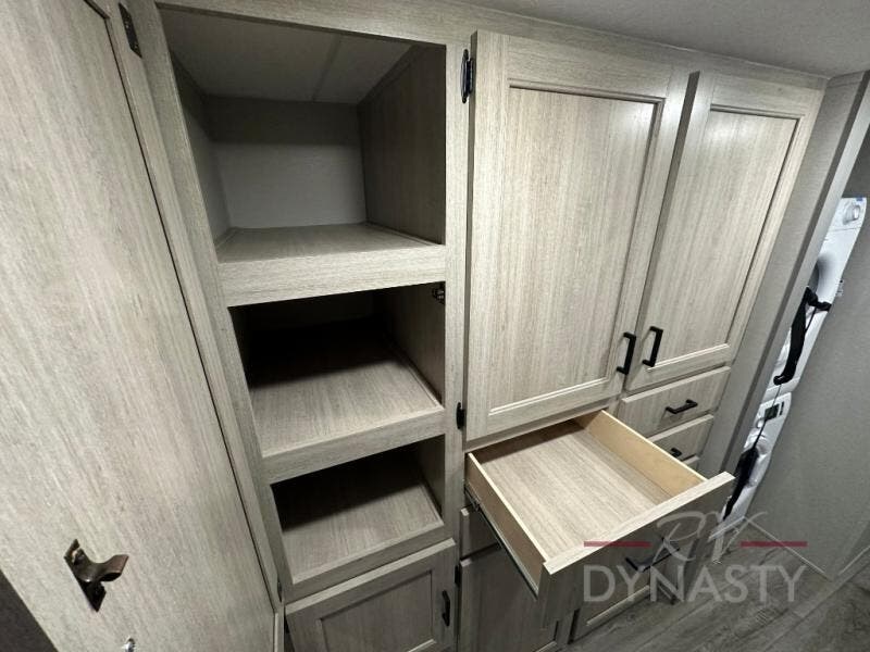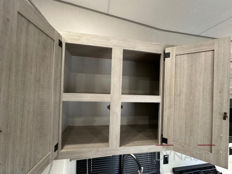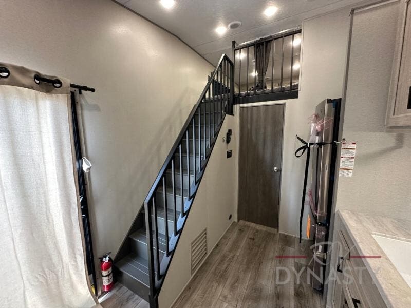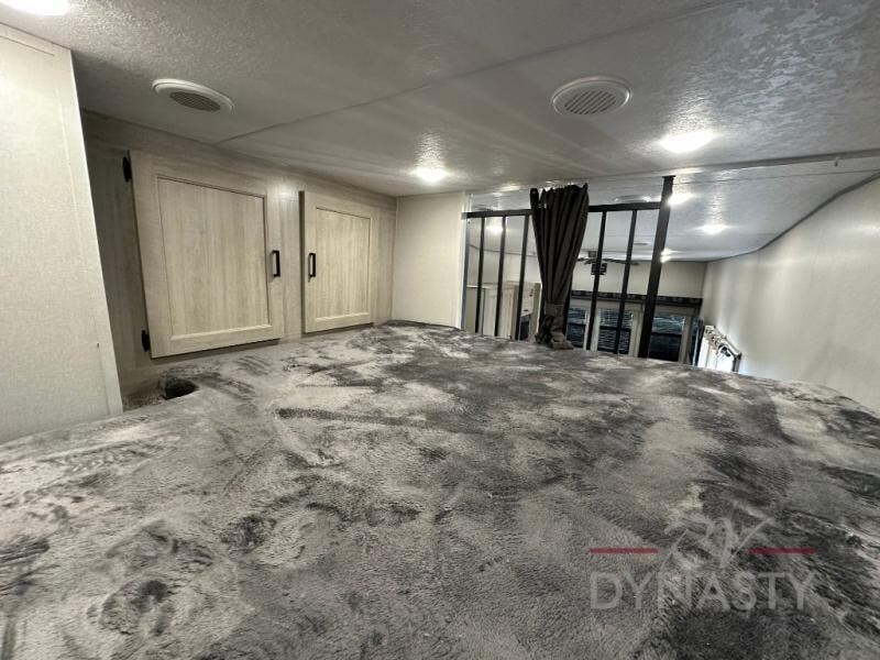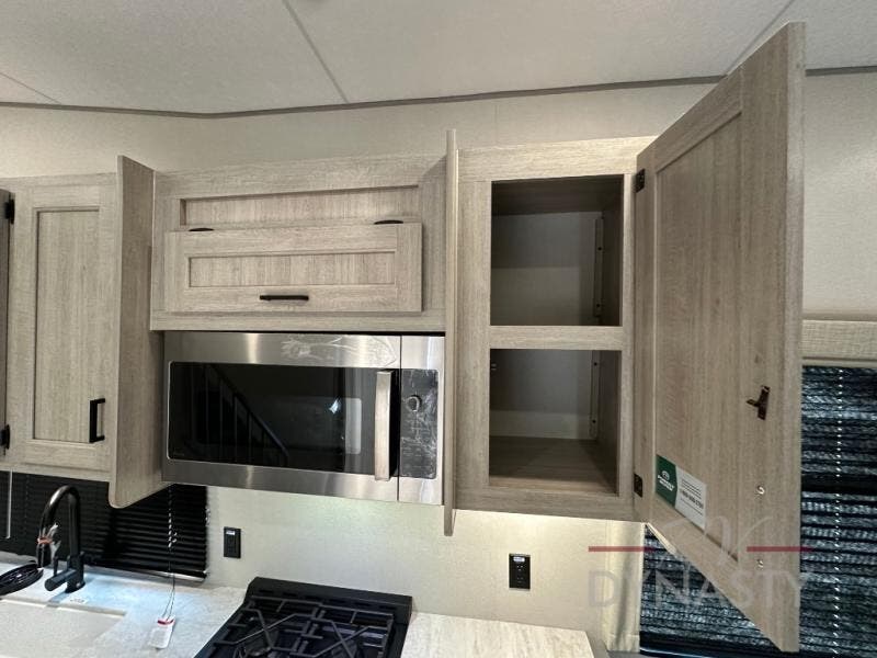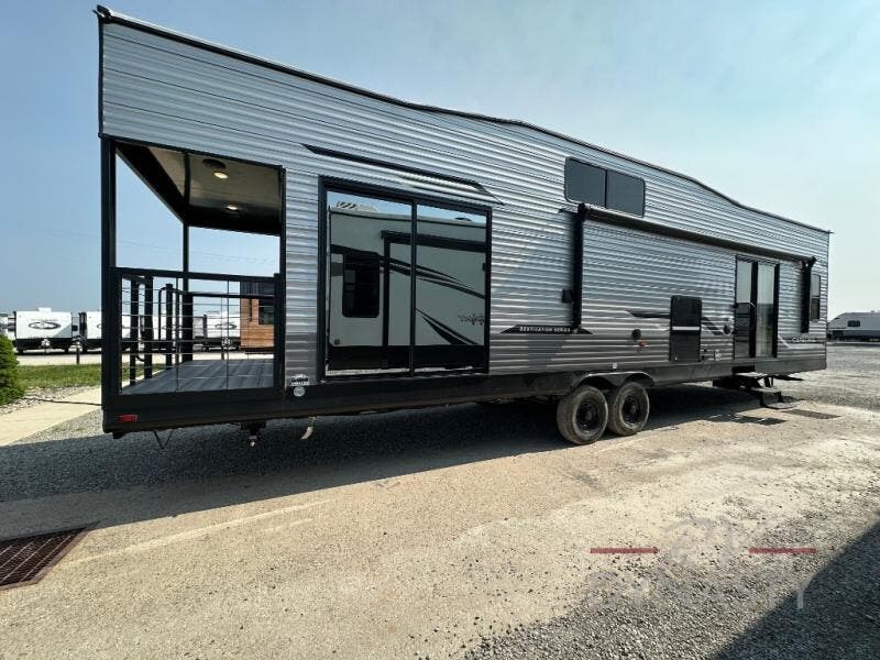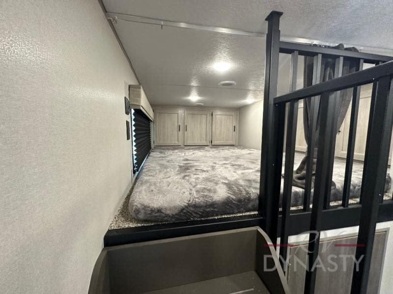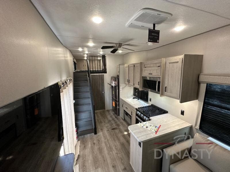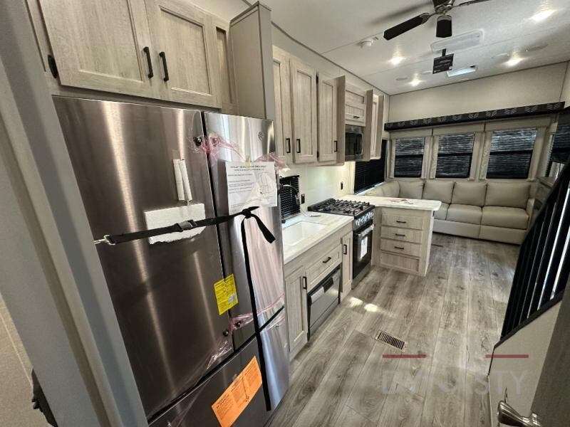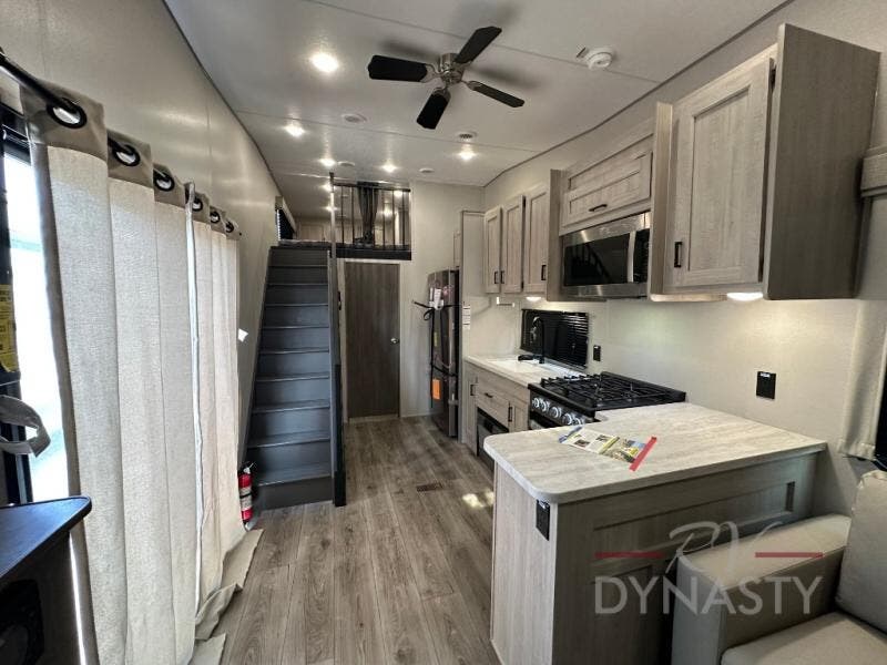 Plan to stay awhile in this spacious destination trailer with a loft! The loft includes cabinets so the little ones can keep their things picked up, and you'll appreciate tons of storage on the main level as well. You'll find your own space in the rear bedroom that includes a patio door that leads to the covered porch, a 60" x 74" queen bed, a wardrobe with drawers, plus a high ceiling that will make this space feel more open. There is a 48" x 30" shower with a seat to freshen up each day and a private toilet and sink so two people can use this space at once, or you can shut the two main doors to make one big bathroom! The front living area will be a favorite place to hang out since there is an L-shaped sectional sofa, and the full kitchen will allow you to make your best meals while you're away from home. The high kitchen/living room ceiling is another great feature on this unit, making your space more open!