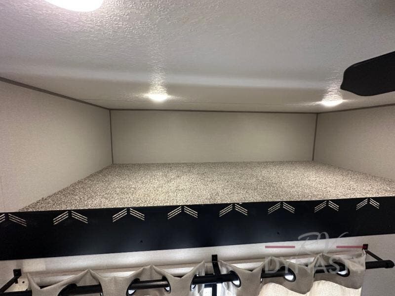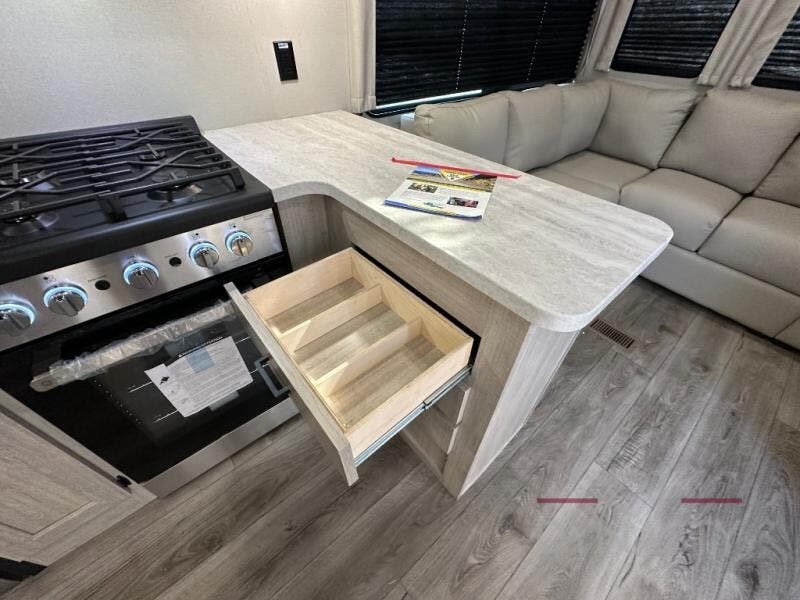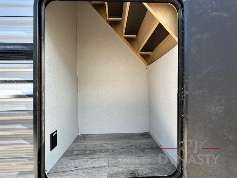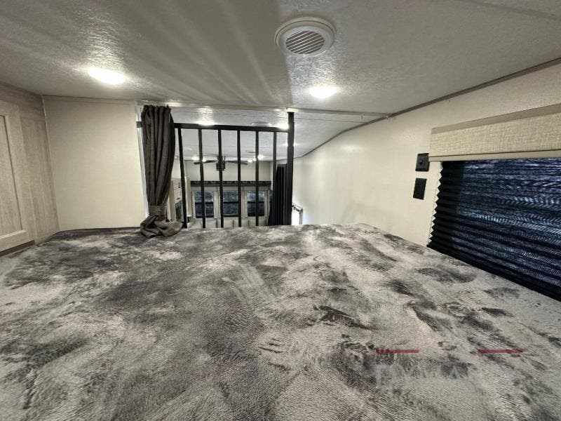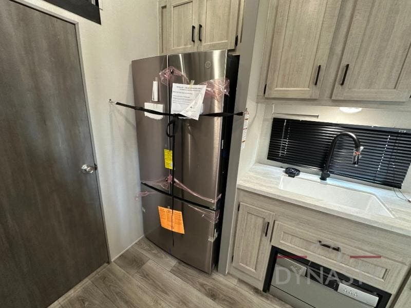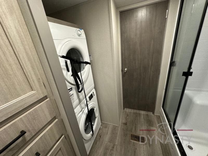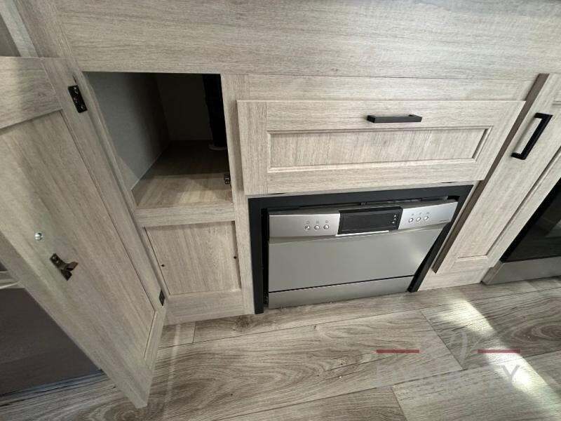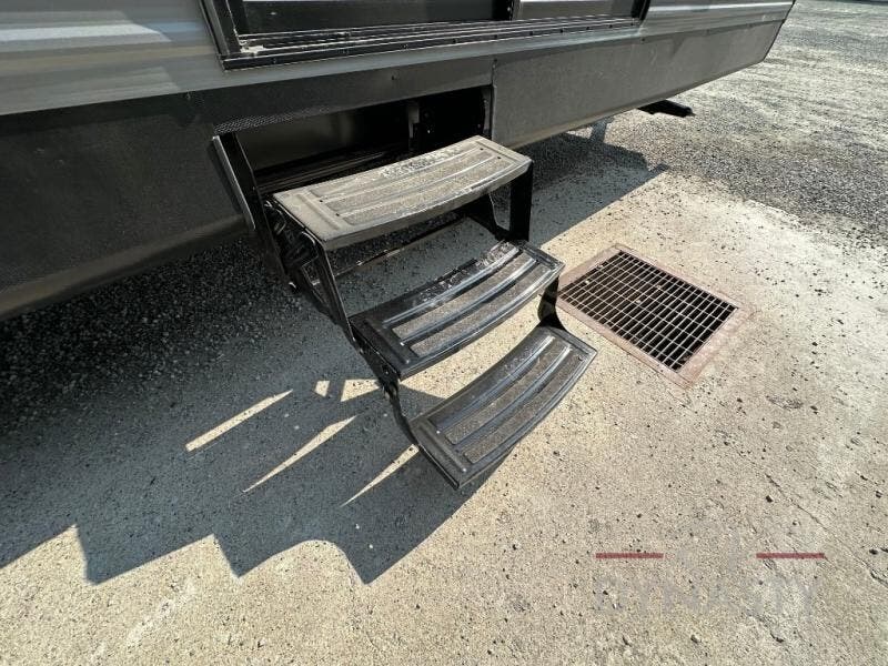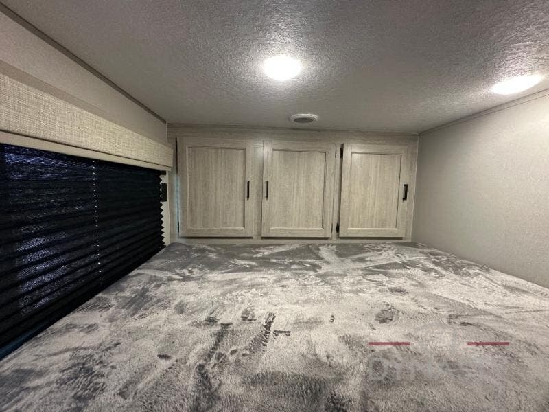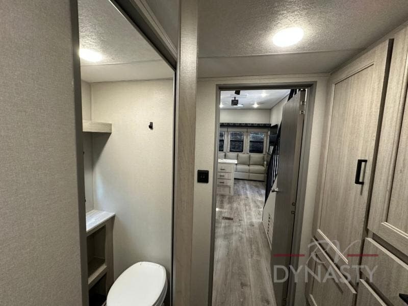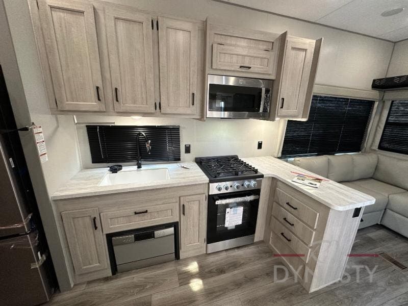 Plan to stay awhile in this spacious destination trailer with a loft! The loft includes cabinets so the little ones can keep their things picked up, and you'll appreciate tons of storage on the main level as well. You'll find your own space in the rear bedroom that includes a patio door that leads to the covered porch, a 60" x 74" queen bed, a wardrobe with drawers, plus a high ceiling that will make this space feel more open. There is a 48" x 30" shower with a seat to freshen up each day and a private toilet and sink so two people can use this space at once, or you can shut the two main doors to make one big bathroom! The front living area will be a favorite place to hang out since there is an L-shaped sectional sofa, and the full kitchen will allow you to make your best meals while you're away from home. The high kitchen/living room ceiling is another great feature on this unit, making your space more open!