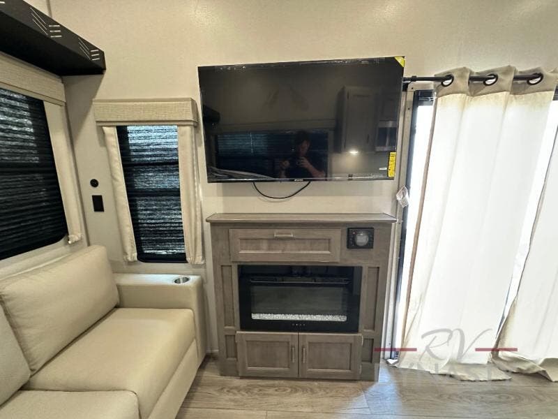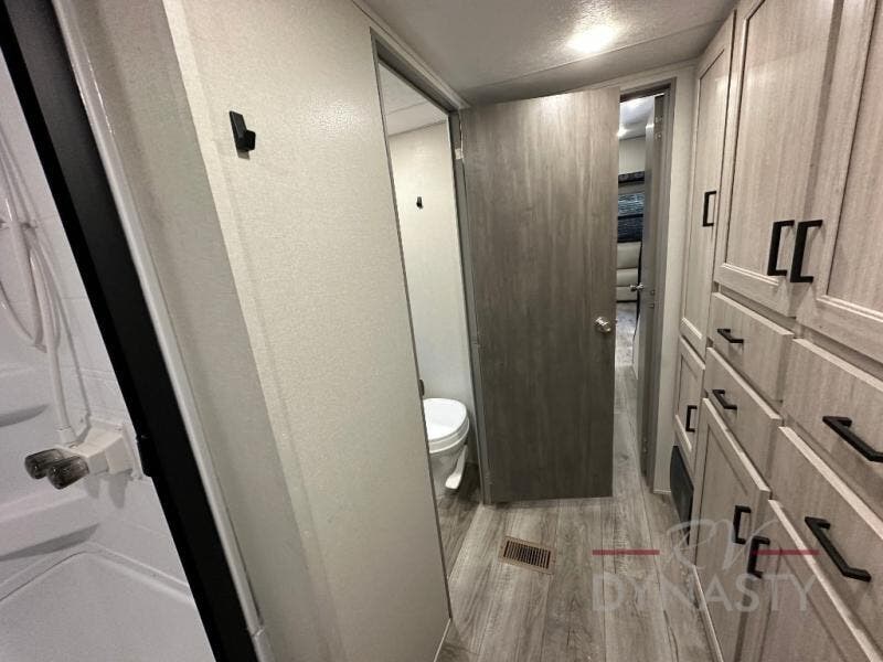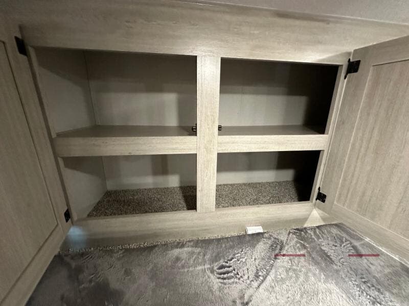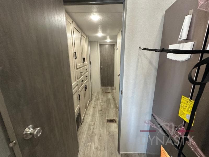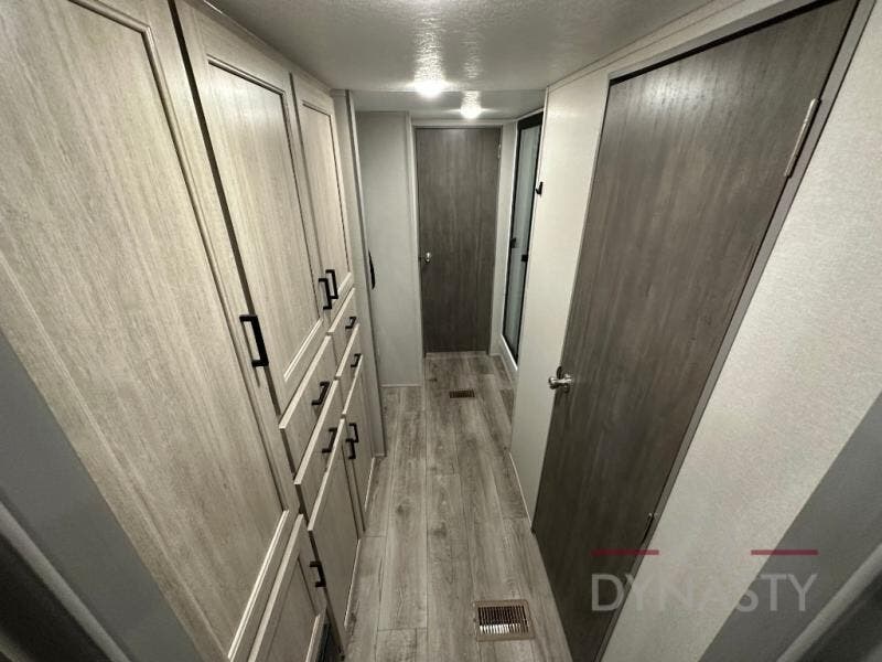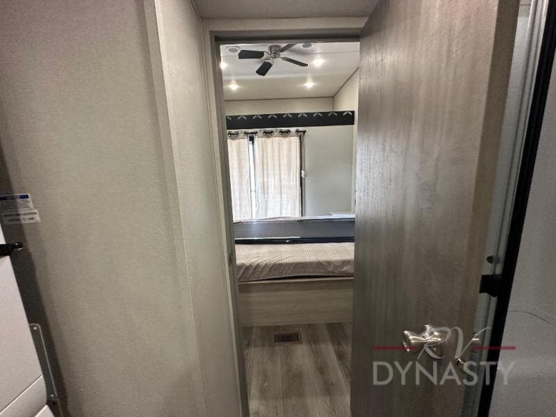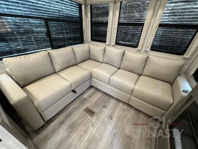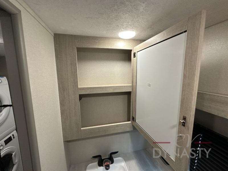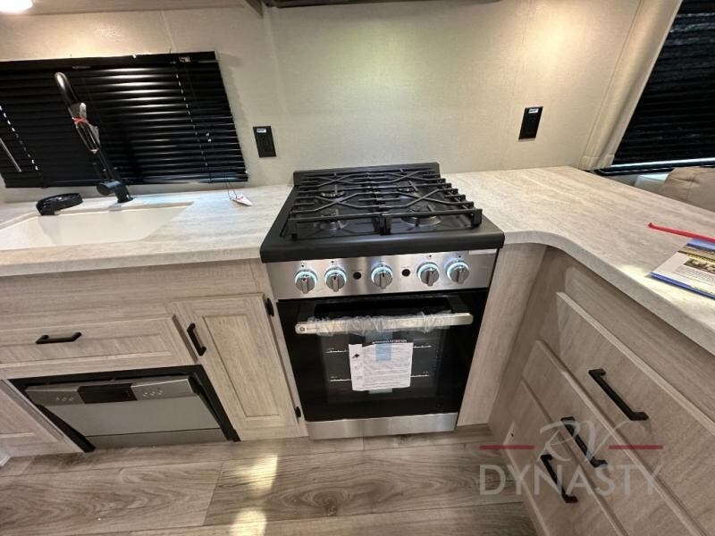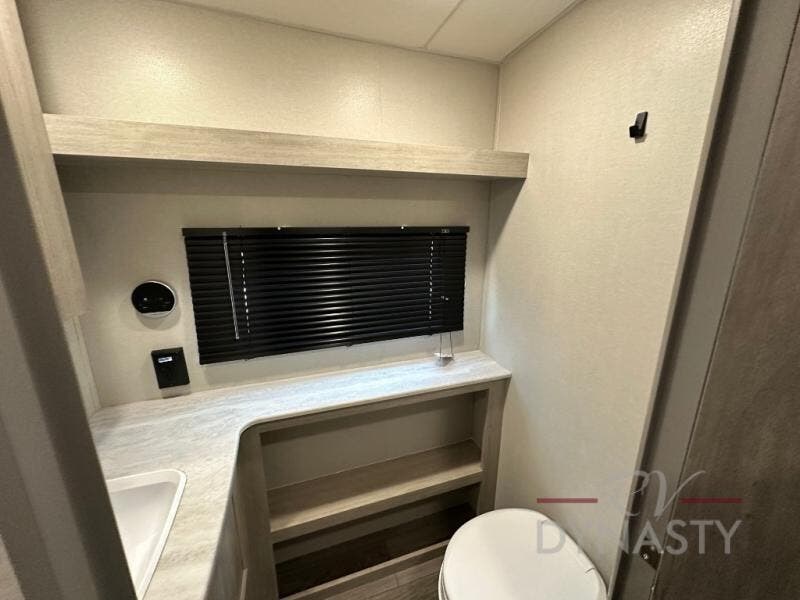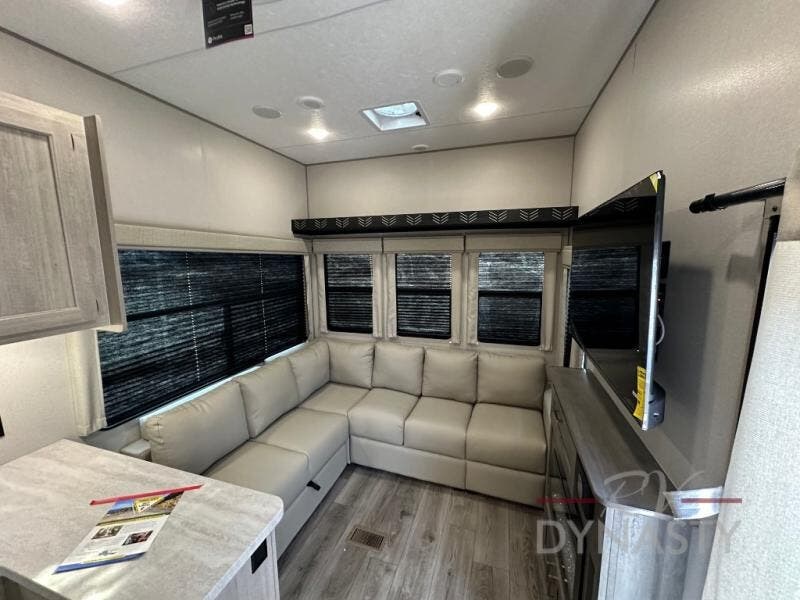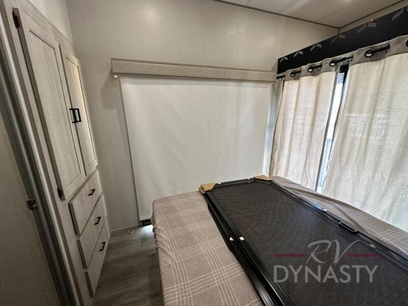 Plan to stay awhile in this spacious destination trailer with a loft! The loft includes cabinets so the little ones can keep their things picked up, and you'll appreciate tons of storage on the main level as well. You'll find your own space in the rear bedroom that includes a patio door that leads to the covered porch, a 60" x 74" queen bed, a wardrobe with drawers, plus a high ceiling that will make this space feel more open. There is a 48" x 30" shower with a seat to freshen up each day and a private toilet and sink so two people can use this space at once, or you can shut the two main doors to make one big bathroom! The front living area will be a favorite place to hang out since there is an L-shaped sectional sofa, and the full kitchen will allow you to make your best meals while you're away from home. The high kitchen/living room ceiling is another great feature on this unit, making your space more open!