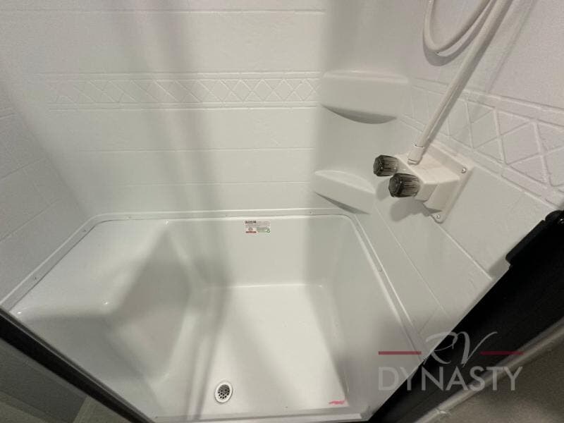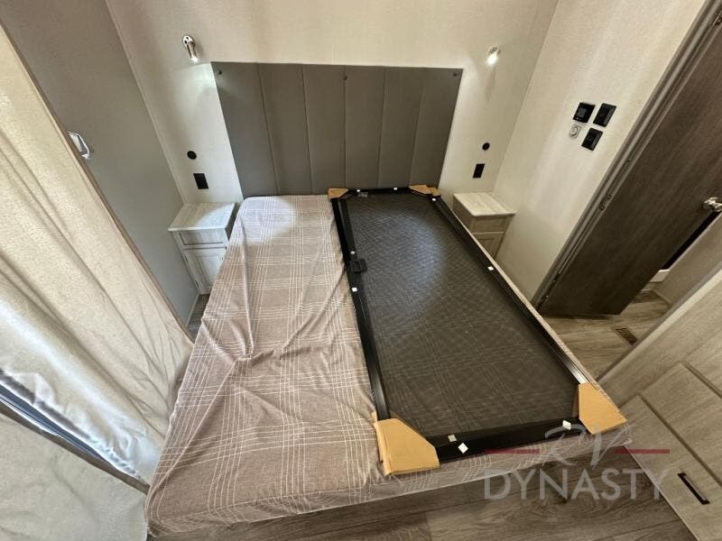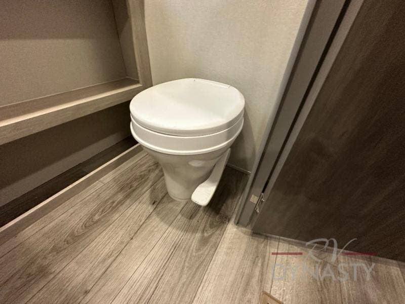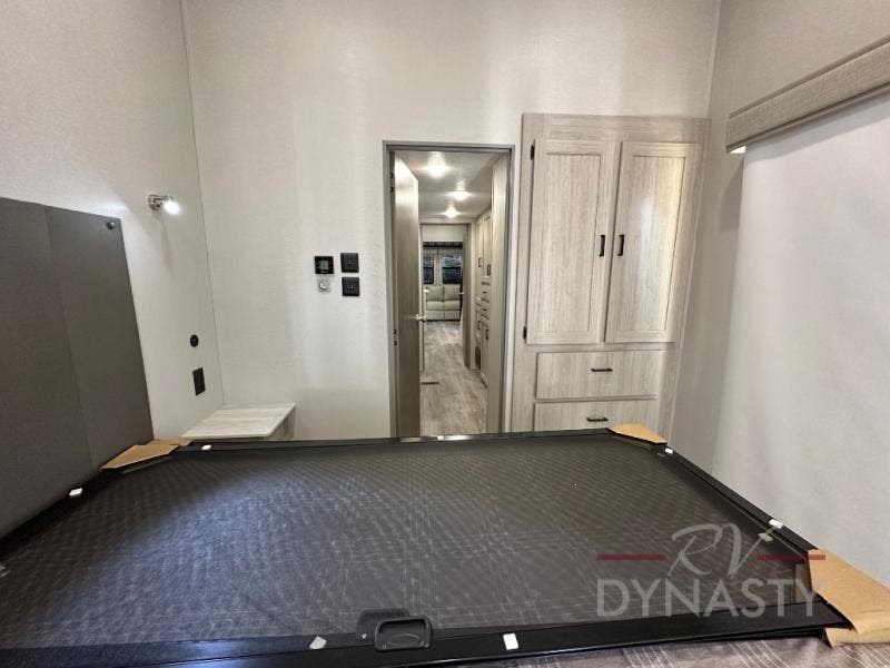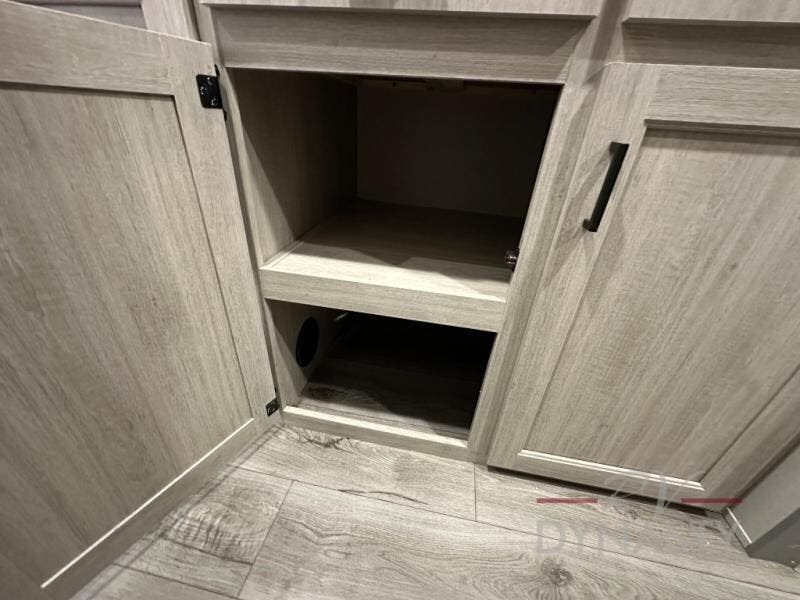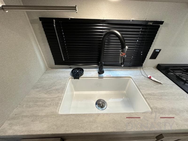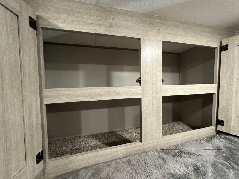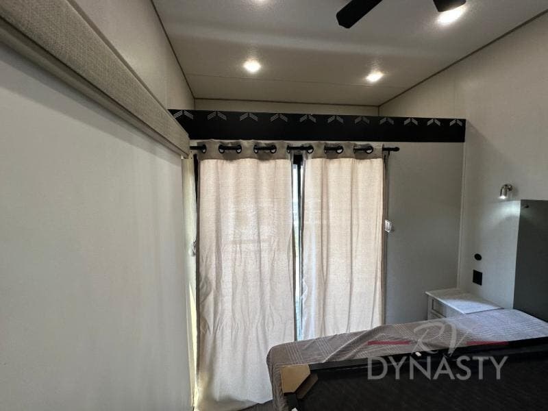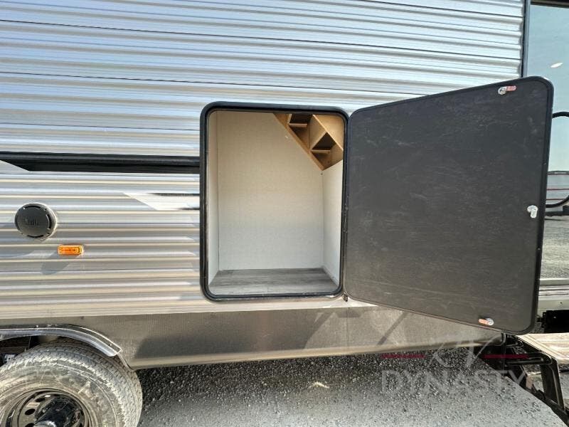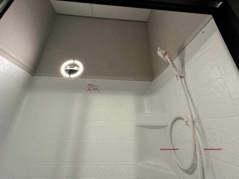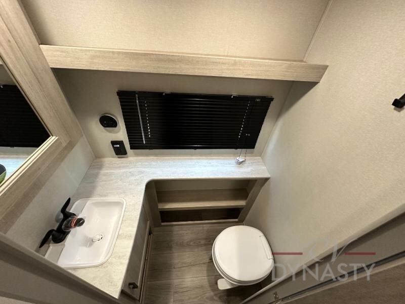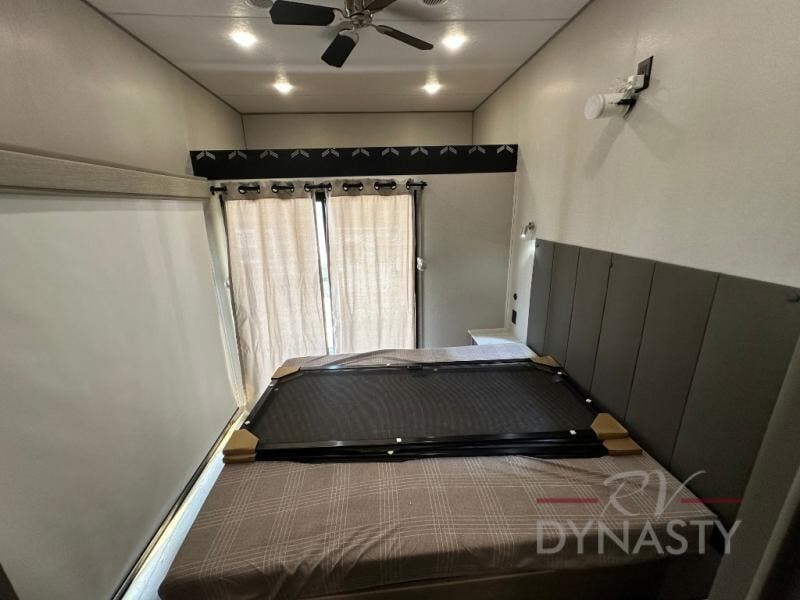 Plan to stay awhile in this spacious destination trailer with a loft! The loft includes cabinets so the little ones can keep their things picked up, and you'll appreciate tons of storage on the main level as well. You'll find your own space in the rear bedroom that includes a patio door that leads to the covered porch, a 60" x 74" queen bed, a wardrobe with drawers, plus a high ceiling that will make this space feel more open. There is a 48" x 30" shower with a seat to freshen up each day and a private toilet and sink so two people can use this space at once, or you can shut the two main doors to make one big bathroom! The front living area will be a favorite place to hang out since there is an L-shaped sectional sofa, and the full kitchen will allow you to make your best meals while you're away from home. The high kitchen/living room ceiling is another great feature on this unit, making your space more open!