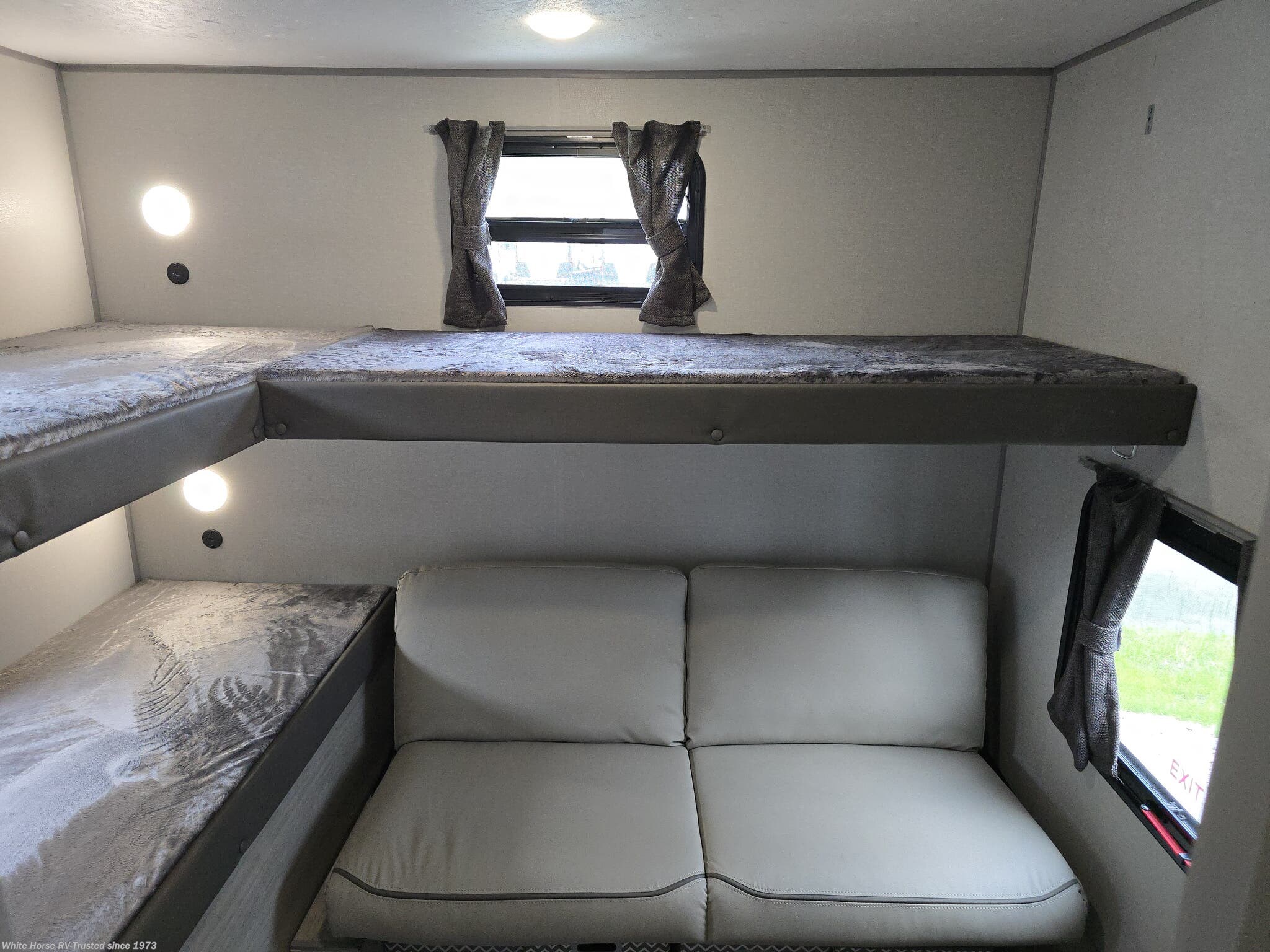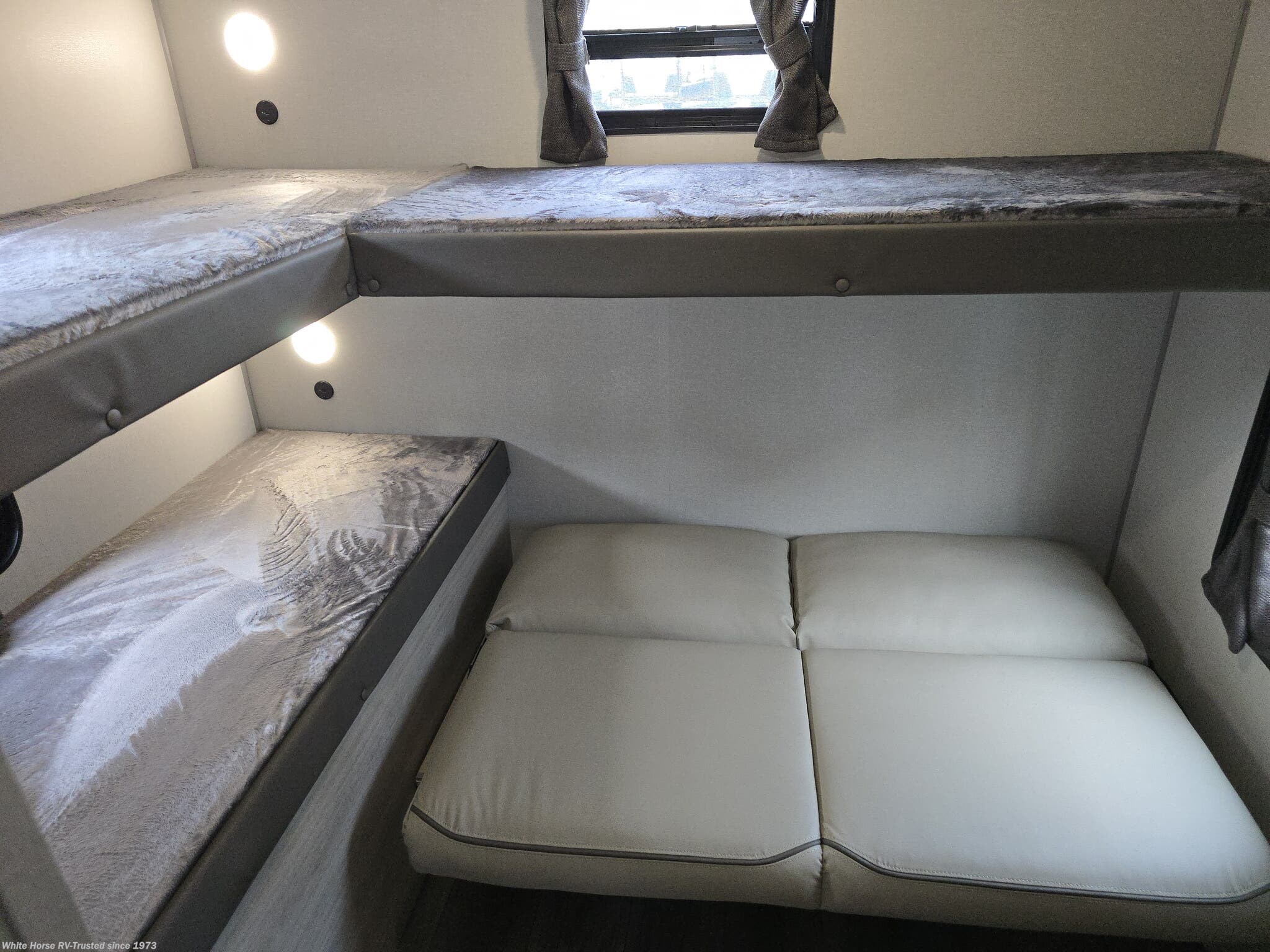 Spacious private bunkhouse with slide-out, two bunk beds, jackknife sofa, entertainment center, and tons of storage—perfect for kids or guests