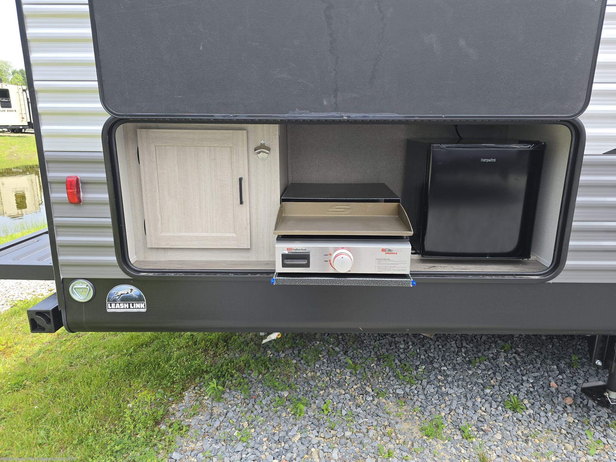Outside camper kitchen with pull-out griddle, sink, cabinet storage, and second refrigerator