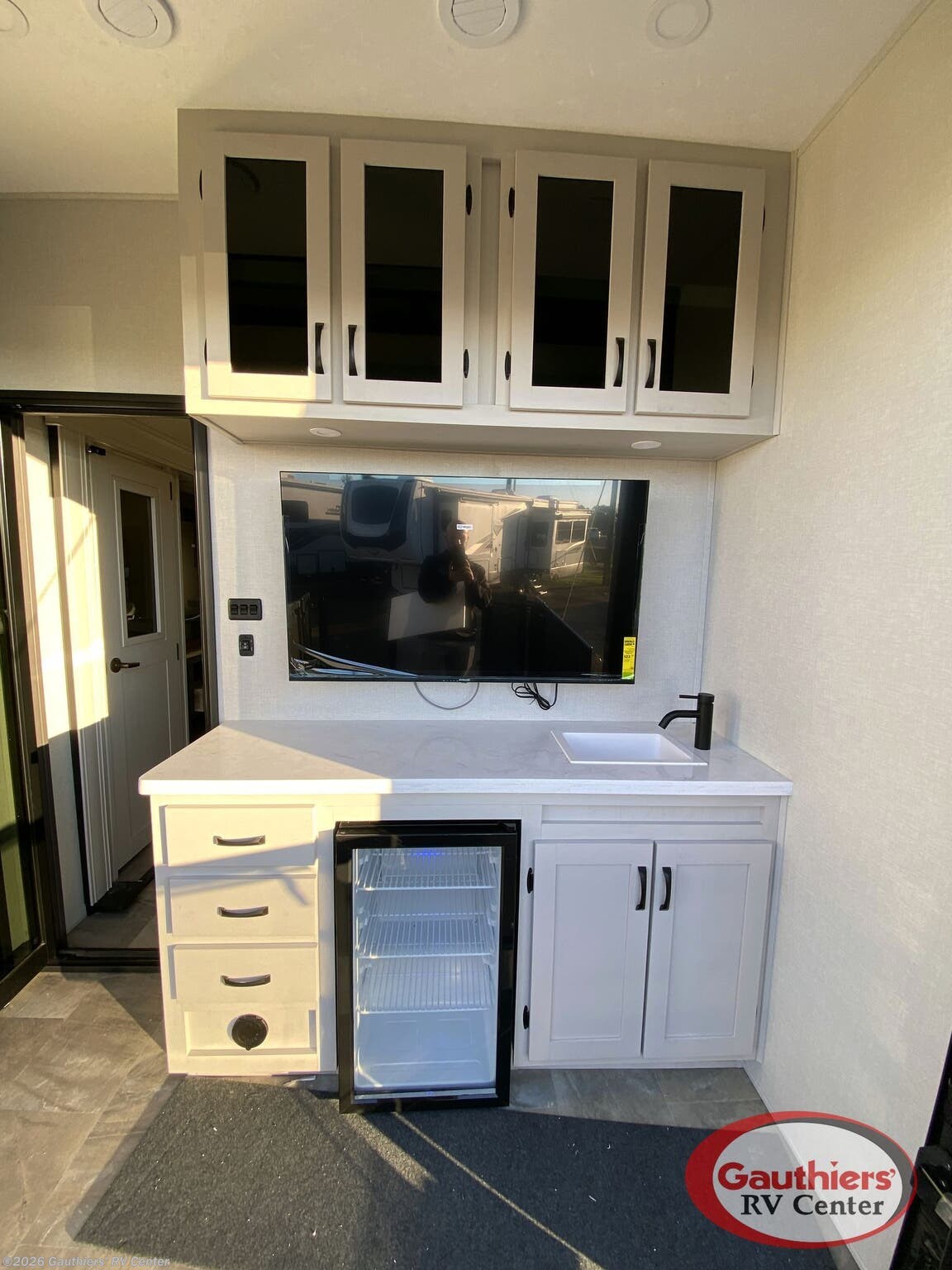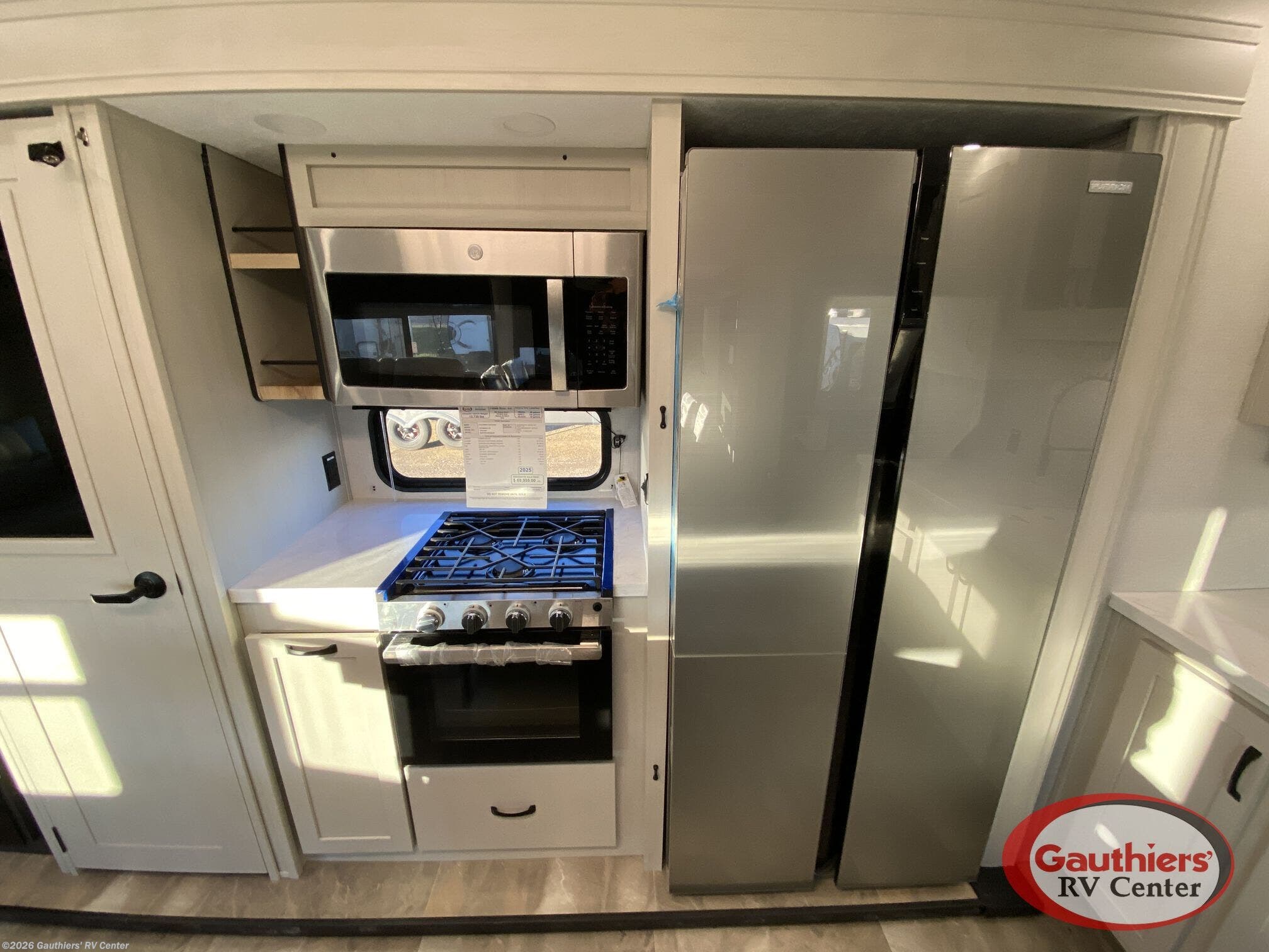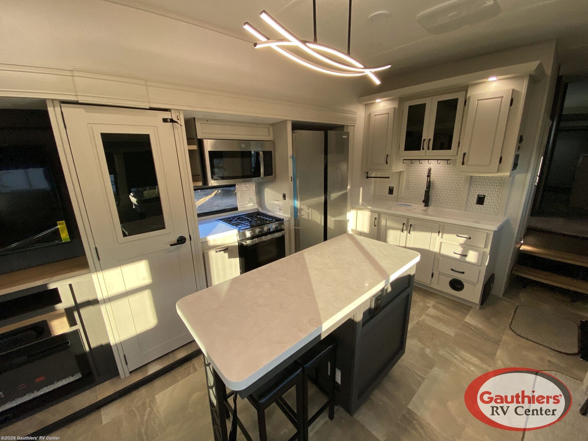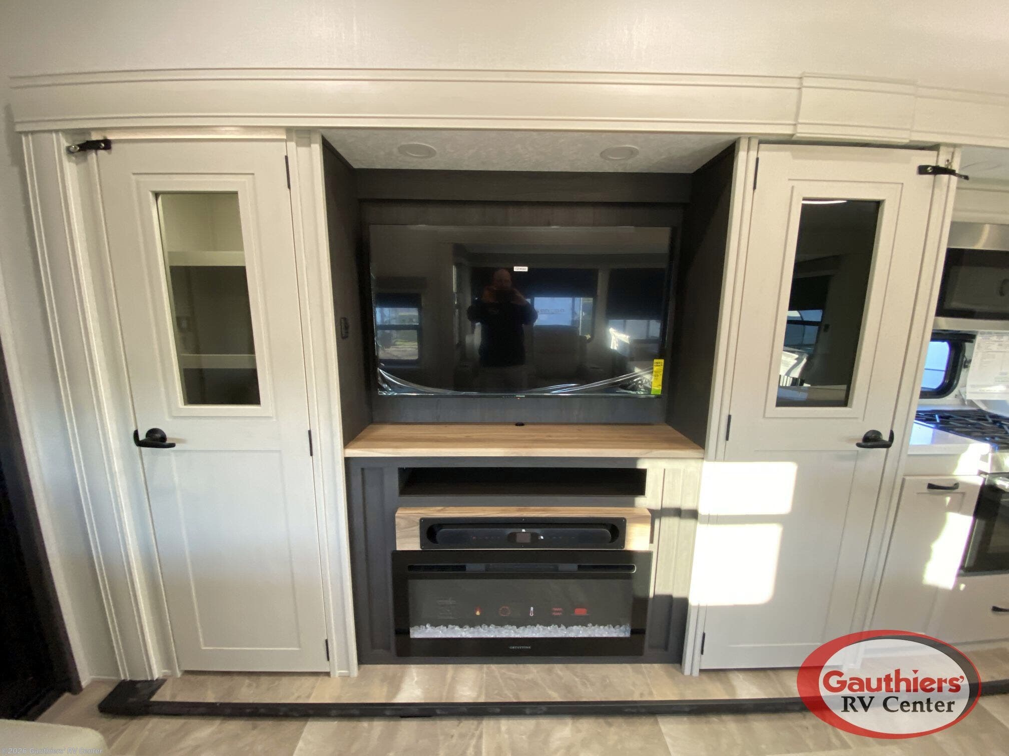 TRIPLE SLIDE REAR LIVING REAR DECK FIFTH WHEEL WITH THREE A/C UNITS, AUTO LEVELING, THEATER SEATING, FIREPLACE, KING SIZE BED, WASHER-DRYER PREP, AND 12 VOLT 16 CU FT REFRIGERATOR.