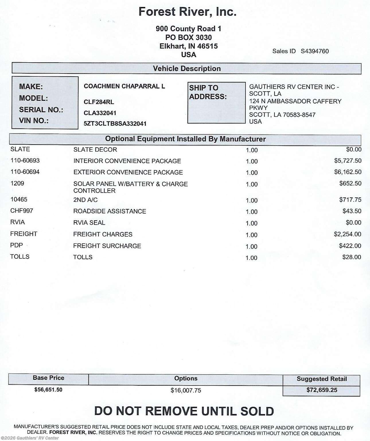 Request More Info on this 2025 Coachmen Chaparral Lite 284RL Offered for sale by Gauthiers' RV Center