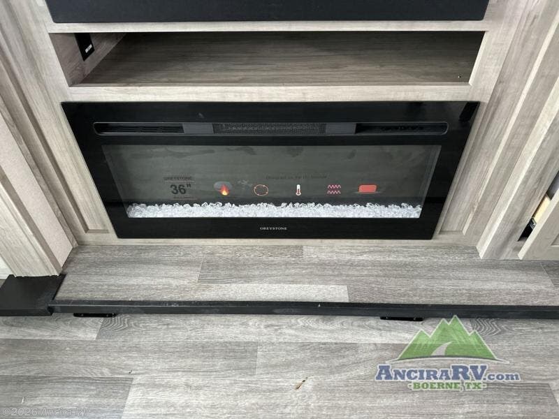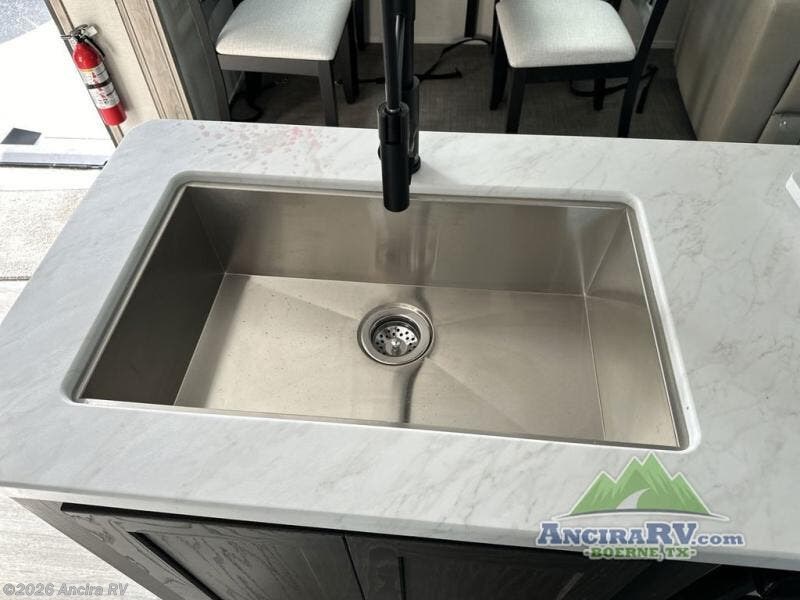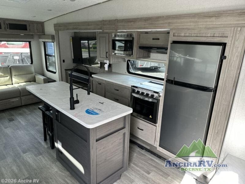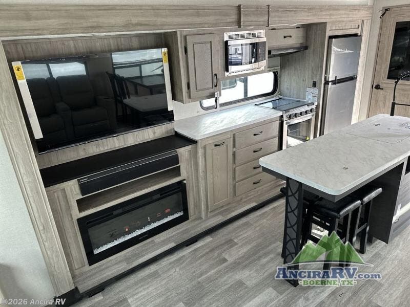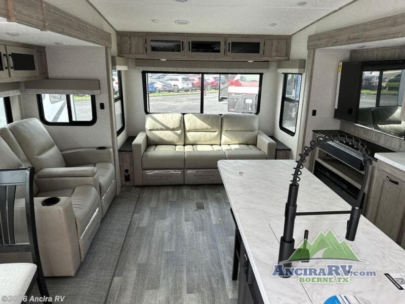 Get ready for a luxurious getaway in this fifth wheel! The rear living area is the perfect place to wind down your nights by relaxing on either the 78" tri-fold hide-a-bed sofa or the theater seating across from the entertainment center. You could even play a few card games at the free-standing table while enjoying snacks that were stored in the pantry. The kitchen island comes with two bar stools so you can have two helpers get dinner ready while you're cooking on the three burner cooktop. The dual entry bathroom is easy for everyone to access and has a radius shower with glass doors to freshen up in, plus it leads directly into the front master suite where you will find a queen bed to lay your head on at night and a wardrobe/linen slide to keep your clothes looking their best!