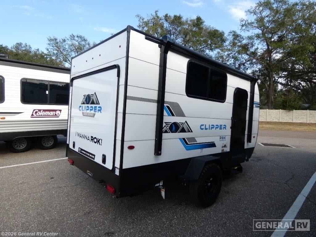 Coachmen Clipper ROK travel trailer 11000ROK highlights: Storage Cabinets Rear Hatch Kitchen Sleeps Two 9' Power Awning Portable Table This travel trailer features a little more interior space since you can move between the two twin beds with storage, and there is a portable table where you can dine together. You'll find an overhead cabinet in the back for your belongings, along with a storage cabinet up front and a wardrobe. The cassette toilet will add even more convenience. The rear hatch kitchen includes a pull-out griddle and grill combo cooktop, a 3.3 cu. ft. 12V refrigerator, and a microwave oven. There is also a hot and cold faucet and multiple overhead storage cabinets for spices, utensils, and more! These Clipper ROK travel trailers allow you to camp anywhere you want, even off the beaten path a bit. Each model features electric brakes, easy lube axles, and 15" off-road heavy duty tires. There are frame-mounted stabilizer jacks to help keep your unit secure, and the outside shower with hot/cold water will come in handy when rinsing off hiking gear. A 5K BTU A/C unit and 20K BTU propane furnace will keep you comfortable as you camp, and there are 12V outlets along with 110V outlets to keep your electronics charged. An optional roof top tent can be added if you're needing additional sleeping space, and if you choose the optional Solar Package with a 200W panel and 30A solar controller, you can enjoy off-grid capabilities!