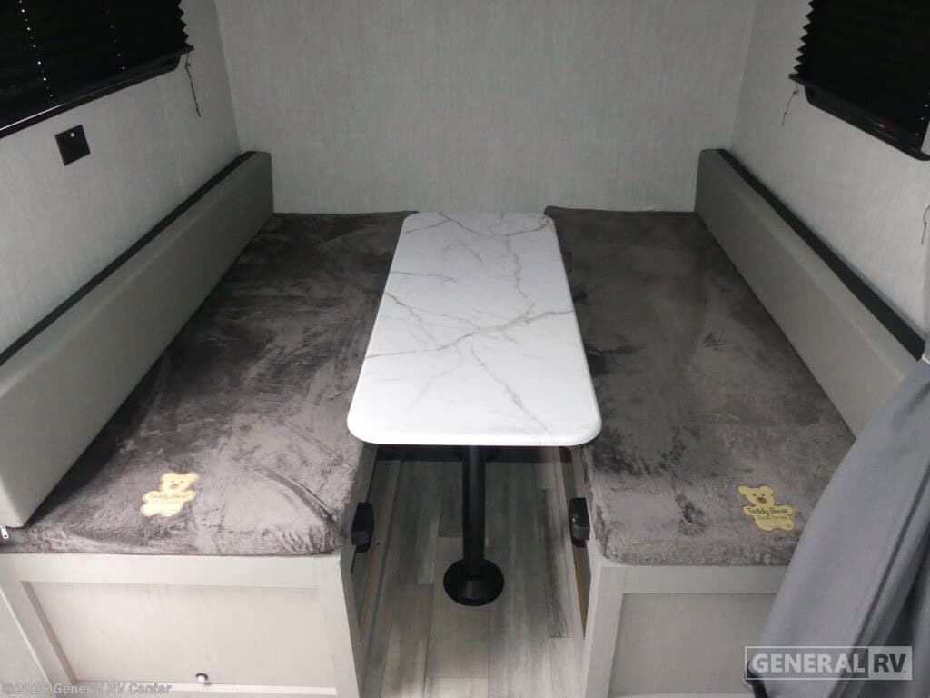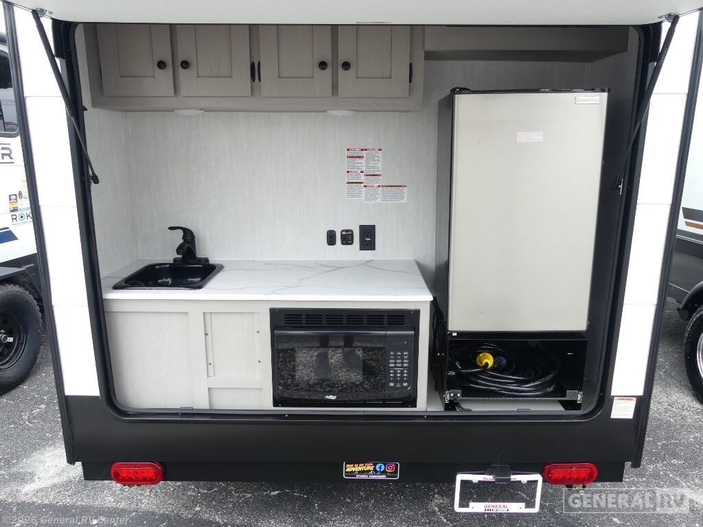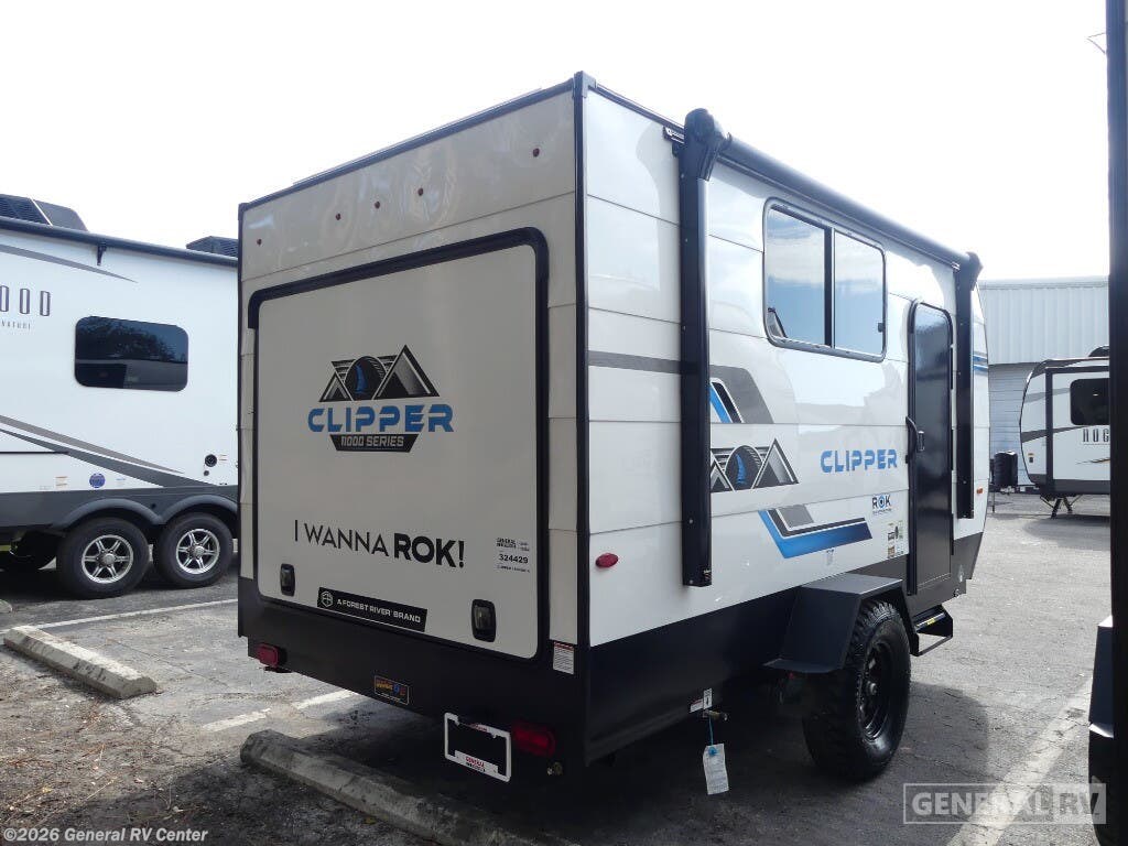 Coachmen Clipper ROK travel trailer 11000ROK highlights: Storage Cabinets Rear Hatch Kitchen Sleeps Two 9' Power Awning Portable Table This travel trailer features a little more interior space since you can move between the two twin beds with storage, and there is a portable table where you can dine together. You'll find an overhead cabinet in the back for your belongings, along with a storage cabinet up front and a wardrobe. The cassette toilet will add even more convenience. The rear hatch kitchen includes a pull-out griddle and grill combo cooktop, a 3.3 cu. ft. 12V refrigerator, and a microwave oven. There is also a hot and cold faucet and multiple overhead storage cabinets for spices, utensils, and more! These Clipper ROK travel trailers allow you to camp anywhere you want, even off the beaten path a bit. Each model features electric brakes, easy lube axles, and 15" off-road heavy duty tires. There are frame-mounted stabilizer jacks to help keep your unit secure, and the outside shower with hot/cold water will come in handy when rinsing off hiking gear. A 5K BTU A/C unit and 20K BTU propane furnace will keep you comfortable as you camp, and there are 12V outlets along with 110V outlets to keep your electronics charged.