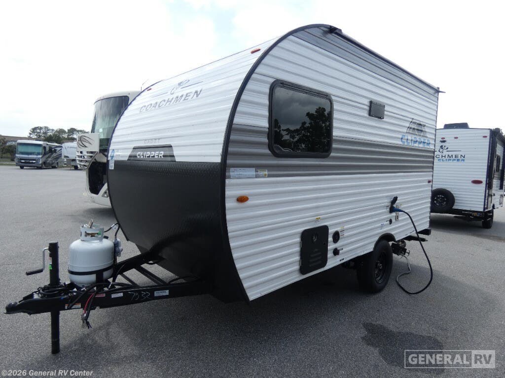 The 2025 Coachmen Clipper Cadet 14CR is a compact yet versatile travel companion designed for those who crave adventure without sacrificing comfort. This charming model offers a clever layout that maximizes space, featuring a center kitchen equipped with a two-burner cooktop and a compact refrigerator that runs on both electric and propane. Whether you're preparing a quick meal or a gourmet dinner, you'll find cooking a breeze in this well-organized space. At the front, the living area invites relaxation with its convertible sofa and dinette, both of which transform into cozy sleeping spaces, accommodating up to four people. The rear bath, complete with a curtain shower, ensures convenience and privacy. With a powered retractable awning, you can easily extend your living space outdoors, perfect for enjoying the scenery or hosting friends. Lightweight yet sturdy, the Clipper Cadet 14CR is ready to take you on unforgettable journeys. For more details or to see this model in person, visit your nearest General RV dealership.