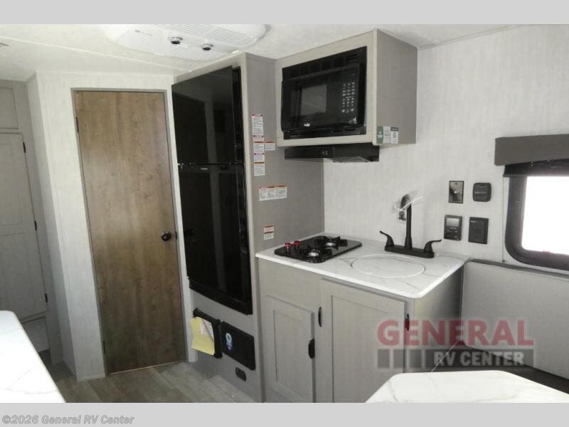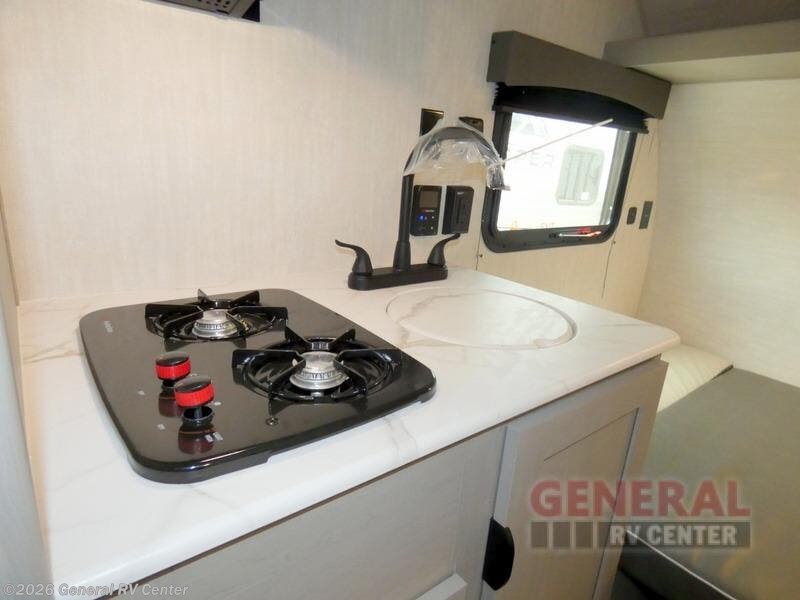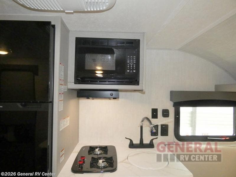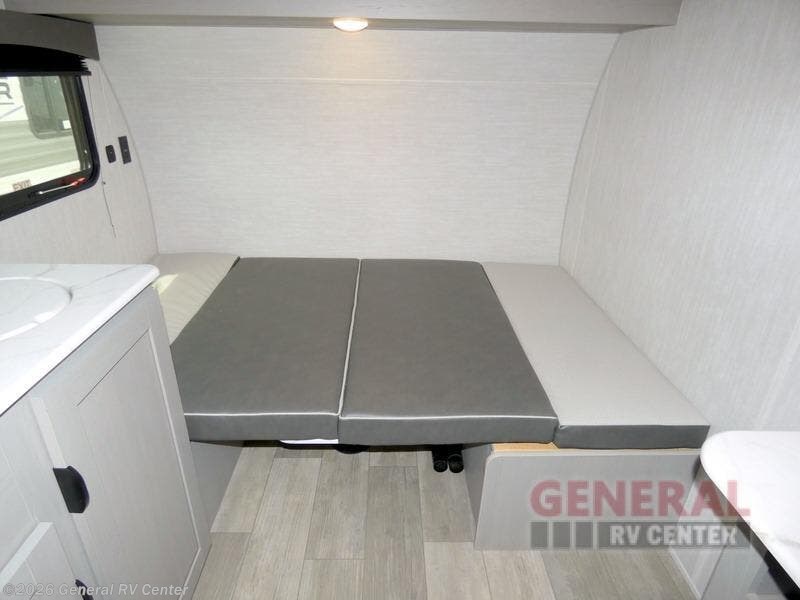 Tired of tent camping and sleeping on the ground? This lightweight travel trailer can accommodate you nicely with a dry and comfortable place to stay while enjoying nature. Inside, you will find a booth dinette for plenty of space to sit and stretch your legs, or enjoy a meal. The booth dinette easily converts to sleeping space at night. You might also enjoy your morning breakfast or coffee at the bar top with two stools. A 24" x 36" shower and toilet provide a convenience to your camping trips, no late nights running to the campground bathroom in the dark. And, the kitchen features a two burner cooktop and refrigerator so you can cook inside when you'd rather not deal with campfire smoke over an open fire. There is also plenty of storage for your things between the overhead cabinets and shelves, wardrobe/pantry near the door, and within exterior storage as well.