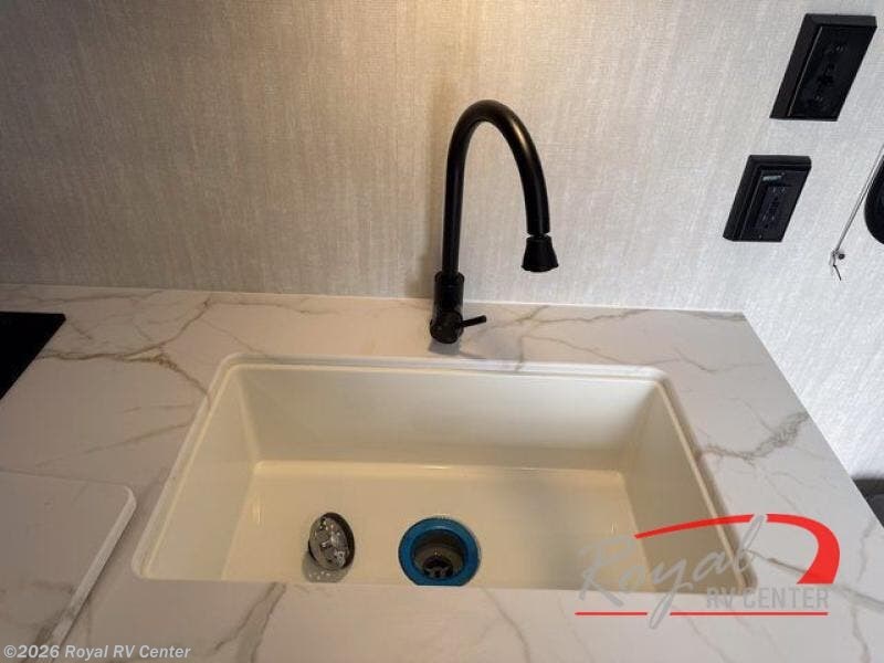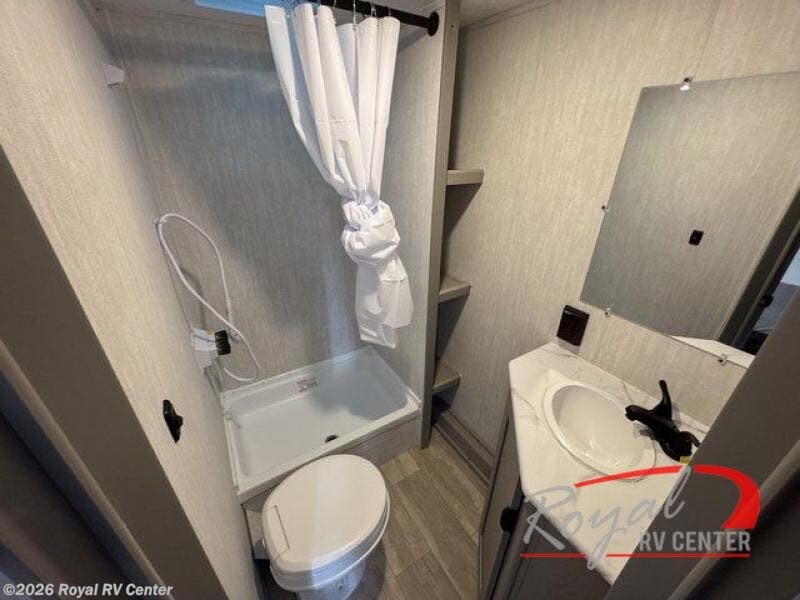 The rear corner bathroom includes a 24" x 36" shower, toilet, vanity, and linen storage, so you can stay clean and comfortable wherever you camp.
