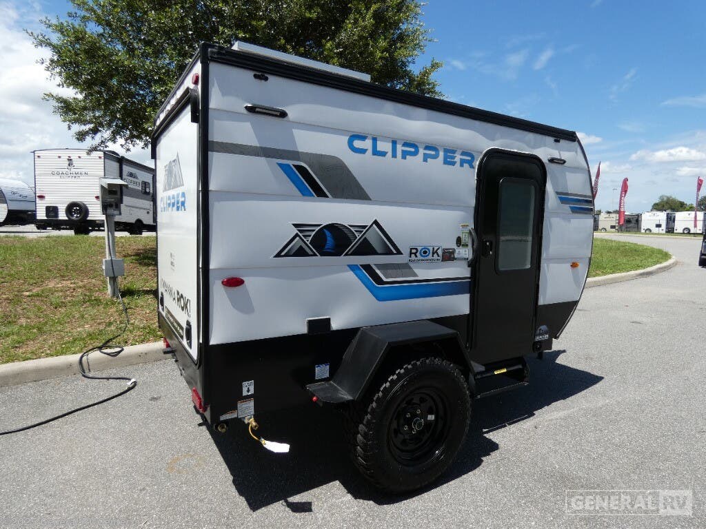 Coachmen Clipper ROK 8000ROK Teardrop Trailer Highlights - 54" x 72" Flip-Up Bed - Rear Hatch Kitchen - 7' Bag Awning - 15" Off-Road Tires - Under 1,800 lbs. The 2025 Coachmen Clipper ROK 8000ROK is a compact, off-road-ready teardrop trailer designed for adventurers seeking simplicity and functionality. Measuring just over 12 feet in length and weighing approximately 1,724 lbs, it's easily towable by a variety of vehicles. Inside, you'll find a 54" x 72" flip-up bed with storage beneath, along with a portable table for dining or workspace needs. The interior also features overhead cabinetry, a 5,000 BTU A/C unit, a 20,000 BTU propane furnace, and multiple power outlets to keep your devices charged. The rear hatch opens to a well-equipped camp kitchen, including a pull-out cooktop, a 3.3 cu. ft. 12V refrigerator, hot and cold faucet, and overhead storage. Built for off-road adventures, the 8000ROK comes with 15" off-road heavy-duty tires, electric brakes, easy lube axles, and frame-mounted stabilizer jacks. Additional features include a 7' bag awning, outside shower with hot/cold water, LP quick connect, and various power outlets to keep your devices charged. Optional upgrades like a 200W solar package with a 30 Amp controller, spare tire and carrier, and a roof-top tent are available for those looking to enhance their off-grid experience.