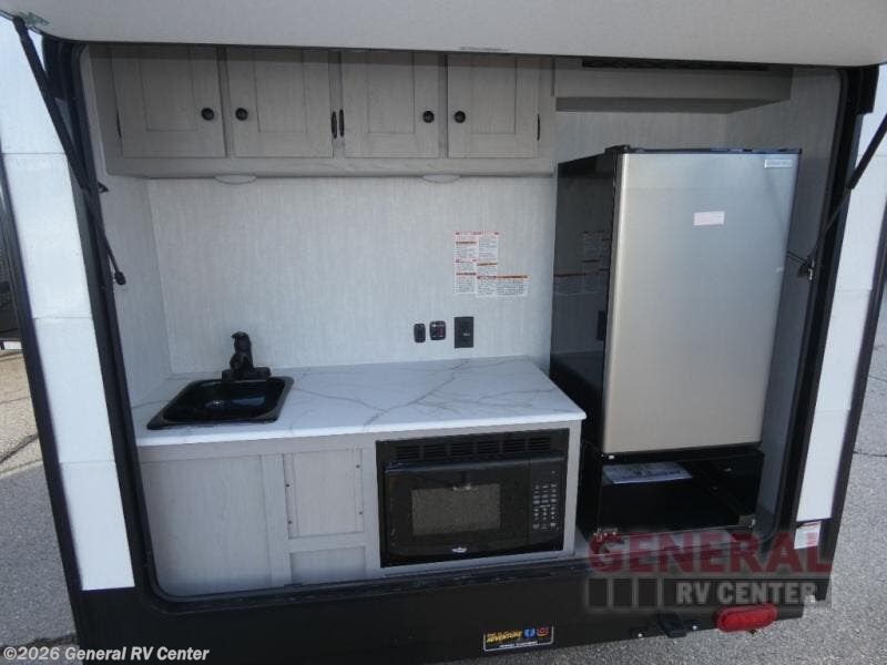 This teardrop trailer features a little more interior space since you can move between the two twin beds with storage, and there is a portable table where you can dine together. You'll find an overhead cabinet in the back for your belongings, along with a storage cabinet up front and a wardrobe. The cassette toilet will add even more convenience. The rear hatch kitchen includes a pull-out griddle and grill combo cooktop, a 3.3 cu. ft. 12V refrigerator, and a microwave oven. There is also a hot and cold faucet and multiple overhead storage cabinets for spices, utensils, and more!