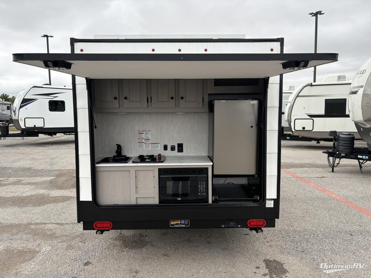 When you want to explore choose this travel trailer for your basic off-road adventure needs and a bit more by offering you a 54" X 74" flip-up bed with storage beneath, and gaucho seating that pulls out into a bed for an additional camper at night. There is front and rear overhead cabinetry for storage, and a cassette toilet for added convenience especially at night. A rear hatch camp kitchen provides a place for you to create meals and snacks while you explore. There is a slide-out griddle and grill combo cooktop, a 3.3 cu. ft. 12-volt refrigerator for your cold items, a single sink, and two burner cooktop, plus a microwave oven. A 9' power awning creates a bit of added outdoor living space where you can set up your camp chairs. You can also add an optional roof-top tent for additional sleeping.