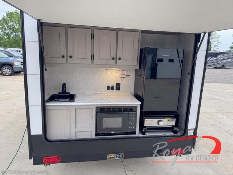 When you want to explore choose this travel trailer for your basic off-road adventure needs and a bit more by offering you a 54" X 74" flip-up bed with storage beneath, and gaucho seating that pulls out into a bed for an additional camper at night. There is front and rear overhead cabinetry for storage, and a cassette toilet for added convenience especially at night. A rear hatch camp kitchen provides a place for you to create meals and snacks while you explore. There is a slide-out griddle and grill combo cooktop, a 3.3 cu. ft. 12-volt refrigerator for your cold items, a single sink, and two burner cooktop, plus a microwave oven. A 9' power awning creates a bit of added outdoor living space where you can set up your camp chairs. You can also add an optional roof-top tent for additional sleeping.