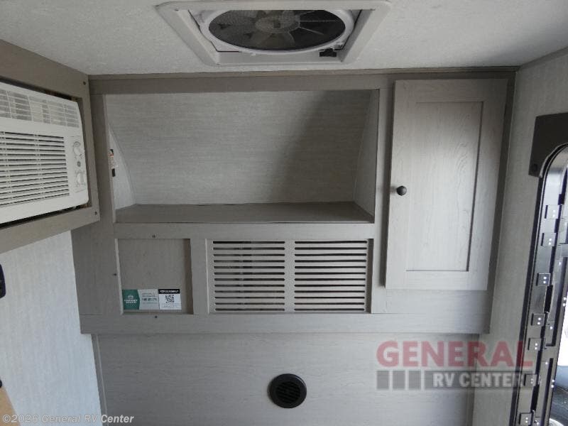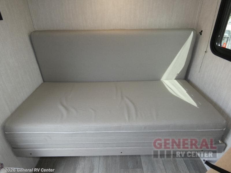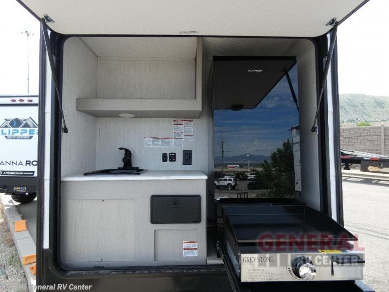 This travel trailer features a little more interior space since there is a flip-up bench seat that folds down to a 54" x 72" bed, and the portable table provides a place to dine together. You'll also find a storage cabinet, a 20K furnace and an A/C cabinet to keep you comfortable. The rear hatch kitchen includes a slide-out griddle to cook meals plus a 3.3 cu. ft. 12V refrigerator and cabinet for food storage.