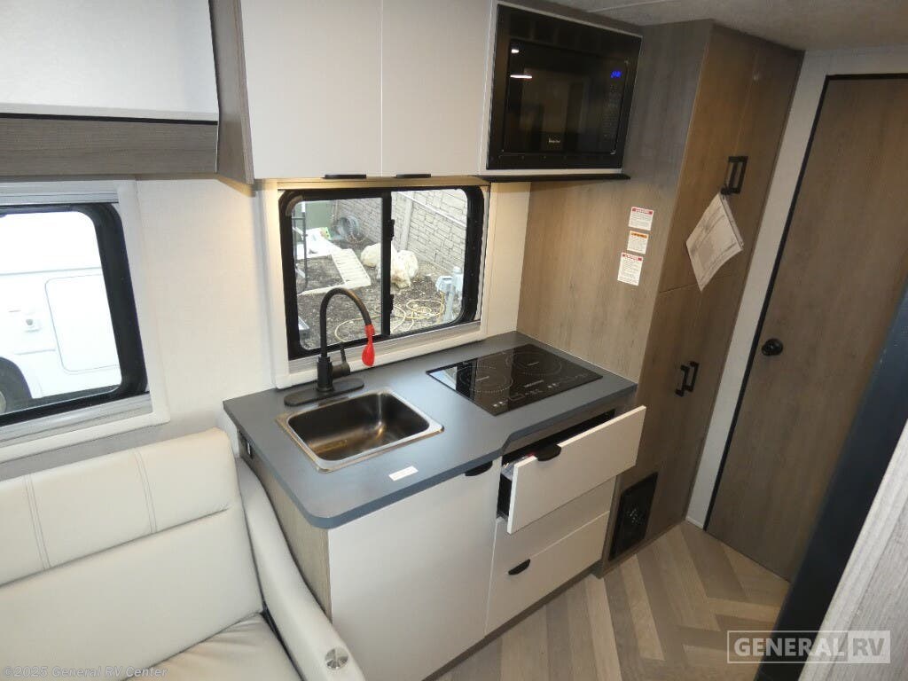 Experience the open road like never before with the 2025 Coachmen Cross Trail EV 20BH. This innovative RV combines modern comfort with eco-friendly technology, making it perfect for the adventurous family. With its sleek 24-foot design, this RV is built on a reliable Ford Transit chassis powered by a robust EcoBoost V6 engine, delivering 310 horsepower and 400 lb-ft of torque. The compact yet spacious interior is ingeniously designed to maximize every inch of space, offering comfortable sleeping arrangements for up to four people, including versatile Murphy bunk beds and convertible sofas. Inside, you'll find a well-appointed center kitchen equipped with a two-burner induction cooktop and a convection microwave, perfect for preparing your favorite meals on the go. The rear bath features a convenient 24x24 shower, providing a touch of luxury after a day of exploration. Enjoy the great outdoors under the 14-foot powered retractable awning, perfect for relaxing in the shade or dining al fresco. With a generous fresh water capacity of 25 gallons and ample storage, this RV is ready for your next adventure. Visit your nearest General RV dealership to explore this remarkable model in person and start your journey today.