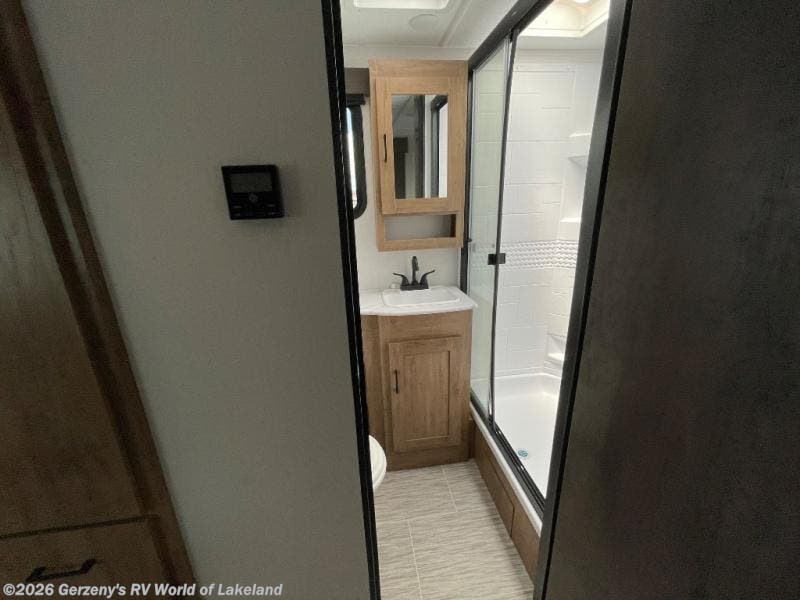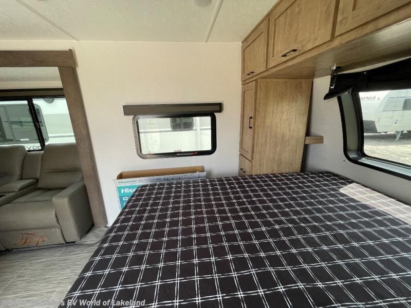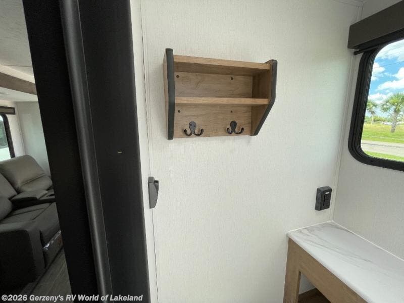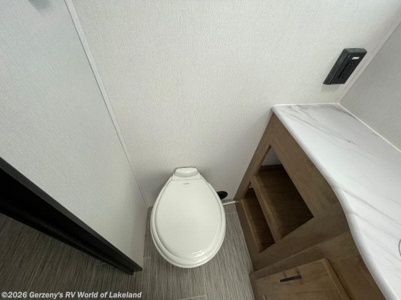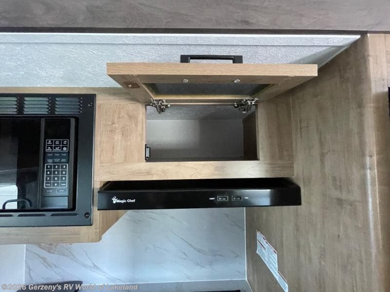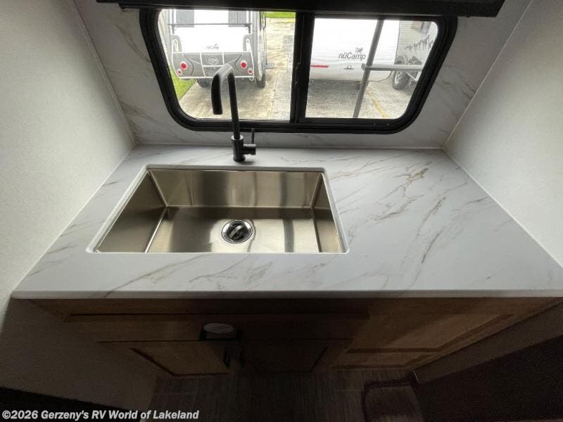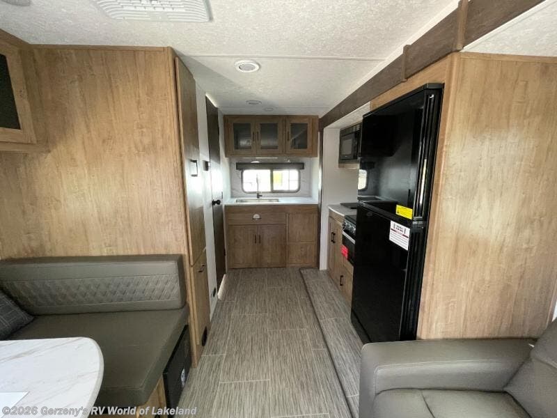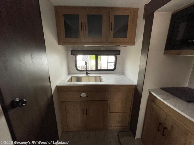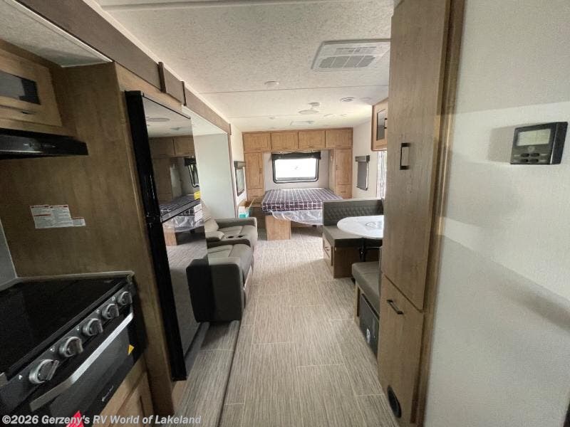 This trailer provides the perfect blend of utility and comfort. You will enjoy your own queen bed up front that includes vaulted under-bed storage for your luggage. A pair of theater seats provides a great spot to watch the flatscreen smart TV, and you can enjoy meals at the U-dinette. The chef will enjoy the well-equipped kitchen which includes a three burner cooktop, microwave, and stainless steel sink. Additional storage can be found in the overhead consoles plus a pantry/wardrobe closet.